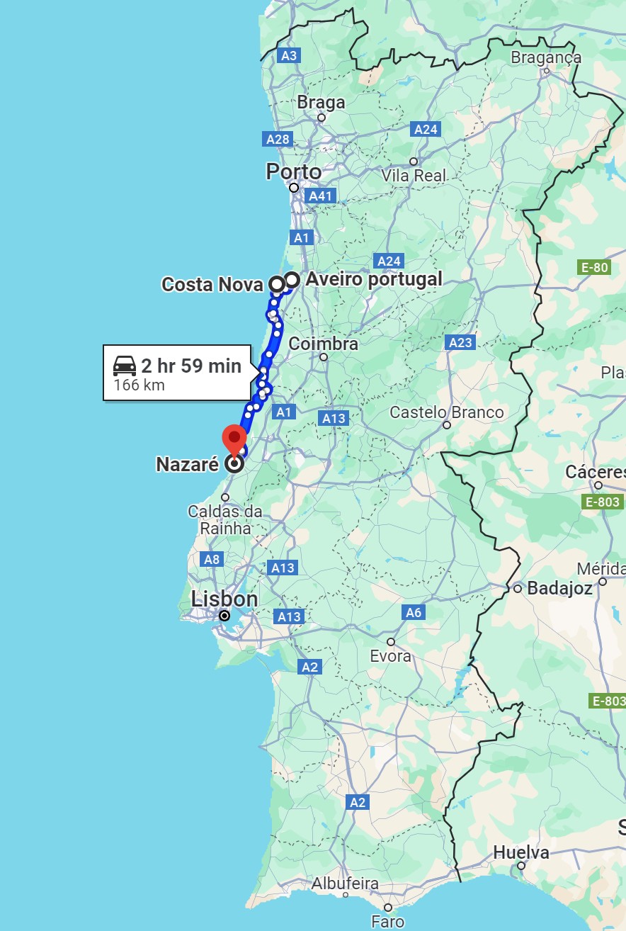Next on the agenda was to drive to the city of Nazare where our next AirBnB is located. The GPS wanted to take us via the freeway but we wanted to drive along the coast. It took a minute but we got it reprogrammed to avoid the highway. It was going to take an hour longer than the highway, but we didn’t mind as we find it interesting to drive through the small towns and see the “real” Portugal and for the opportunity to stop at any beaches along the way. The total estimated length of time going this route was 2 1/2 hours. It took us a couple of tries before we got going in the right direction but we got there.