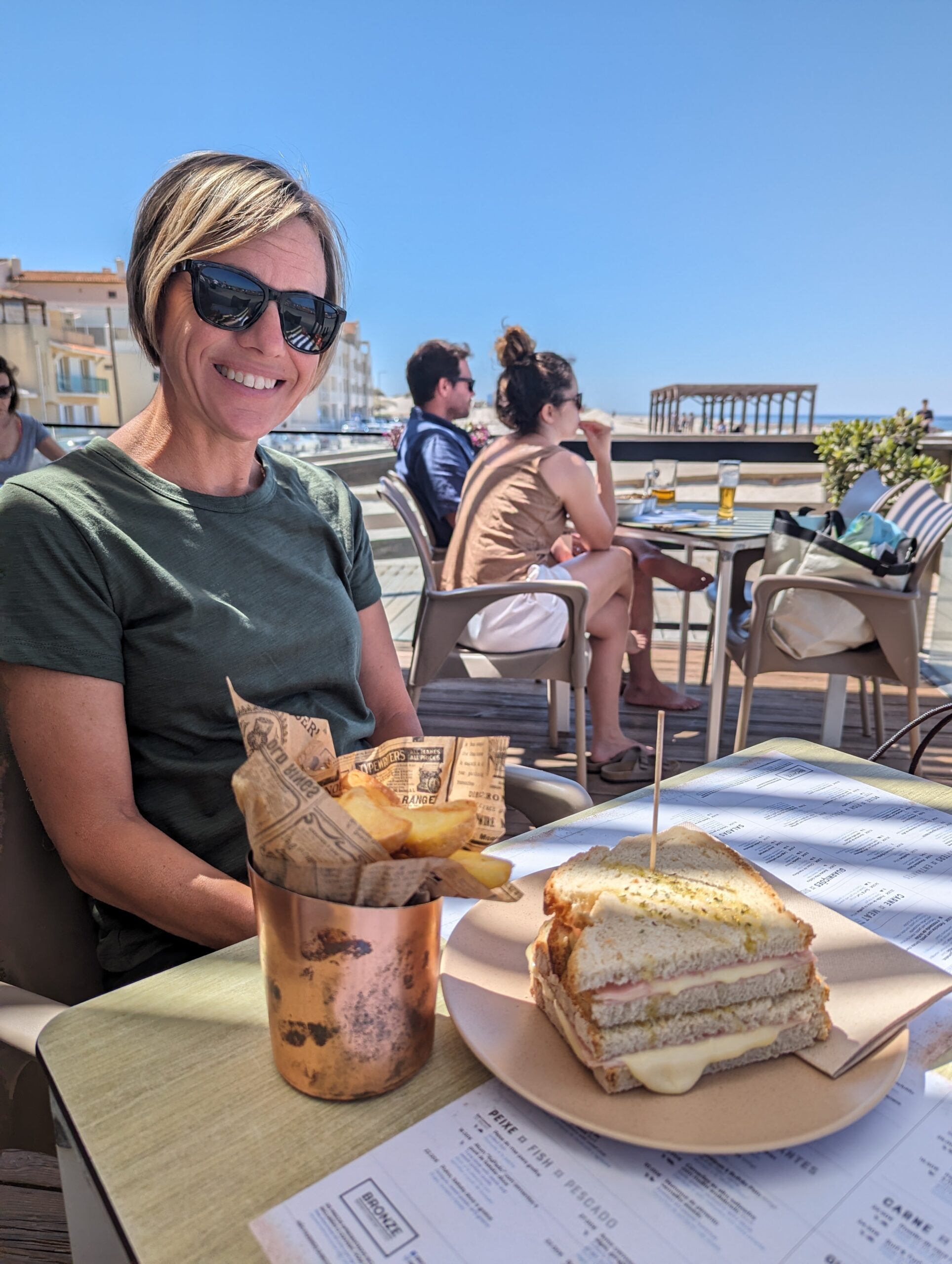 We got to the restaurant and was seated at a table with a good view of the ocean. The waiter informed us that the kitchen didn’t open until Noon but we could order drinks and wait. Since it was about 11:15 we did just that. I had a strawberry lime juice and Tom had a pineapple basil juice. Tom suggested I could go walk the beach while we waited for the kitchen to open, but I felt too relaxed and was enjoying my juice. Instead I researched if there were any geocaches in the area and when I found one .25 miles away I decided I would wait to do my walk on the beach until after lunch and combine the beach walk with the geocache search. We had placed our food order with our drink order so our food came out almost right at Noon. Tom and I shared a ham and cheese sandwich with a side of fries. The sandwich was a perfect sharing size and the fries were deliciously hot, fresh, and salty.