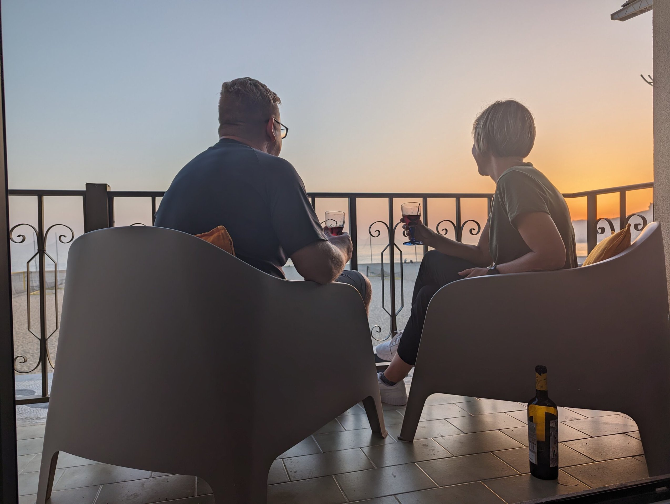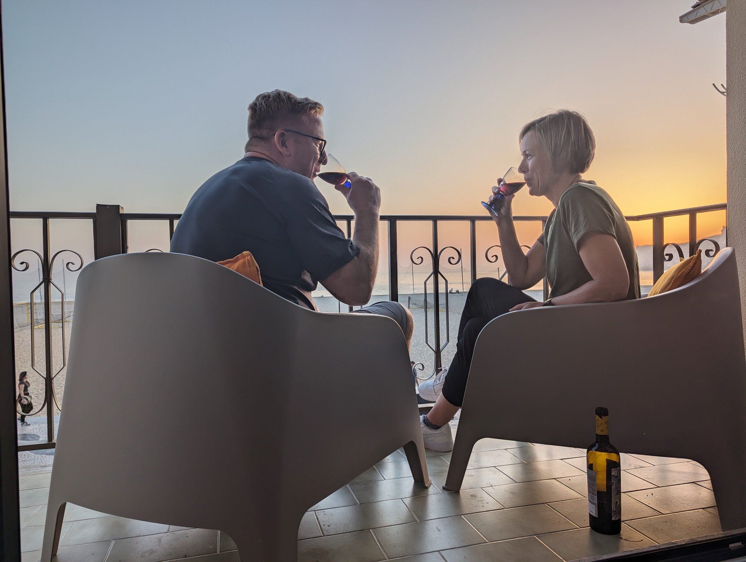 Having gotten settled in we set back out to head to the little supermarket we had passed on the way to the AirBnB to pick up some beverages. Since we have such a nice balcony that overlooks where the sun sets we thought it would be nice to enjoy a couple of beverages on the balcony watching the sunset. I picked up a bottle of wine and Tom a Non-A Pear Somersby and an Apple Somersby. We took them back to the Airbnb and set back out to scope out restaurants for dinner. Our plan was to get a place picked out and then head back for the sunset, and then eat dinner after sunset.