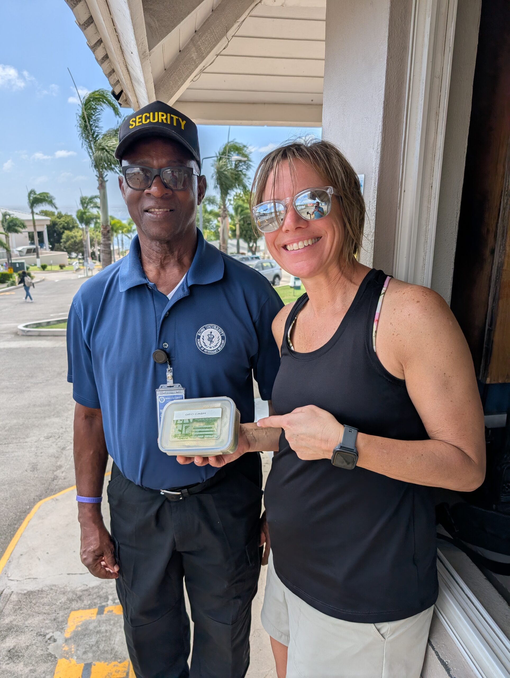 Our plan for the day was to drive around the island. We went clockwise and we were soon driving by the veterinary school that we had been to yesterday for the geocache. Tom asked me if we wanted to stop and try again. Since it’s easy parking and it was on the way I said sure why not. Good thing we did. A different guard was working today and he knew exactly what I was talking about when I asked for the geocache. He went right to a cabinet and pulled it out. I had thought about asking the other guards to check the cabinets yesterday, but I didn’t want to tell them how to do their job. I signed the log, dropped a Travel Bug, and Tom snapped a picture before we were back on our way.