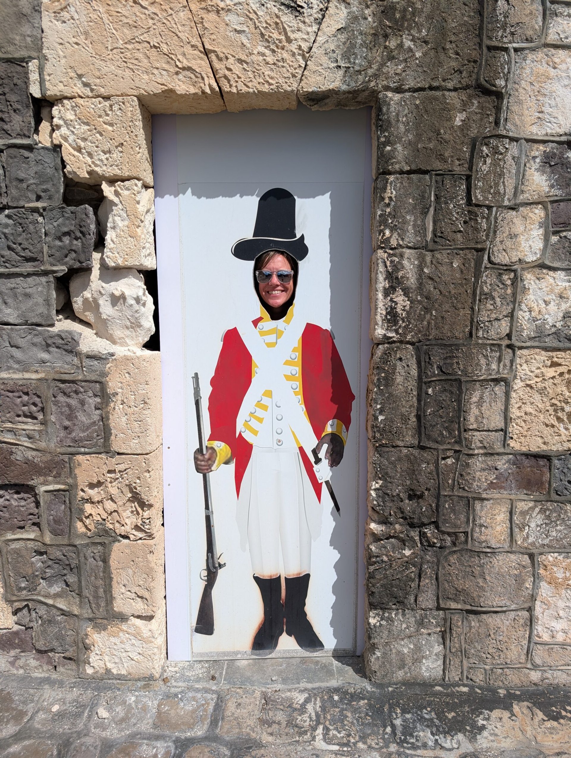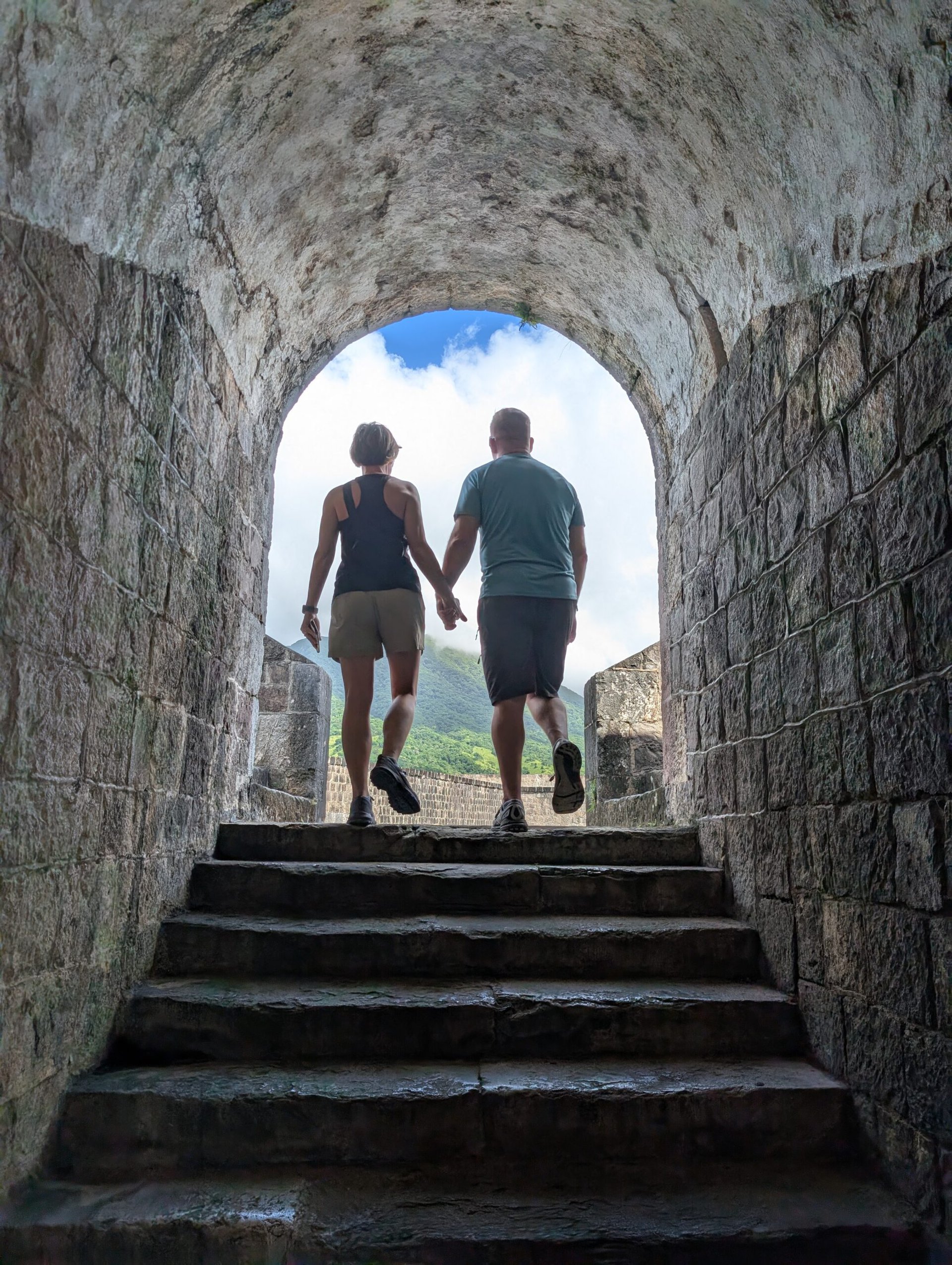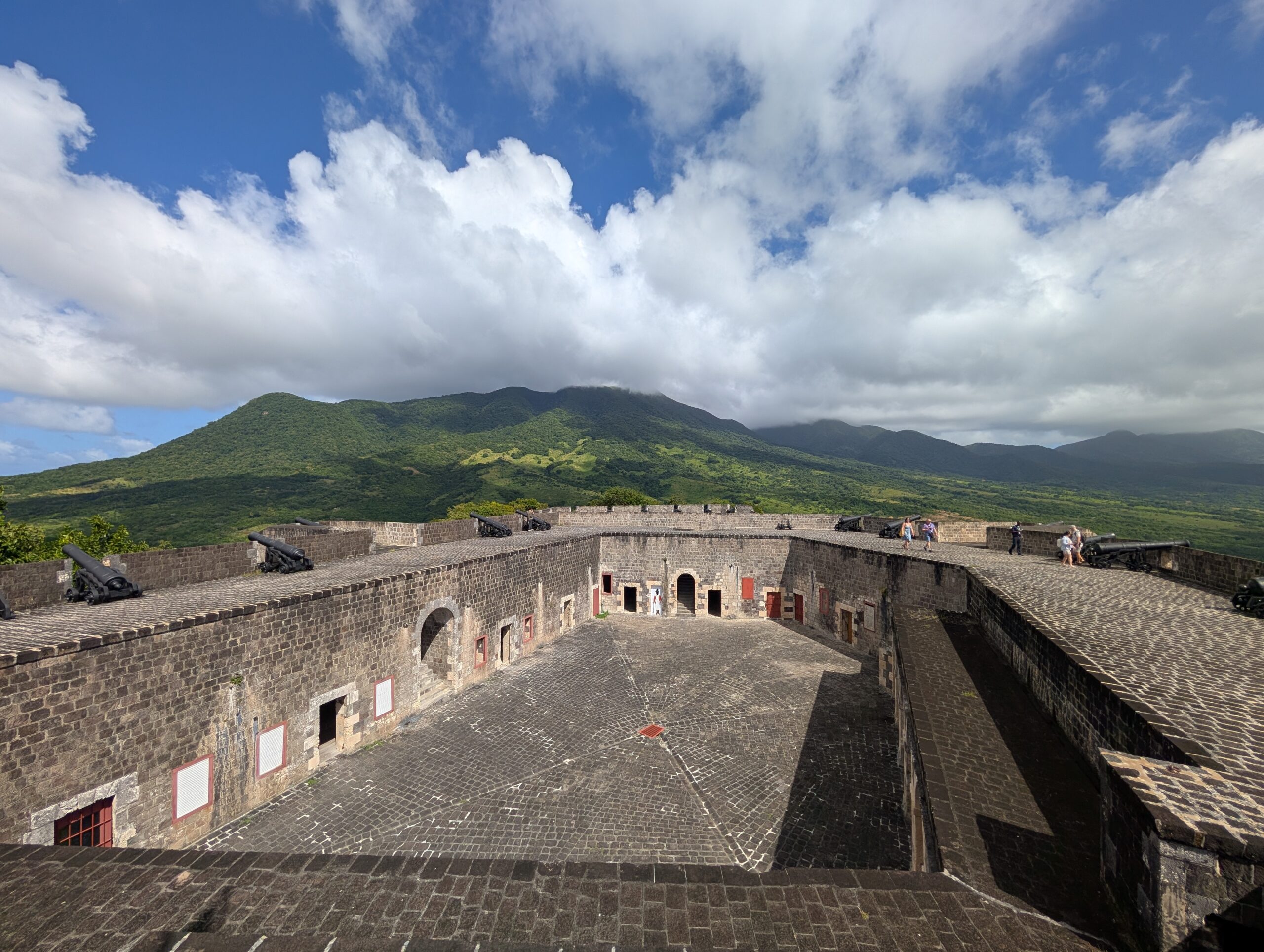 Next stop was the Brimstone Hill Fortress National Park. This was quite an impressive fort high up on the hill that the British designed and African slaves built. We enjoyed walking around the fort, reading about it’s history, and taking a bunch of pictures. There was a multi-cache at this location as well. I found the gravestone for the first waypoint that was to give me the coordinates to the final cache, but admittedly I got lazy when I read the hint and it said that the cache was near the gift shop air conditioner and you could ask someone in the gift shop for help. I looked all around the air conditioner thinking the air conditioner was the target, but didn’t find anything. There weren’t many people left wandering the fort since all the tour groups had left so it was a good time for me to ask the worker in the souvenir shop. He knew exactly what I was talking about and instead of giving me a hint, he took me to the cache itself. It was a tiny nano on the hinge of a window frame that was near the air conditioner. I never looked there, but it was a well placed cache. After I was done signing the log I went back into the shop and had a nice conversation with the man, Philip. I learned that he was originally from England but moved here 25 years ago, and he hasn’t left the island in 18 years. He also told us all about the tourists from the cruise ships and which cultures tend to buy more and which are more tight with their money. No surprise that Americans buy more. He said the tightest group are Germans. I bought a couple of things (including a locally made Christmas ornament) and we went on our way to explore the rest of the grounds.