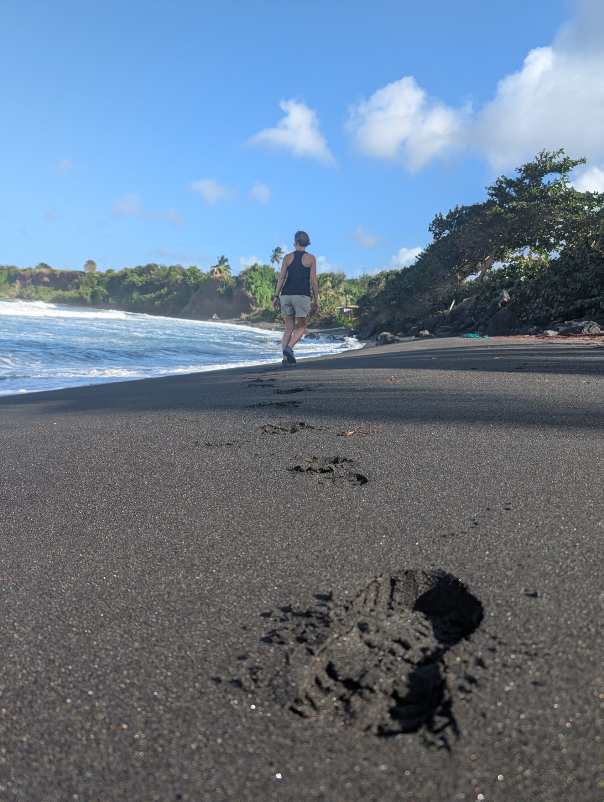 As we drove around the island we found a nice little black sand beach where I could pull off the road. We walked the beach and I picked up little pieces of sea glass along the way. Tom played around with taking some pictures and got his shoes and socks all wet when an incoming wave got him.