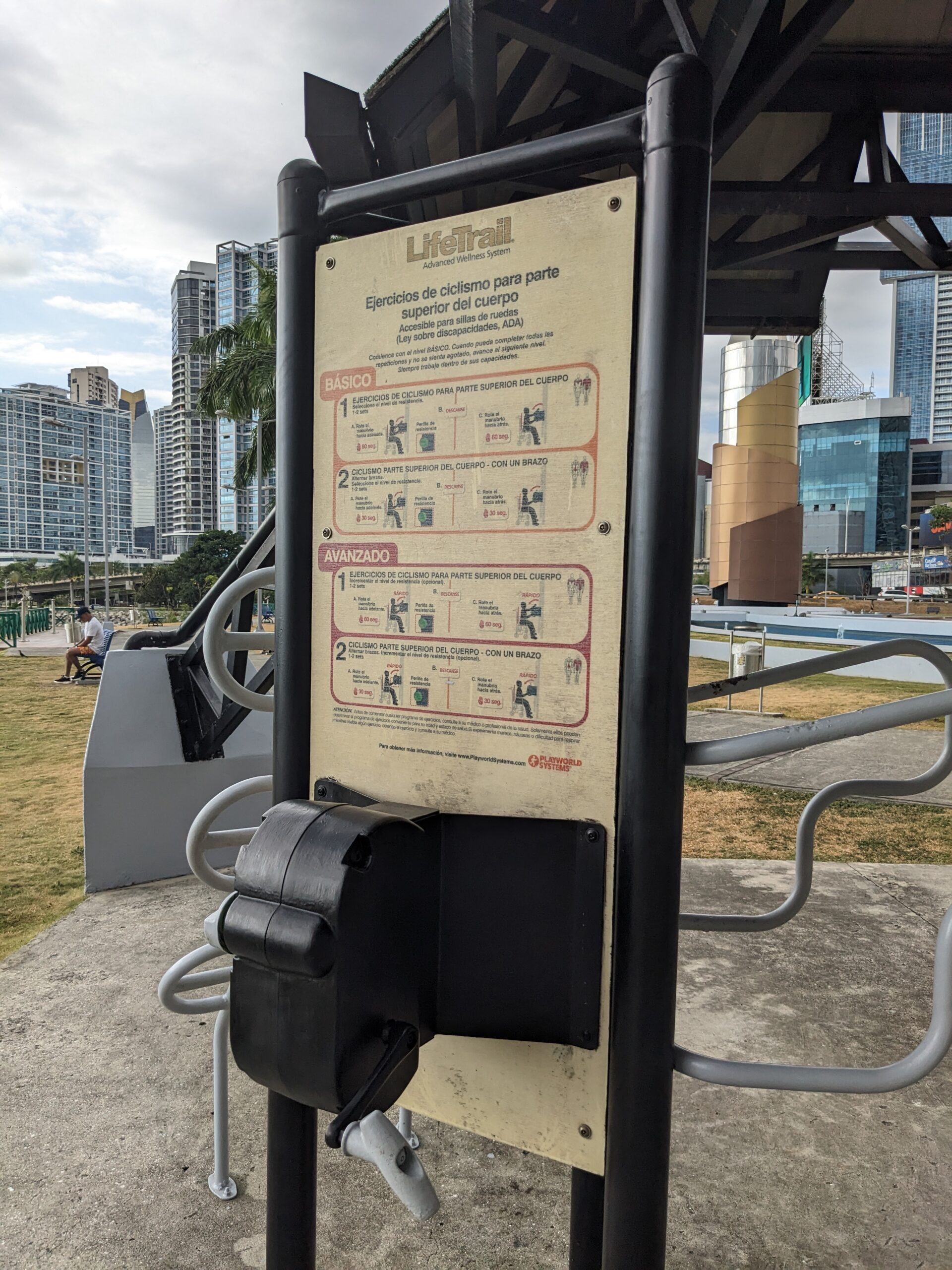 Next up was a cache in a park at the end of the Cinta Costera in an outdoor gym. Thankful for the hint, I made the find here as well.