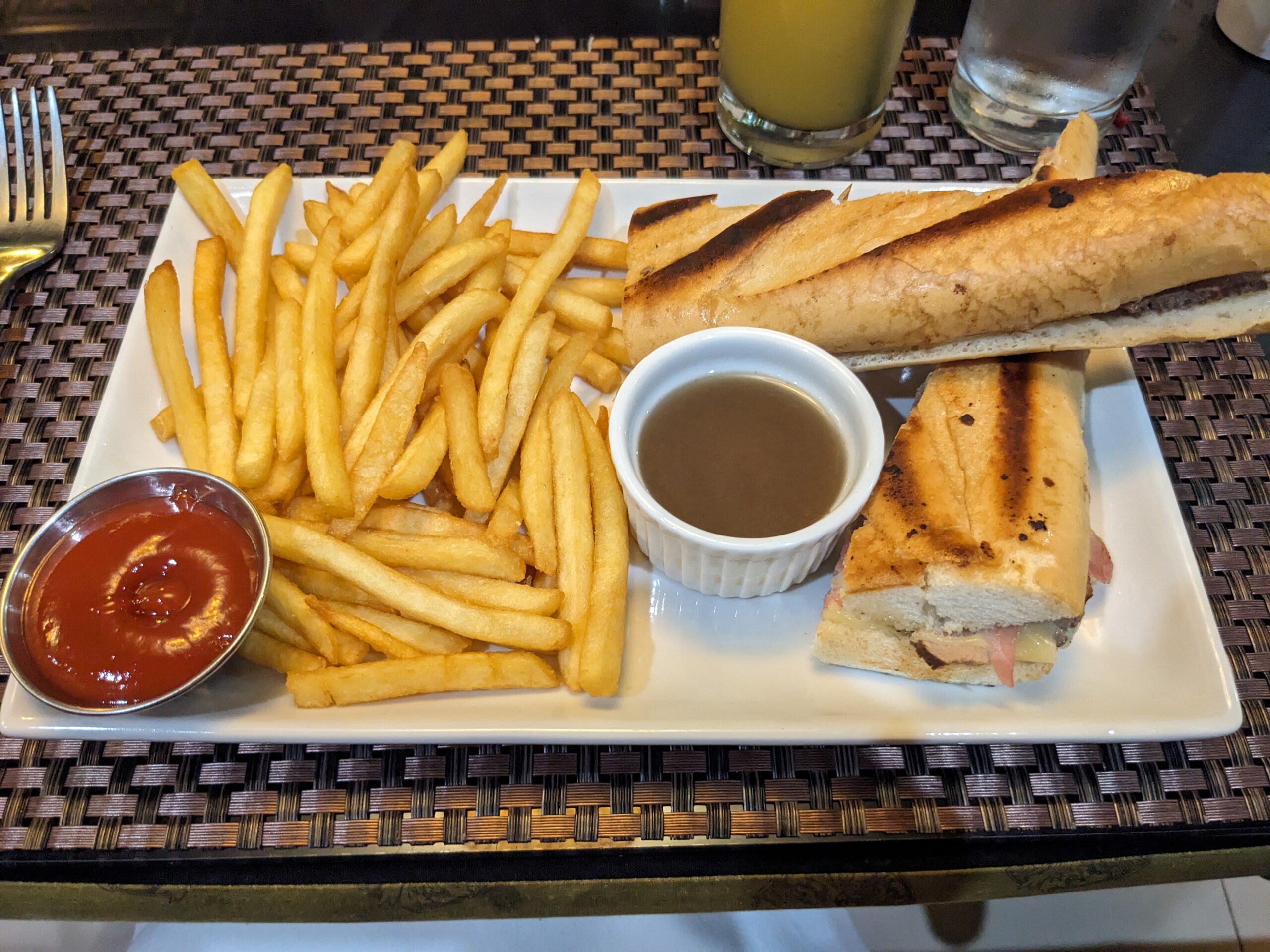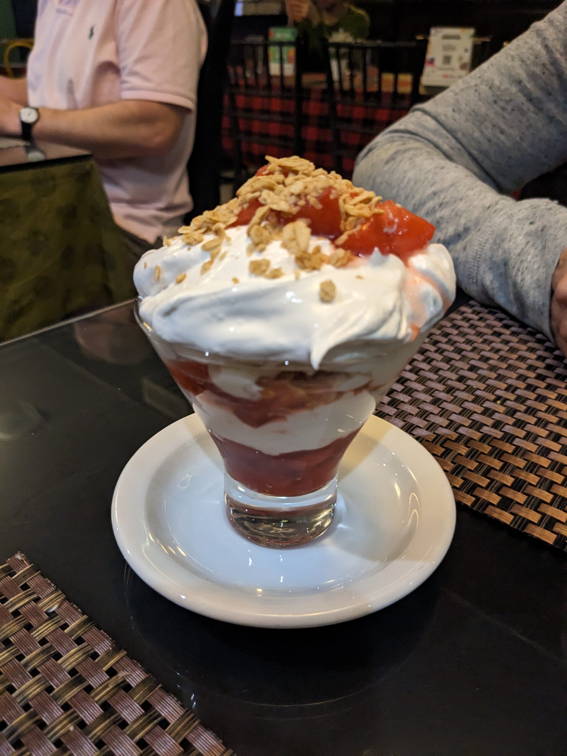 After that find it was after 5:00 and time for me to get back to the apartment. I found Pete, Laurie, and Linda playing Swoop. They hadn’t eaten dinner yet, but Pete and Laurie had a big lunch so they were not hungry. Linda and I Googled some places to eat and checked out their menus and decided on a place called “The Wallace”, a Scottish restaurant (https://thewallacepanama.com/). We had a Scottish Egg for an appetizer (Linda had never had one before. She thought it was good) and I had the Roast Beef Panini. It was excellent! We splurged and got a dessert called Cranachan (Strawberries macerated in whiskey, granola, artisanal vanilla ice cream, and whiskey cream). It was a good ending to the meal.