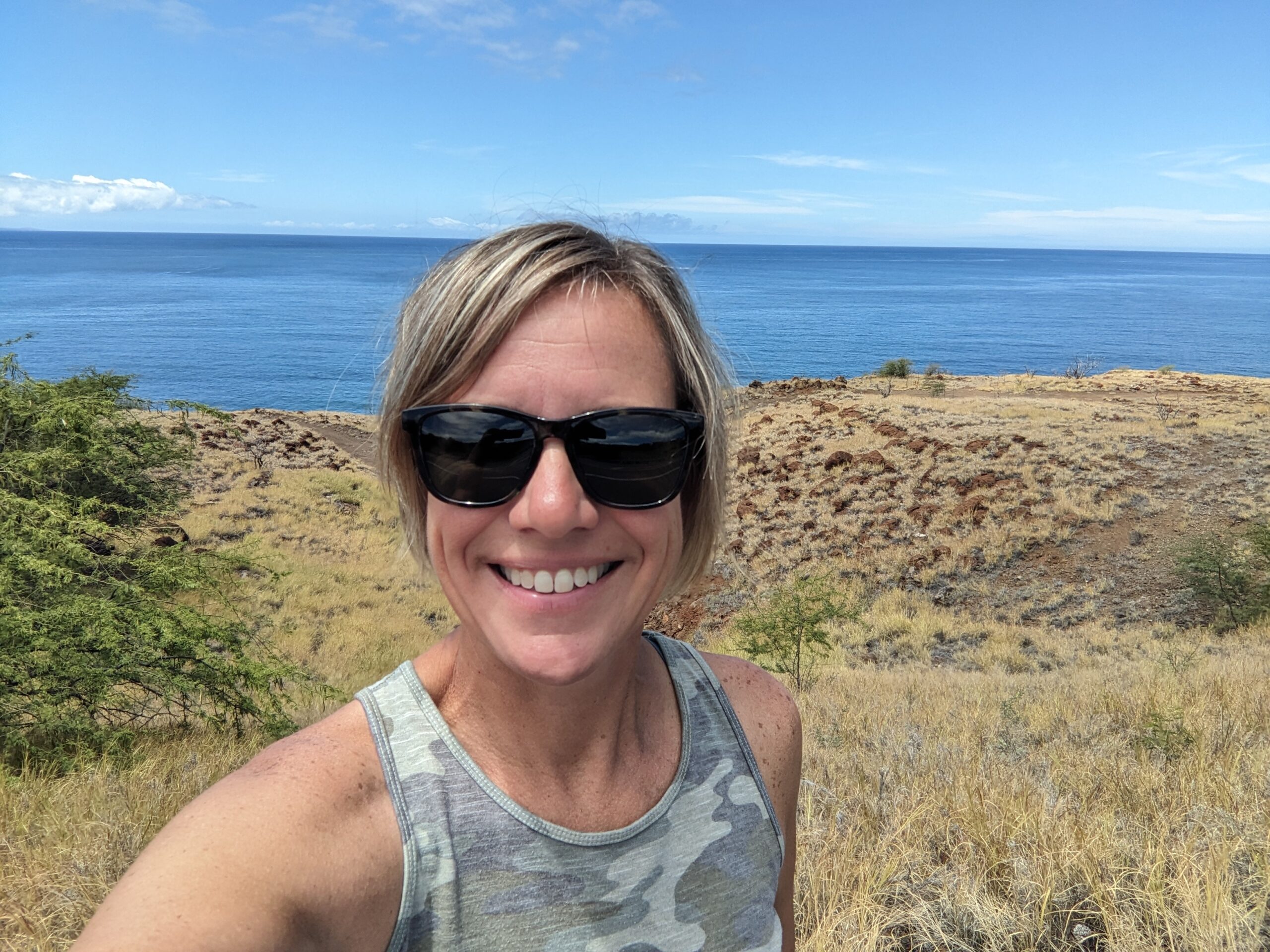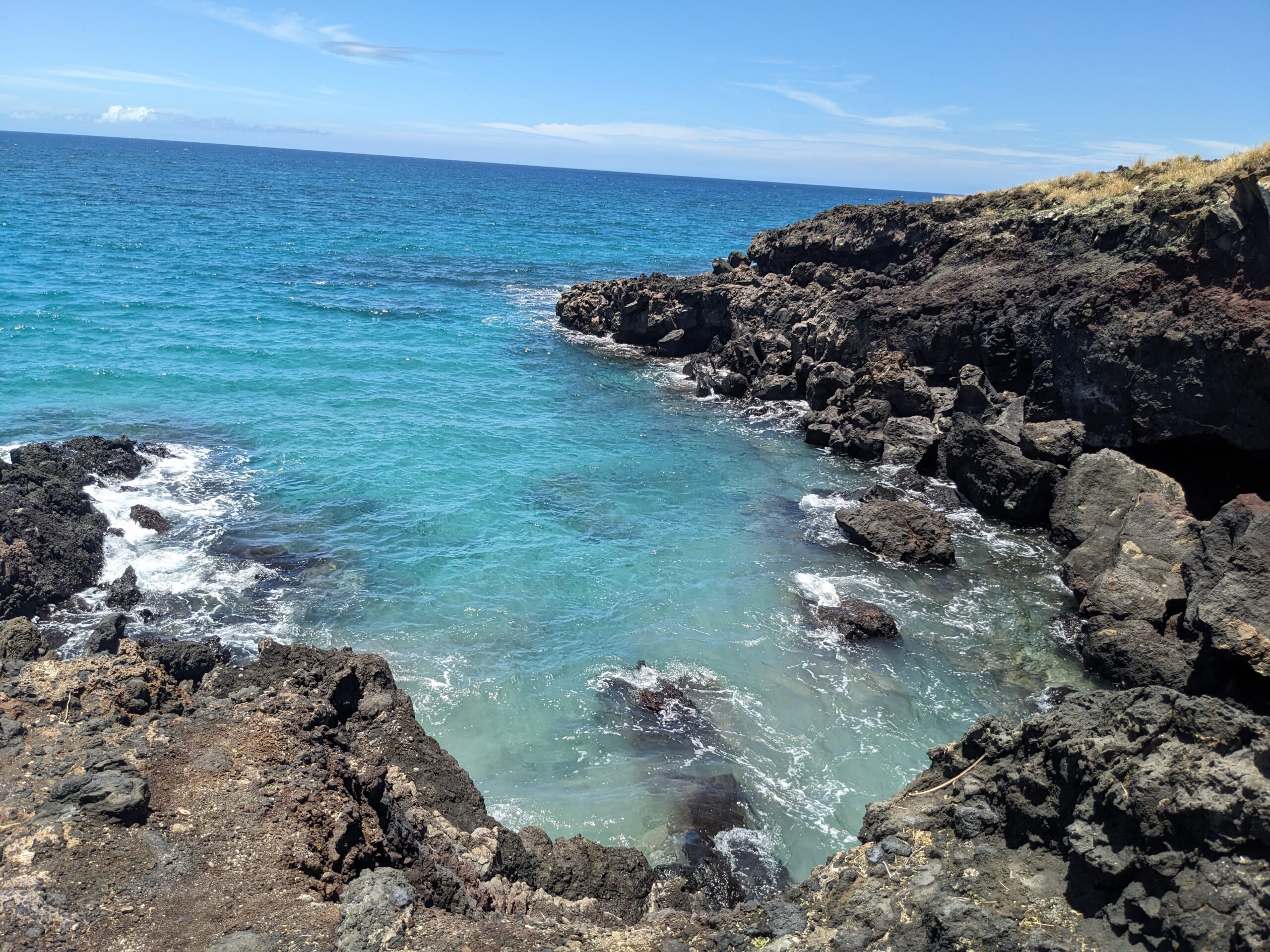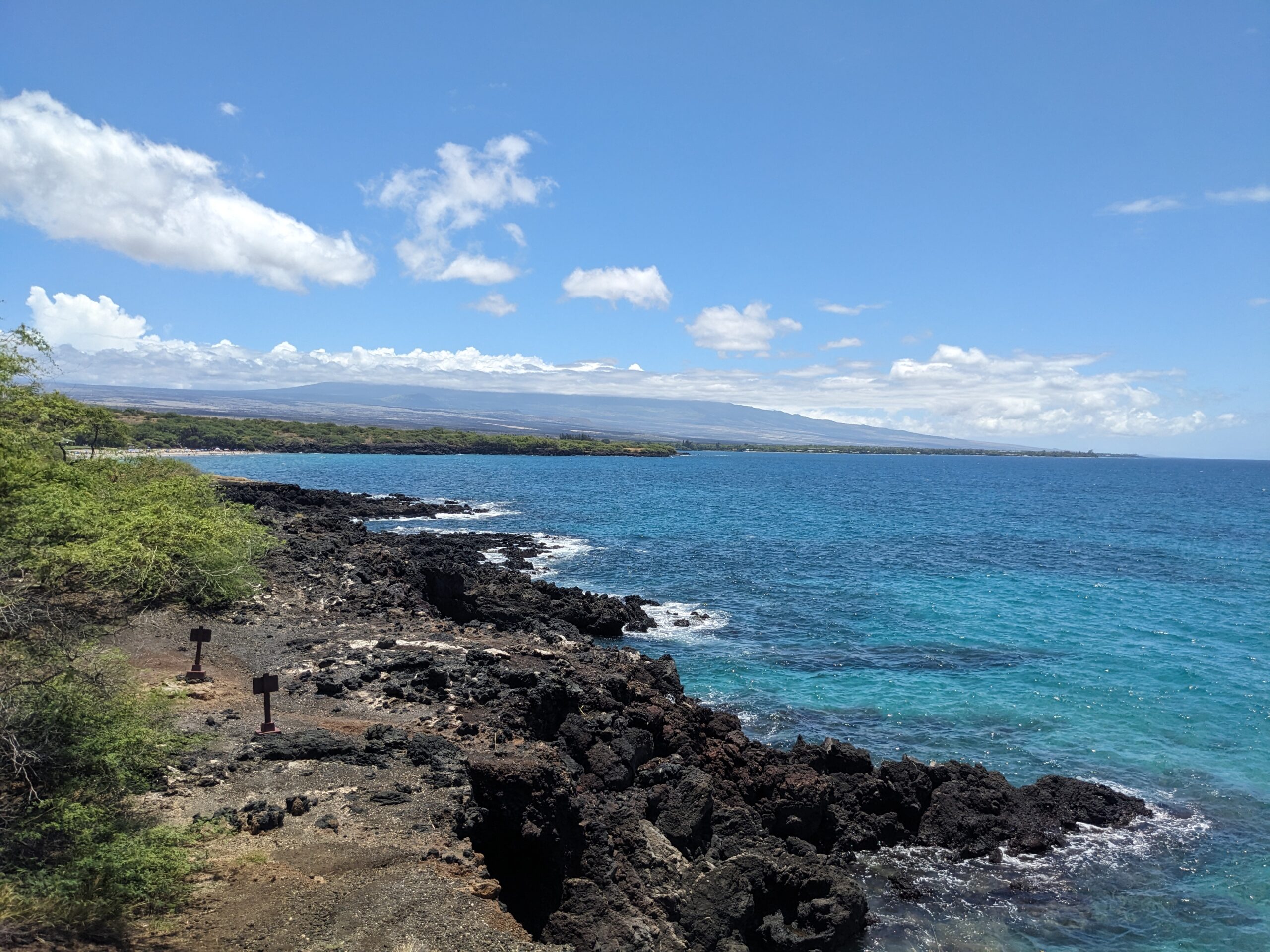 Upon leaving the store, our next stops were all in the quest of geocaching and beach walking. I picked up two easy guardrail caches before we made our way to Hapuna Beach State Park. It cost $10 for the car and $5/person but I had read on the internet (so it must be true) that it was ranked the #1 beach in America. The beach is just a half mile long but is the biggest white sand beach on the island. Uncle Andy found a nice covered picnic table to sit at with a great view of the ocean while I took my stroll. It didn’t take long to walk to the beach, but there was a trail that continued up off the beach along the ocean that I followed. There were a couple of geocaches along this route. I stopped and searched for the first one but couldn’t come up with the find and moved on to the second. Here I had success. I thought about continuing to the third, but didn’t want to keep Uncle Andy waiting too long so I turned around and headed back. The views along the trail were beautiful and the trail was dirt which was nicer than the lava rock trails I had been walking. I walked the length of the beach back before I headed back up to relax in the shade with Uncle Andy.