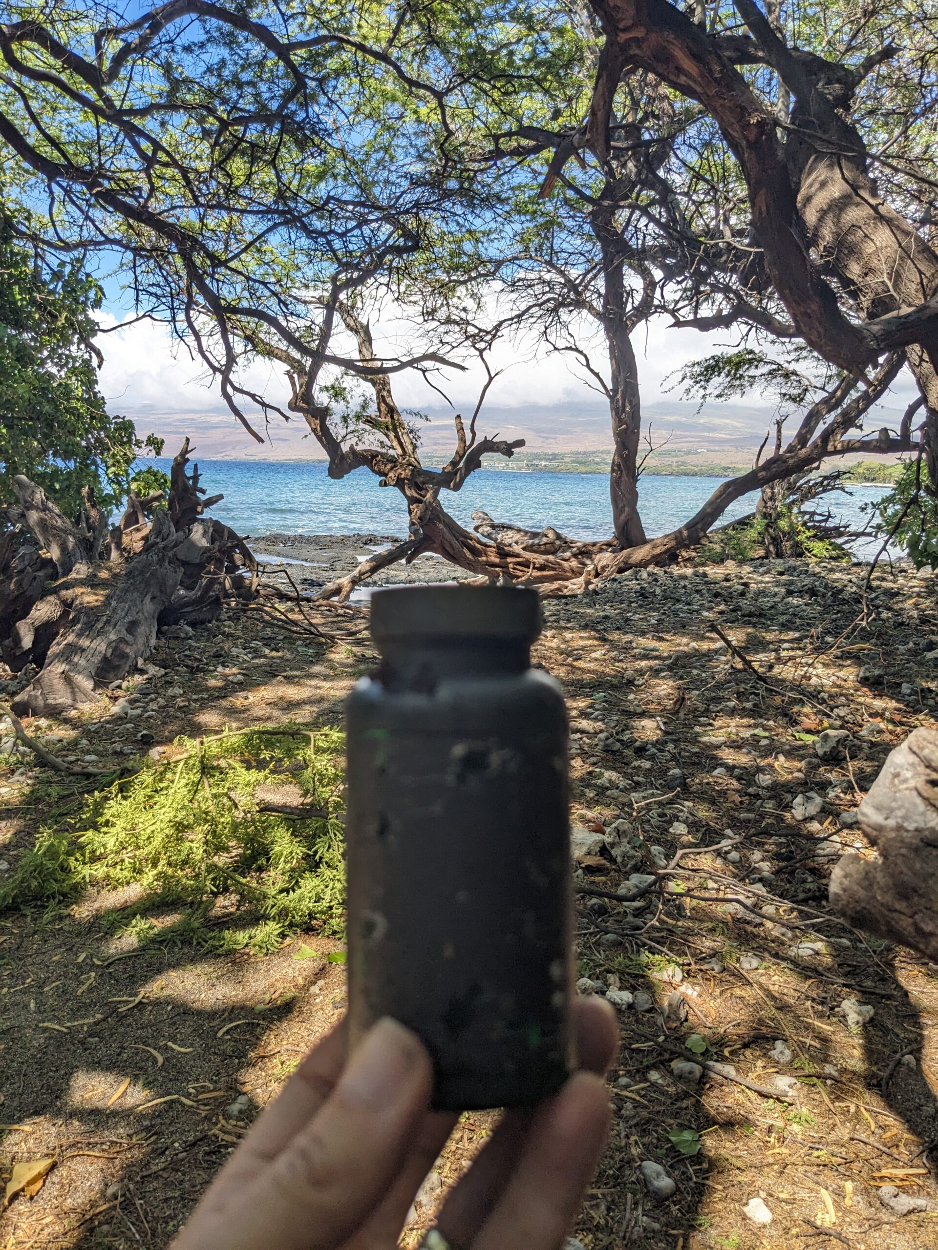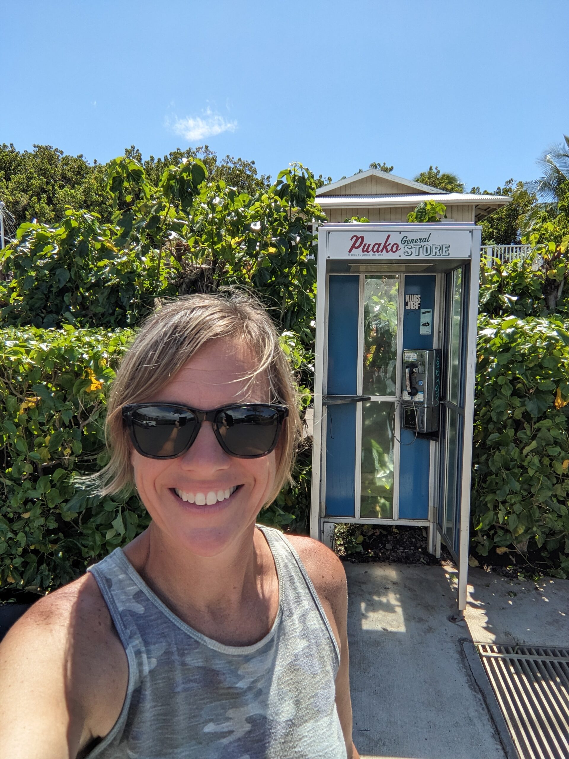 From here we began the geocaching stretch in the small town of Puako. At the general store there was an old telephone booth. I knew a Travel Bug hotel was located at the telephone booth. Uncle Andy was up on the porch of the General Store and he said did you look behind it? At that point I hadn’t because the bushes were pretty tight, but I poked around and low and behold it was hanging off the back. He said he could see something hanging from his vantage point. Good job!