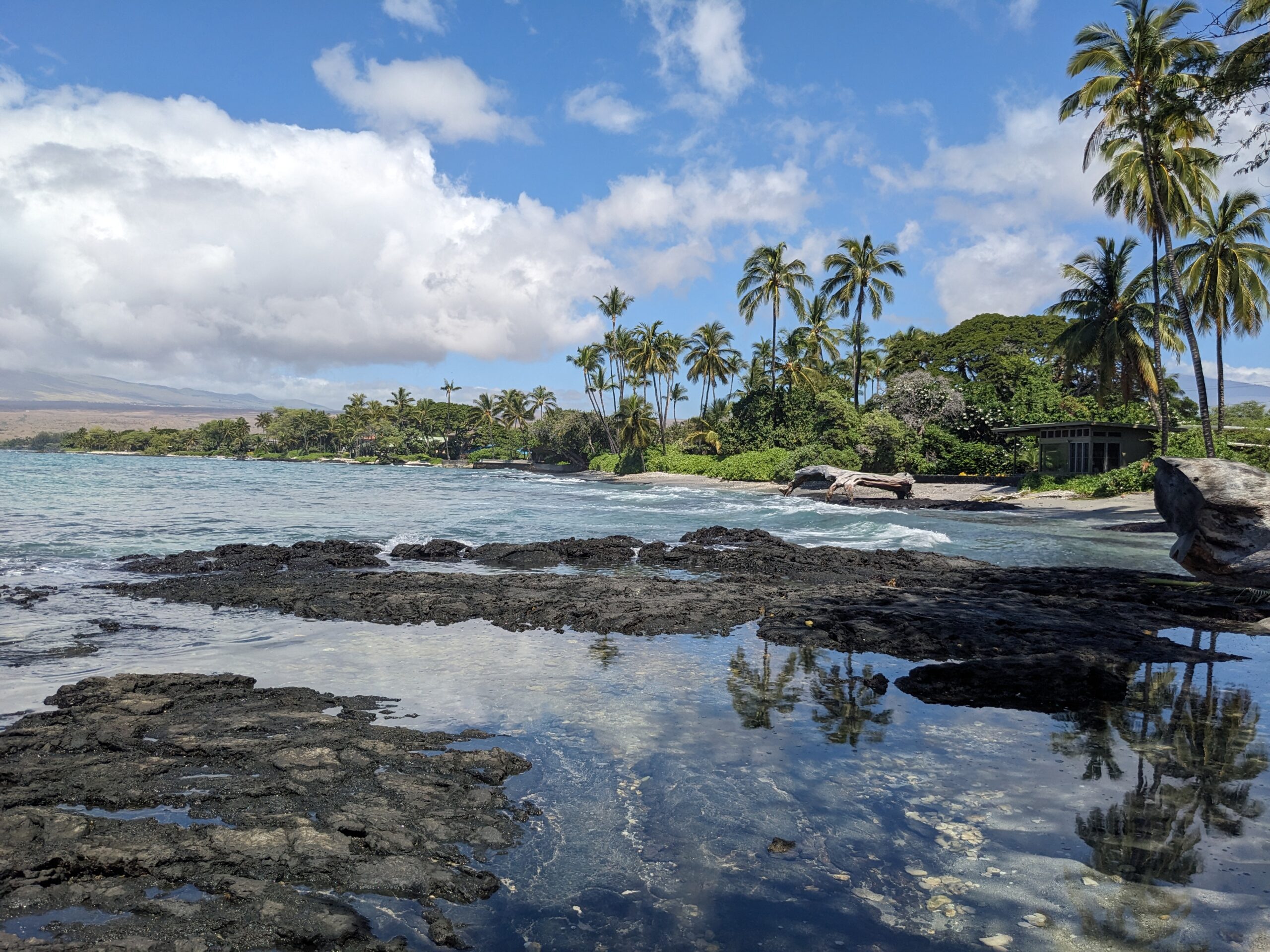 I woke up this morning to find perfectly blue sunny skies. You would have never guessed there was a major storm system that had passed by yesterday. After taking our time getting going this morning, we headed out the door around 10:30 and headed to the Hamakua Macadamia Nut Company (https://hawnnut.com/) in Kawaihae. It was a short 15 minute drive to the north of where we are staying. They had an excellent store and had windows where you could watch the packaging production. Unfortunately there was not a lot of activity going on behind the glass, but I still found it interesting. They had free samples of some of their flavored macadamia nuts. I tried the pineapple, birthday cake, and onion flavored nuts. Each one was unique and different, but I settled on buying a bag of unsalted/unflavored nuts. I also bought a small can of chocolate covered macadamia nuts, although that probably wasn’t the smartest choice since we weren’t planning on going right back and they were going to be sitting in the warm car. Yup . . when I opened up the can to eat one several hours later the chocolate was quite melted! I put them in the fridge when we got back and I’m sure I’ll be able to chip them out later.