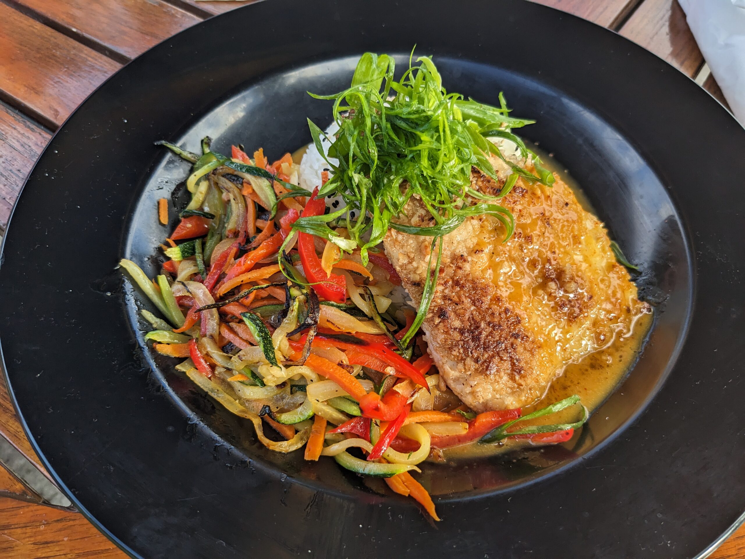 I landed in Kona, HI about 1:20p.m. and since I didn’t check any bags I had a very smooth exit. I was out on the curb and Uncle Andy was picking me up in no time. He has rented a condo in Waikoloa, HI which is about 25 minutes from the Kona airport. Last time Tom and I were here he we flew in and out of Hilo, so this was a new experience for me. The drive to the condo was pretty much a view of lava fields on our left and right with views of the ocean and mountains just beyond the lava fields. I was greeted at the condo by my Cousin Nikki, her husband Chris and their girls Riley and Harper. The girls were excited to tell me what they had been up to all week. Their flight home was this evening at 9:30 but we still had time to sit and chat in the condo for a bit before we wandered up to the condo pool and restaurant area. Uncle Andy, Nikki, and I enjoyed a happy hour Mai Tai while Chris stayed back with the girls until dinner time (Harper was super tired and taking a nap). Soon Chris and the girls joined us and we ordered dinner. I had an excellent macadamia nut crusted fish with rice and vegetables. A great first dish on the island!