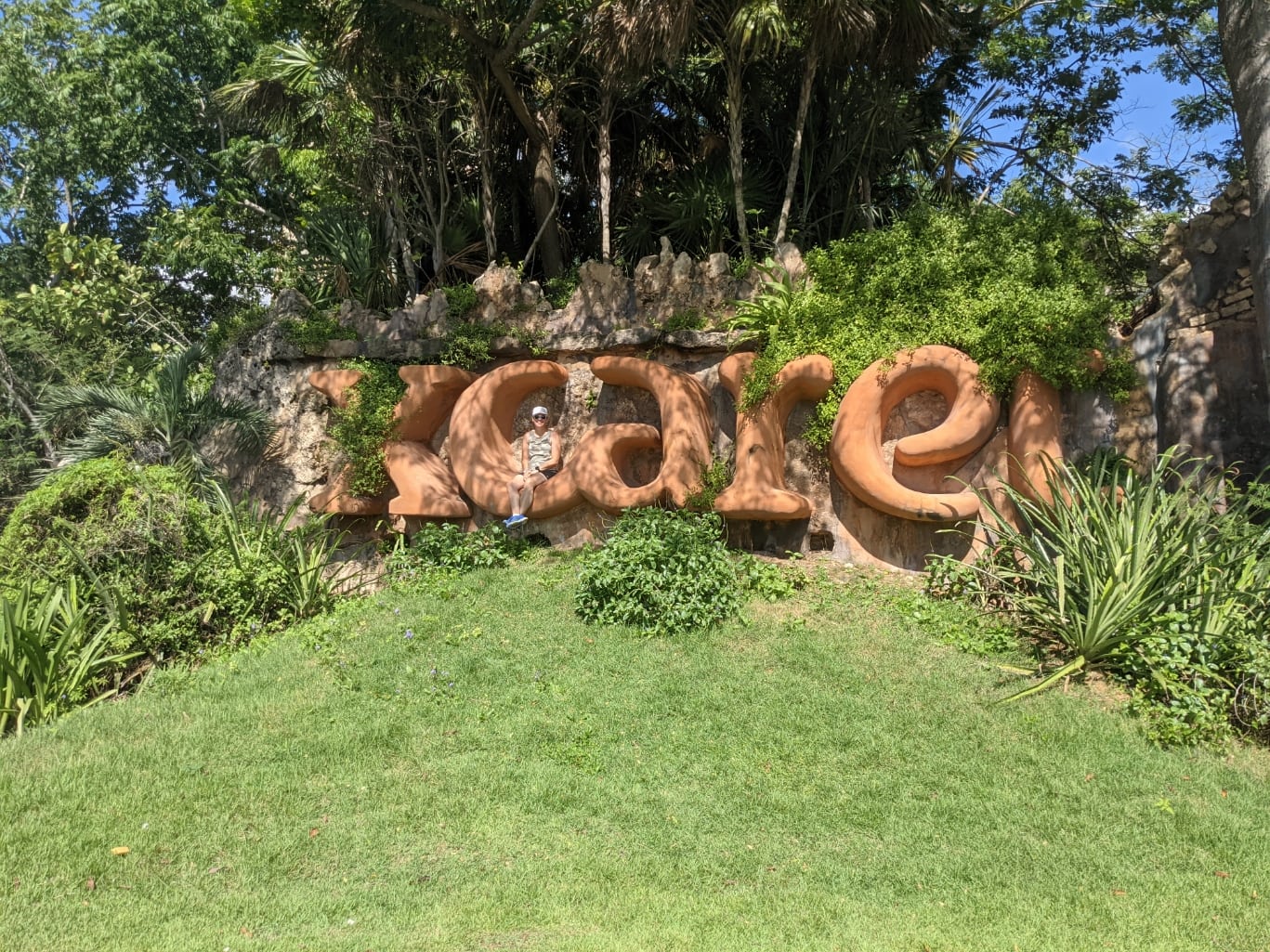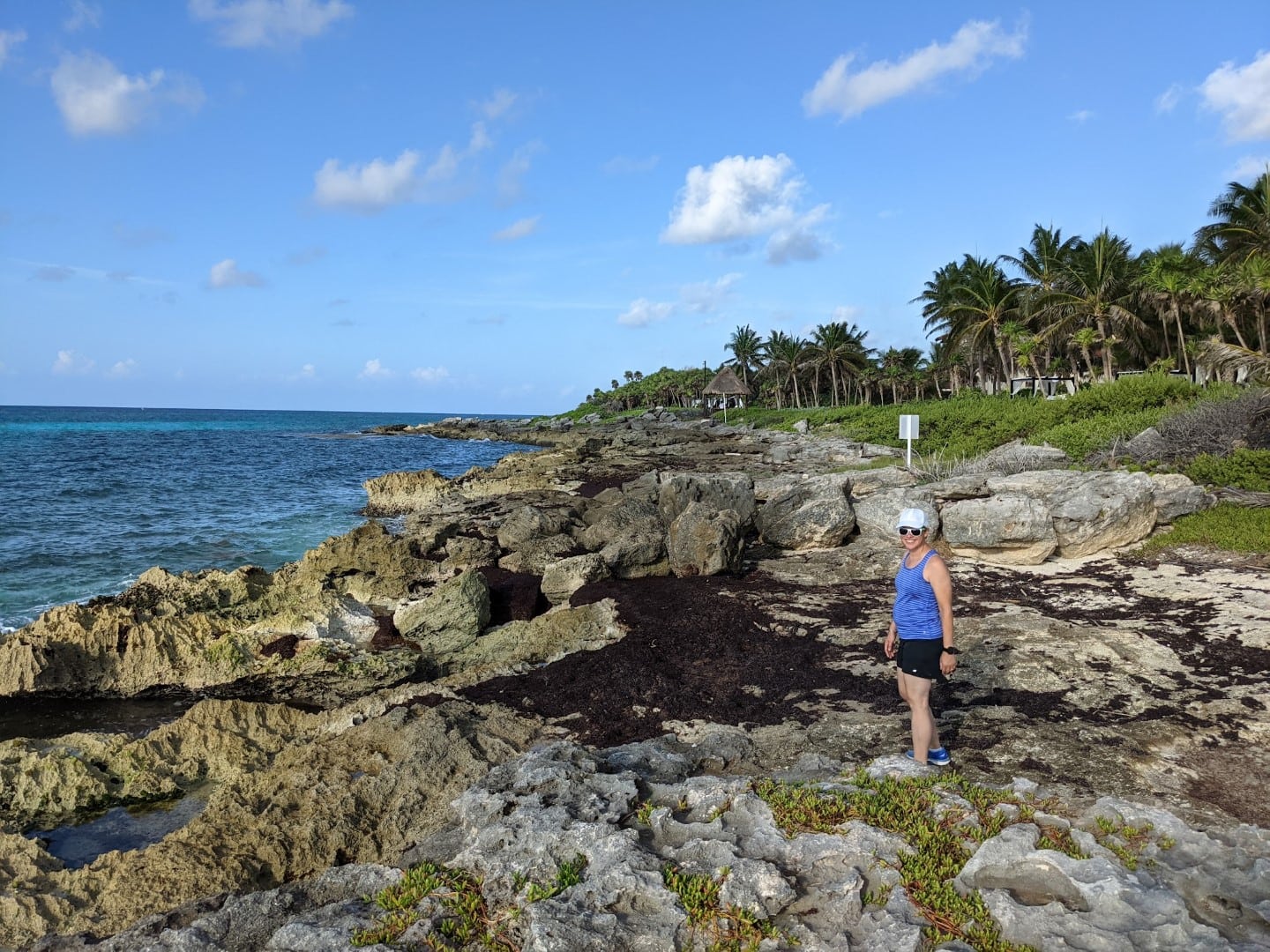 Our first couple of days we spent lounging in the pool. It was much too hot and humid too just lay in the sun like I normally would, so we camped out in the shade of the huts by the pool. The one thing this resort did not have was a beach like I normally like. I love to be able to walk along the beach for miles right on the ocean. This resort had a small inlet area with a beach. This would be a great are for little kids to play in the water, but not so great for people like me who like to walk the beach and sit on the beach to enjoy the ocean air. We did swim in here a few times though as the water was cooler then the pool and Tom was able to use his snorkel set. Almost every morning we went for a walk around the property and one morning Tom and I ventured to walk the rocks along the ocean (since there was no beach for me to walk). I would have walked those rocks for a mile if I could, but unfortunately, they didn’t take us very far. It must not have been very far past where the resort property ended that there was a man made canal (or inlet) that we were not able to pass or go around. Our little rock climbing adventure ended sooner than what I would have liked. Talking to our front desk person he said that a lot of the resort properties do that so they don’t have a bunch of people walking in front of their properties even though the first 10 meters are federal property….. bummer. On our other walks Pete and Laurie discovered a simple way off the property that had nice sidewalks that looped around. We all felt this was a very safe area to walk and appreciated a place to get some steps in. On Thursday Laurie agreed to get a few extra steps with me as I ventured to go find a geocache about a mile from the resort. We took the same sidewalks we did for our morning walks but had to walk a little further out to the main road. We got within 200 feet of the cache when I realized it was on the other side of a super busy 4 lane highway. Ugh how were we going to get across? Laurie looked at a Google map and saw we had to be on another road that went under the highway. So we double back to get on that road, just to find there weren’t sidewalks on that side of the road. Again, ugh. Well that’s never detered me before so we carefully walked along a small shoulder and played a little Frogger as I would poke my head out to look for traffic around trees when I couldn’t see. We then saw a sidewalk that took us to the other side of the highway. We got to the large Xcaret sign and after looking in a couple of wrong spots (thanks GPS for not zeroing in where it should have) I made the find. I would have been really mad if I couldn’t find the cache after the long adventure/walk we took to get there. We snapped a picture and then found an underground walking tunnel and path back to the sidewalk we needed to take us home. We had a much safer walk back to the resort and got lots of steps in that day. Like most geocaching adventures you always find the trail you’re supposed to be on after you find the cache.