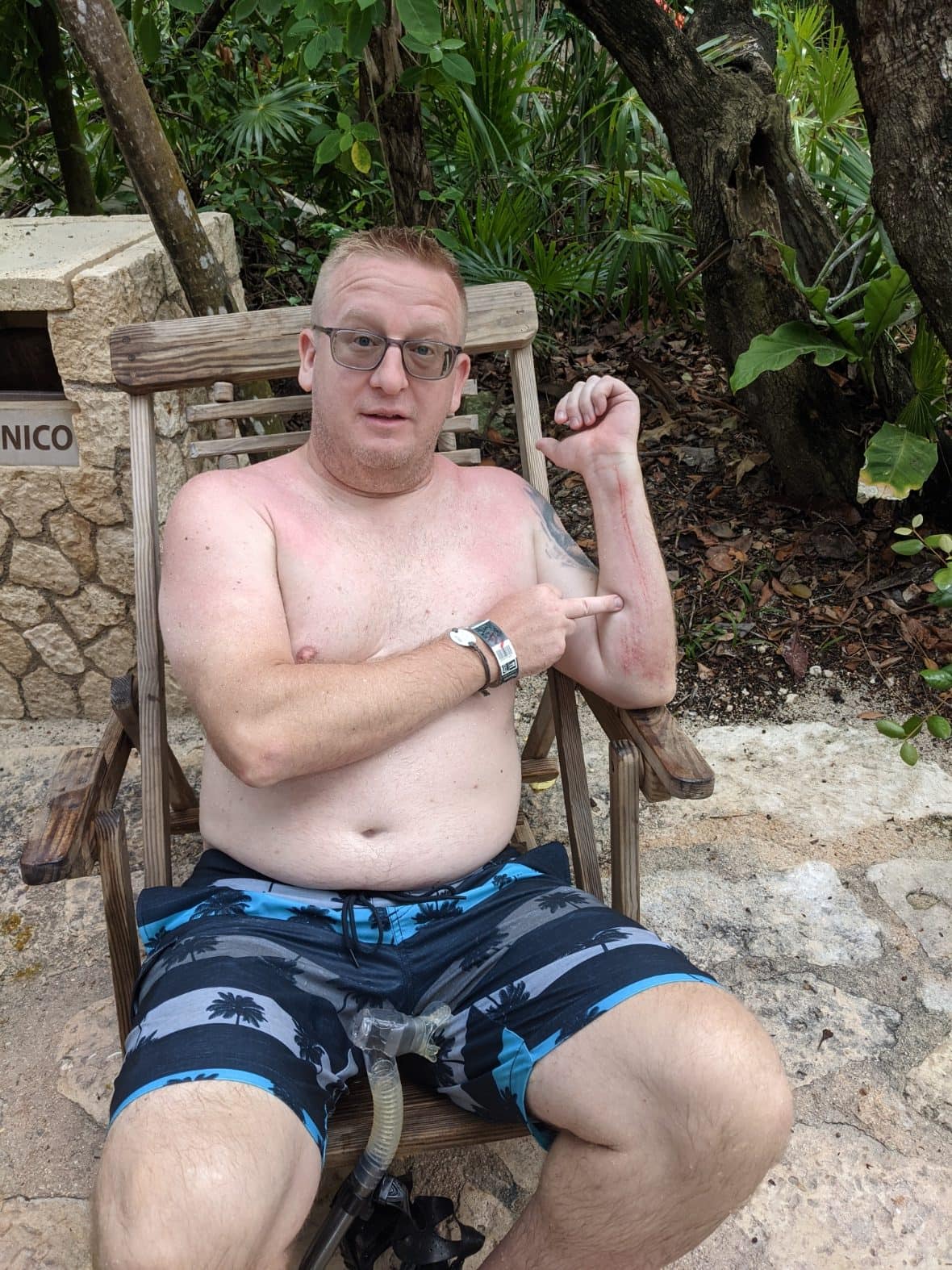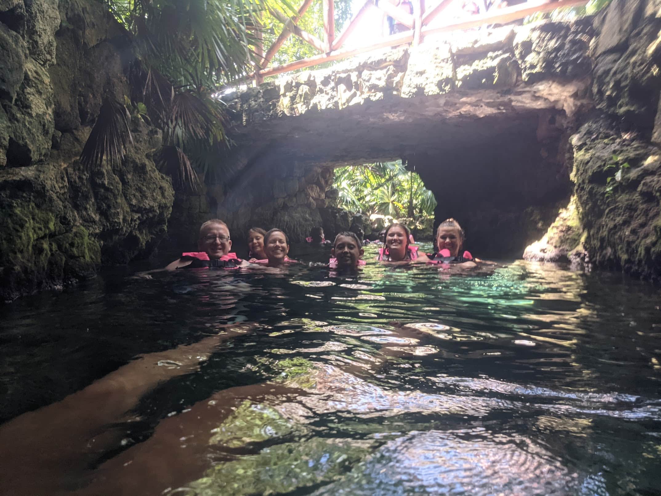 For excursions on this trip we went to Xcaret on Wednesday. Excaret is a nature park that is connected to the resort we were staying at. When I was there I thought some of it was natural, but found out later that it was all man made. As our front desk person said “Mexican Disneyland”. Just as we entered the park it started to pour rain so we walked through some indoor exhibits of Mexican heritage. The rain didn’t last too long and we were on our way to do the river swim (the big attraction at the park). Getting our lockers and life jackets seemed like a cluster, but I think it was only because we didn’t know what we were doing. Once we realized how well organized the park was we think the problem could have been us. They actually have colored tile lining the walking paths that match the signs of where you want to go. The river swim was nice (and water was quite cool when you first get in). It probably took us at least an hour. There was a small current but for the most part I was swimming to move ahead. For 75% on the swim Emma held on to my life jacket and I used my arms and she kicked with her legs and calling herself the motor. It was really pretty, and I would have been more impressed if it was all natural. After the swim we went to the buffet (which was included in our admission price). I thought the lunch here was outstanding (some of the best food on the trip). I enjoyed the ceviche, pulled pork, guacamole, salad, seafood soup, and desserts. After lunch the group split up and Tom and I went with Todd and Kris and the kids to go snorkeling. It was a small area that was kind of crowded but I did see some fish and Emma really liked it. I got out to go sit with our stuff so Kris could go snorkel. After a while they all came back, but Tom said he would take Owen and Emma for another round so I went with him to get a picture of them getting in the water. Unfortunatley that’s when the afternoon took a different turn. Tom was making his way down the steps into the water when he slipped and fell landing on his back and hitting his head on the step (scraping his arm along the way too). It kind of knocked the breath out of him and I handed my cell phone to Emma as I tried to help Tom out of the water. I told the kids to go back up to their Mom and Dad as I tried to help. Tom was able to get out of the water and was going to make our way to our spot, but a bystander who had seen him fall alerted a worker at a nearby concession stand and they called to have some medical personnel come look at him. They got him a chair to sit in while he waited. It took forever for the medical personnel to arrive but after asking Tom some questions determined he was most likely ok but suggested he go the first aid station to get checked out just in case. They brought a wheelchair, but Tom didn’t need it. So Tom and I gathered our stuff and followed the worker to the First Aid building. I wasn’t allowed in with him (thanks Covid) so I sat on a bench outside where I found another wife waiting for her husband that fell some down some wood stairs in another location and might have popped out his shoulder. He came out first and I overheard him tell his wife that they wanted him to go to a hospital and they had given him a steroid shot. He declined the hospital since they were flying home the next day. I was hoping that Tom wouldn’t have the same prognosis. When he came out he said they basically just gave him 2 Advil and cleaned up the scrape on his arm. He had also signed the paperwork that he would not hold the park liable (maybe the main reason they wanted him to see First Aid?) Anyway, long story short we are all thankful that he didn’t seriously hurt himself and that the cost for First Aid was free. When he walked out of First Aid he said he was ok to continue so we called to see where everybody was at, but they all said they were headed back to the resort so we did the same. Other then his back being a little tender over the next couple of days, he’s ok.