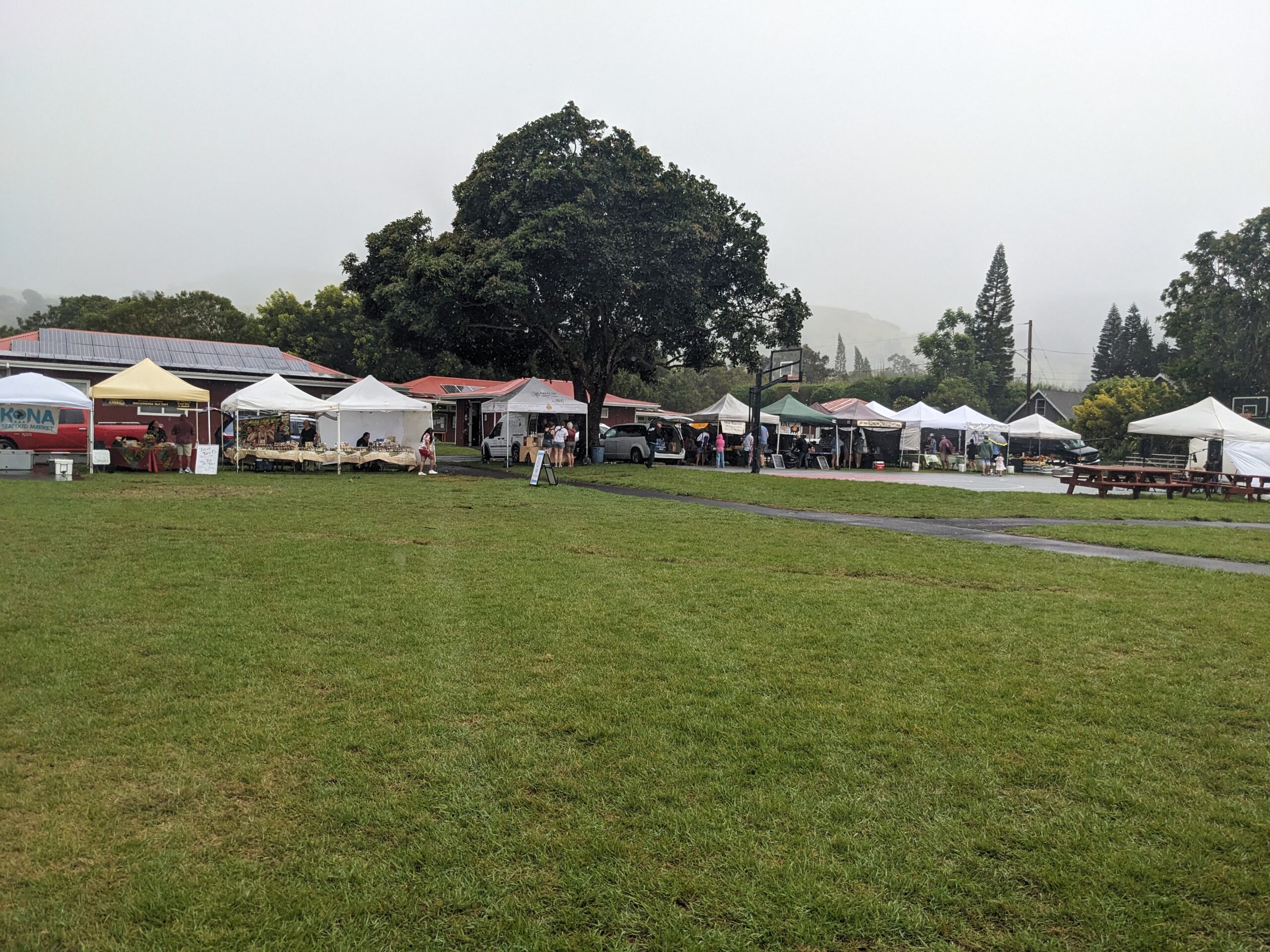 A little before 10:00 we set out to go to Waimea to a farmer’s market. Although it was sunny blue skies when we left, as we gained elevation towards Waimea it began to rain pretty steadily. We made a quick stop at a drug store and headed to the market. Although it was raining we sill got out and made a very quick loop and didn’t buy anything. We took a different route back and was able to stop for a couple of geocaches that were just off the road. Both were quick and easy finds.