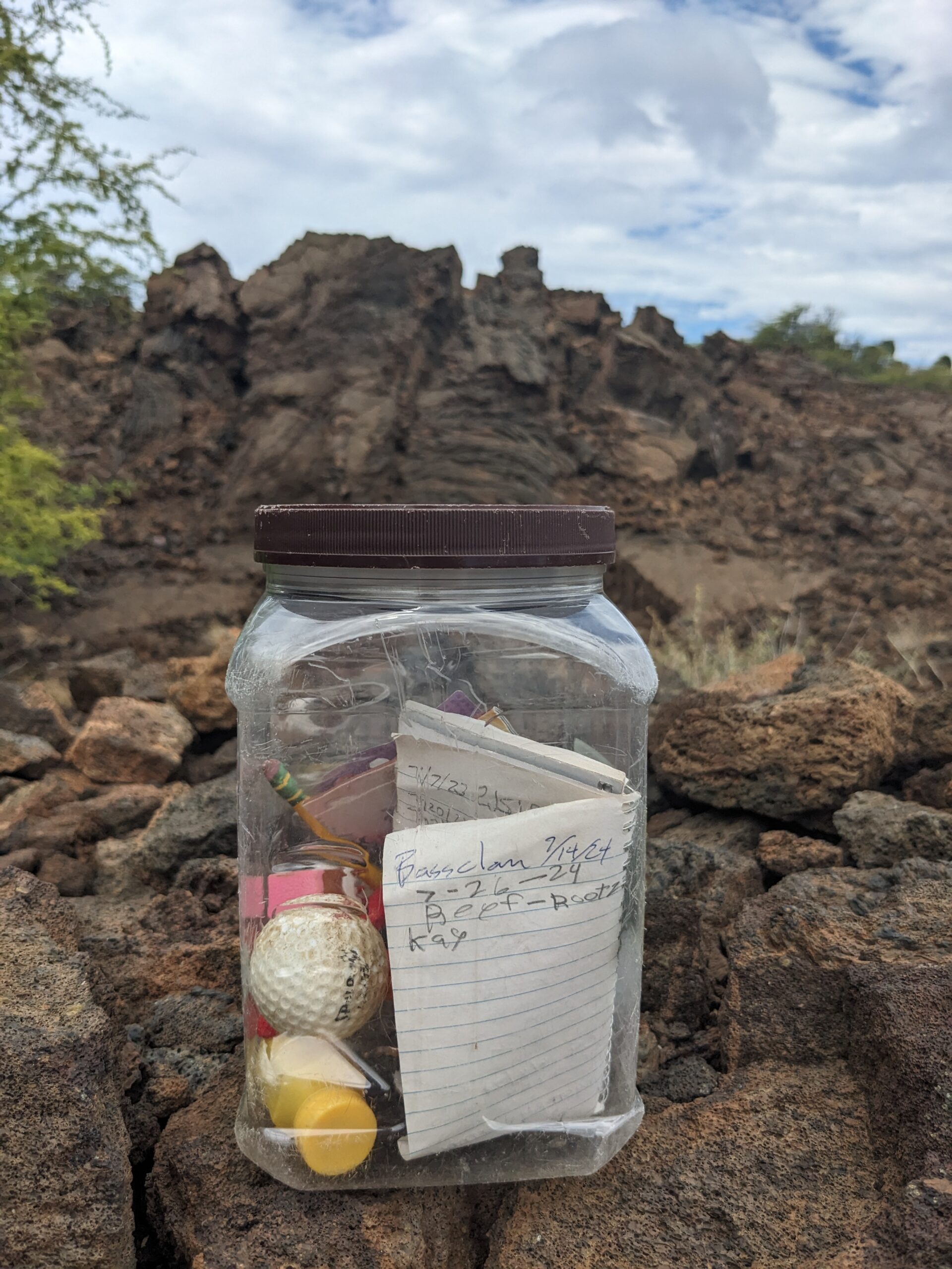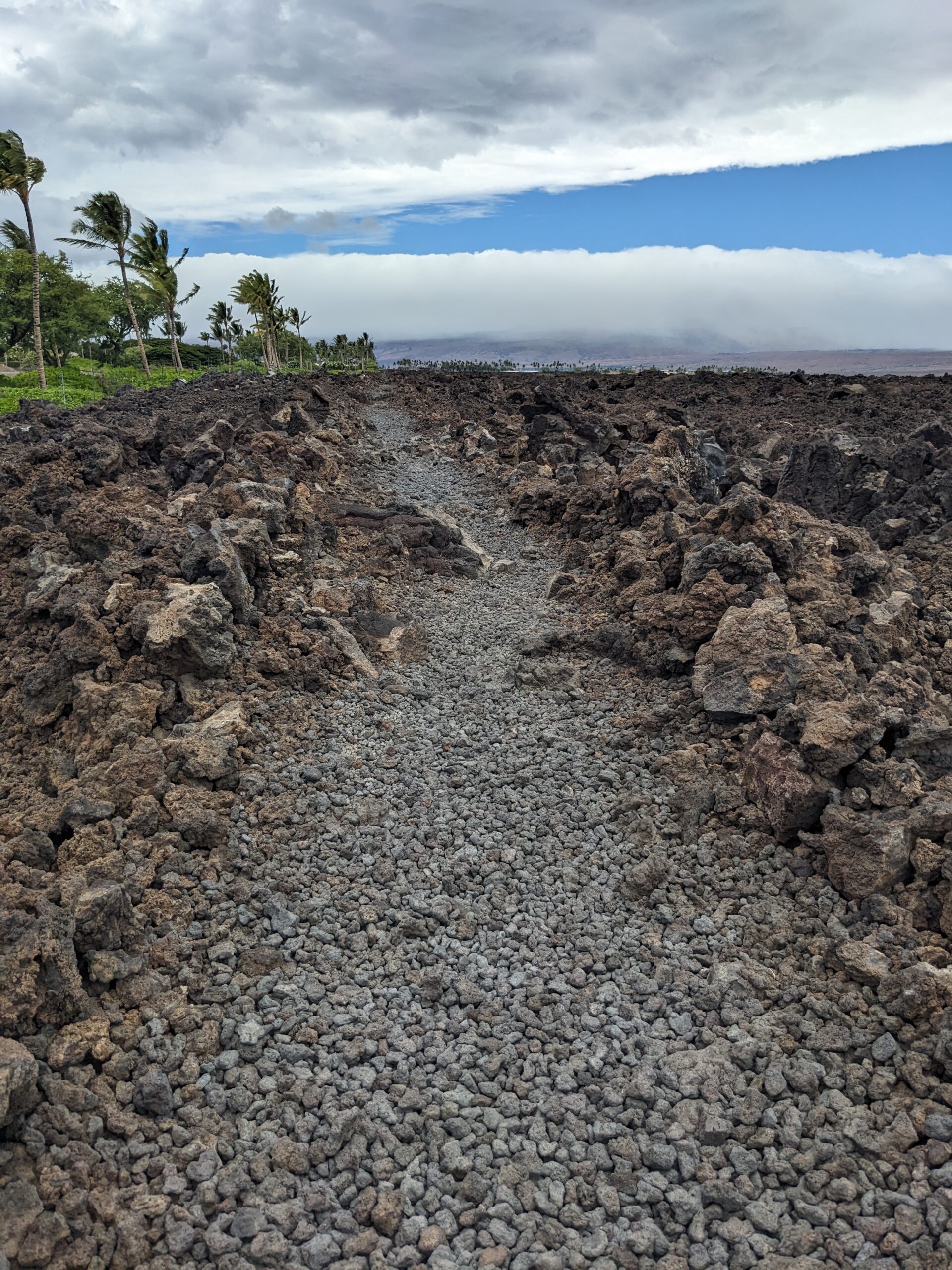 When we got back it had clouded up, so although my first inclination was to relax by the pool, I opted to go for a walk instead. On the way back to the condo from Waimea we had passed an interesting trail head that was just a short walk from the main entrance of the condo neighborhood. I told Uncle Andy I would be back in an hour and headed out. The trail is made up of small lava rocks and although I was wearing my Sketcher Air Walk tennis shoes, I was soon wishing I had brought my more solid Saucony trail running shoes or hiking shoes. Of course my shoes didn’t stop me from walking the trail. I checked my geocaching app and found there was one quite a ways down the trail. At about the point I should have been turning around to head back to meet my goal time of being gone for an hour, I still had a half mile to go to the cache. Since I had already had gone as far as I had, I figured I should just keep going and go for it. I’m glad I did and was able to make the find. On the walk back I texted Uncle Andy to let him know it would be an additional 40 minutes before I got back. All-in-all it was a good hike and I look forward to doing more this week.