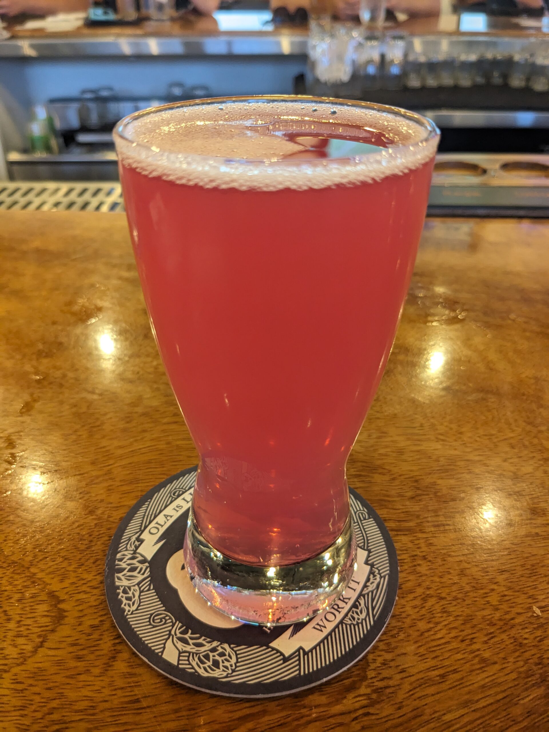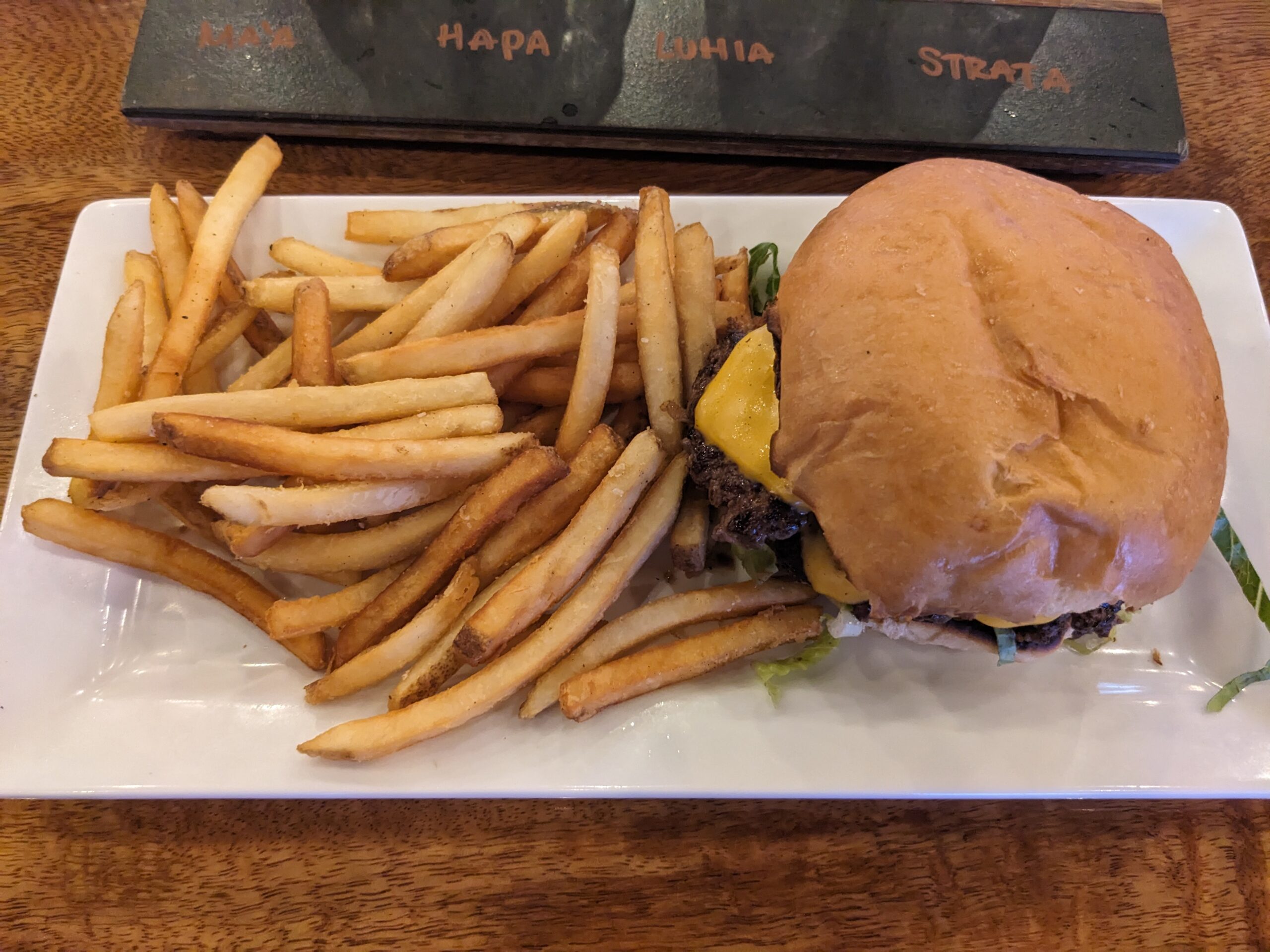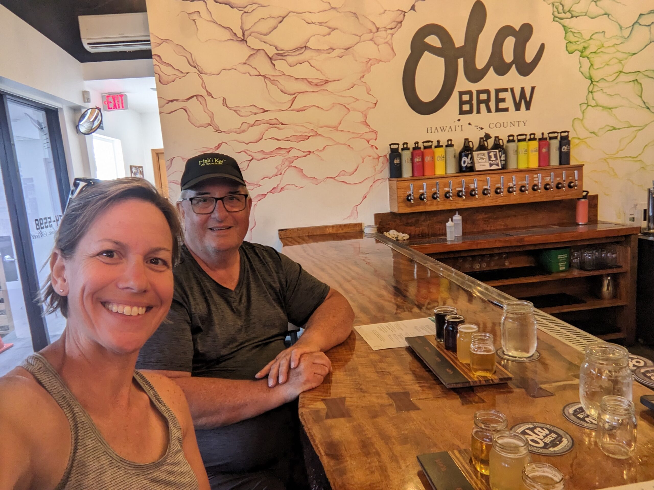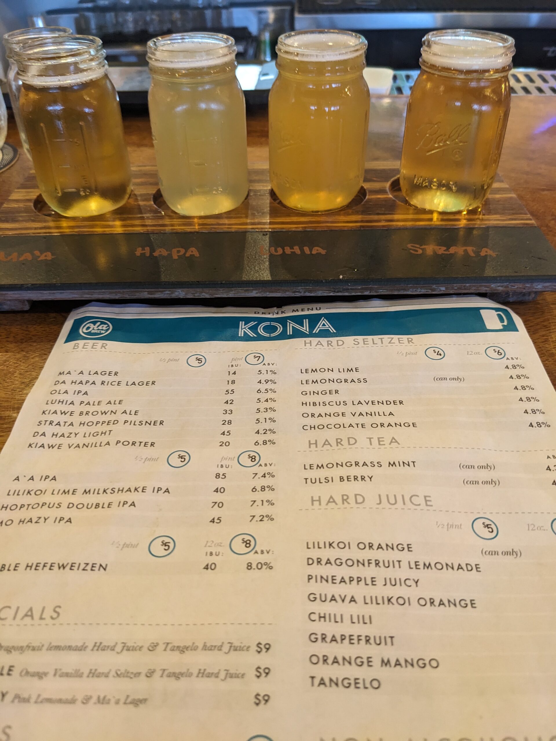 I had definitely worked up an appetite on the walk and Uncle Andy was ready to venture out for a meal as well. We spent some time scouring the internet and the guest book in the condo for places to eat. We had found a couple but decided to go to Kona Brewing Company . . . well at least that’s where we thought we were going when we walked to the car. On the drive to Kona Uncle Andy mentioned Ola Brewing Company and I asked if they had food there. He wasn’t sure so I looked it up on my phone and discovered they did in fact have food. We decided to go to Ola Brewing Company instead. We sat at the bar and each had a flight of beer and ordered a smash burger. As we waited for our food we noticed it had started to rain. Sitting in the bar was the perfect choice for an afternoon activity on a rainy/tropical storm kind of day. The burger was one of the best burgers I have ever eaten. It was sooo good. When I finished my flight I tried an alcoholic Dragonfruit Lemonade drink that was pretty good as well.