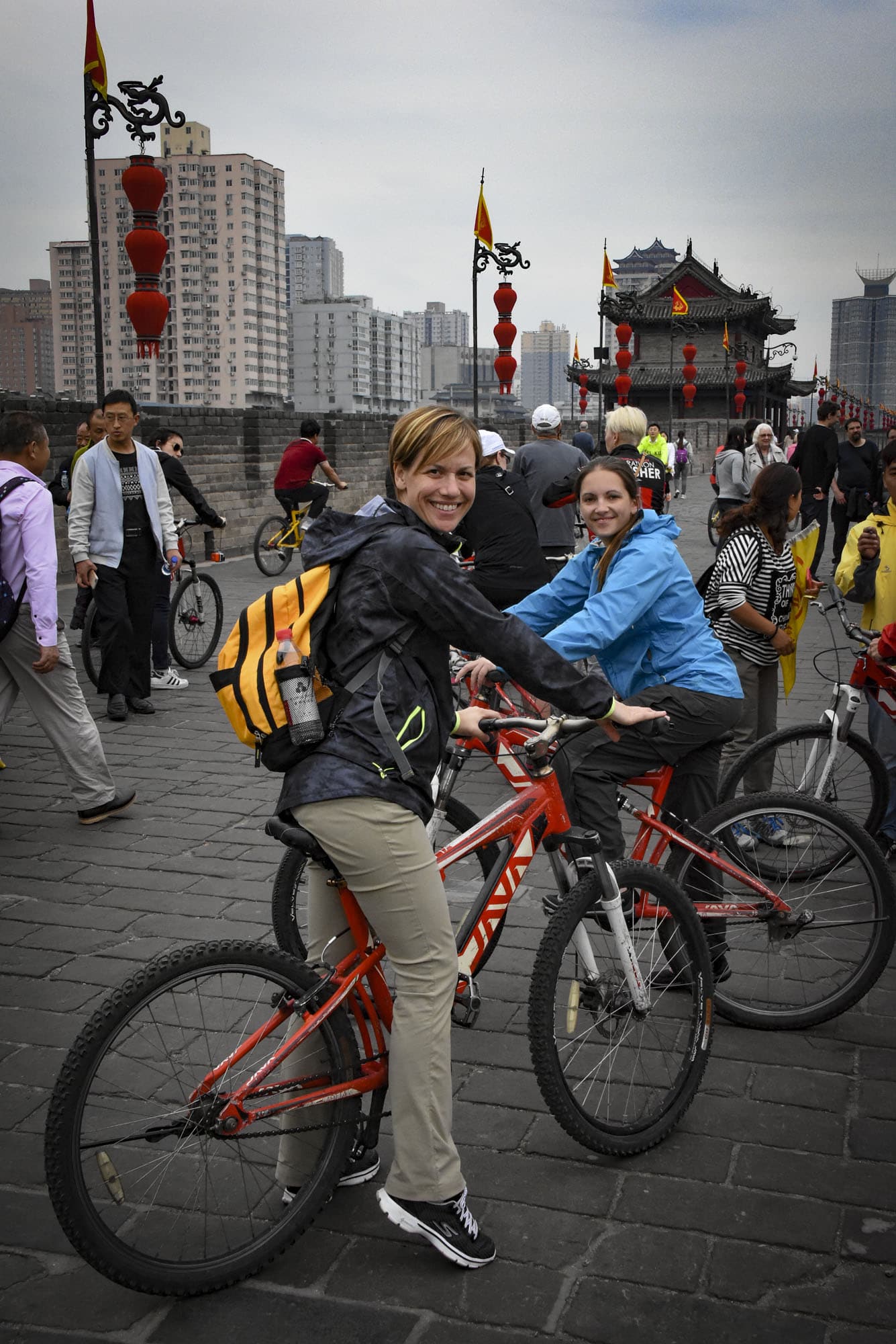 SOB_3172After lunch we went to the city wall of Xian. The city wall stands 12 meters (40 feet) tall, 12-14 meters (40-46 feet) wide at the top and 15-18 meters (50-60 feet) thick at the bottom. It covers 13.7 kilometers (8.5 miles) in length with a deep moat surrounding it. We were given bikes and to ride around the top of the wall. Kathy Loper said that it would be the longest 8 miles we had ridden on a bike. We were give 45 minutes or so. Leah and I set out to go around the entire wall. Tom was with us a bit, but he stopped to take pictures and told us to keep going, so onward we went. We soon realized that we would not make it back by our meet time, so we picked up the pace. It was a bumpy ride up top as it is covered in large bricks, but we were maintaining a good pace until we rounded the 3rd corner when we were against the wind. Now it turned into a workout. We thought everyone had taken off in front of us and we were surprised that we hadn’t caught up or passed any of our group, so Leah and I thought we were the last to return. Turns out we were the 2nd and 3rd ones back and the rest of the group was still going around the wall. Everyone made it back about 20 minutes after the original time. No wonder Kathy said that would be the longest 8 miles. I was feeling quite sore when I got off the bike.