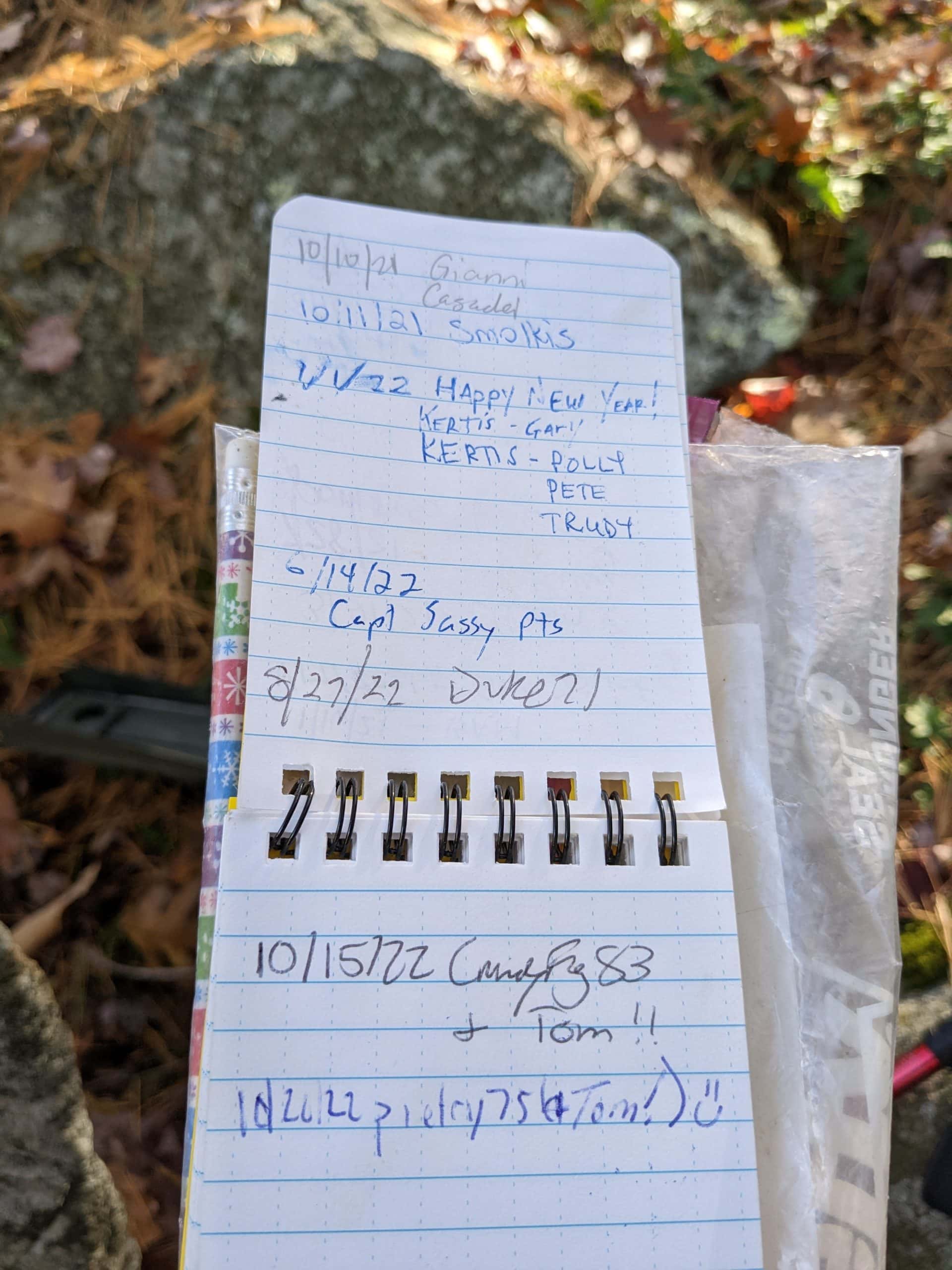 The next stop was Mt. Tom State Park in Lichtfield, CT. I’m not going to lie, I was looking at my “Best Road Trips in America” book and when I saw there was a park with Tom’s name in it, I thought we must stop there. The previous day I had looked up the park online and knew there was about a mile and a half hike to the summit with a tower on top. When we pulled into the park I was disappointed to not see a big welcome sign. We did find parking and the trailhead for the Tower Trail, but I still wasn’t sure we were in the right spot due to lack of signage. Looking at the GPS there was what looked to be another entrance into the park on the other side, so I had Tom drive around (took probably 10 minutes on a single lane gravel road . . .here we go again) just to find it was not another entrance. Back down the single lane gravel road back to where we were. This time we looked at the map that was posted on the little welcome shack that nobody was working at. Yeah, we were in the right spot the first time. I had tried to pull the same map up before we made the extra drive but I didn’t have any cell reception in the area and we didn’t stop to look at it before we made the extra drive. Also since I didn’t have any cell reception, I wasn’t able to look at the geocaching map to see if there was a cache in the park. We took a picture of the trail map and made our way back to the trail head and started the climb up Mt. Tom. Of all the hikes we’ve done on this trip, this one was pretty easy (or maybe we are just getting used to climbing mountains?). It felt like we made it to the top in no time at all. Maybe that’s because we agreed we wouldn’t take any pictures until we got to the top. At the top, I was pleasantly surprised to find that there were stairs inside the tower for us to actually ascend to the top and view out. I guess this would be similar to the observation towers in most of the WI state parks I’ve been too, but this one was just disguised in a medieval looking stone structure. The 360 degree view was ok. At least it was a bright clear day!! I descended first so I could get a picture of Tom peering over the top of the tower. As I waited for him to come down I realized since we were up so high that I once again had cell reception. After making sure I had directions to our next stop, I pulled open the geocaching app and found that I was 129 feet from a cache! Tom was taking awhile to come down and when he did I found out it was because he was scratching our mark into the wood stair case. I dragged him the 129 feet towards the cache. As I was searching the area, he was surfing his phone. I was getting frustrated that it was taking me longer then I felt it should, when I turned around and there it was! Yay I found it! This made the trip to Mt. Tom State Park even more worth it. I logged the cache and then we headed back down the trail. For once, the time we estimated that we needed at the park was about spot on, if not a little less then estimated.