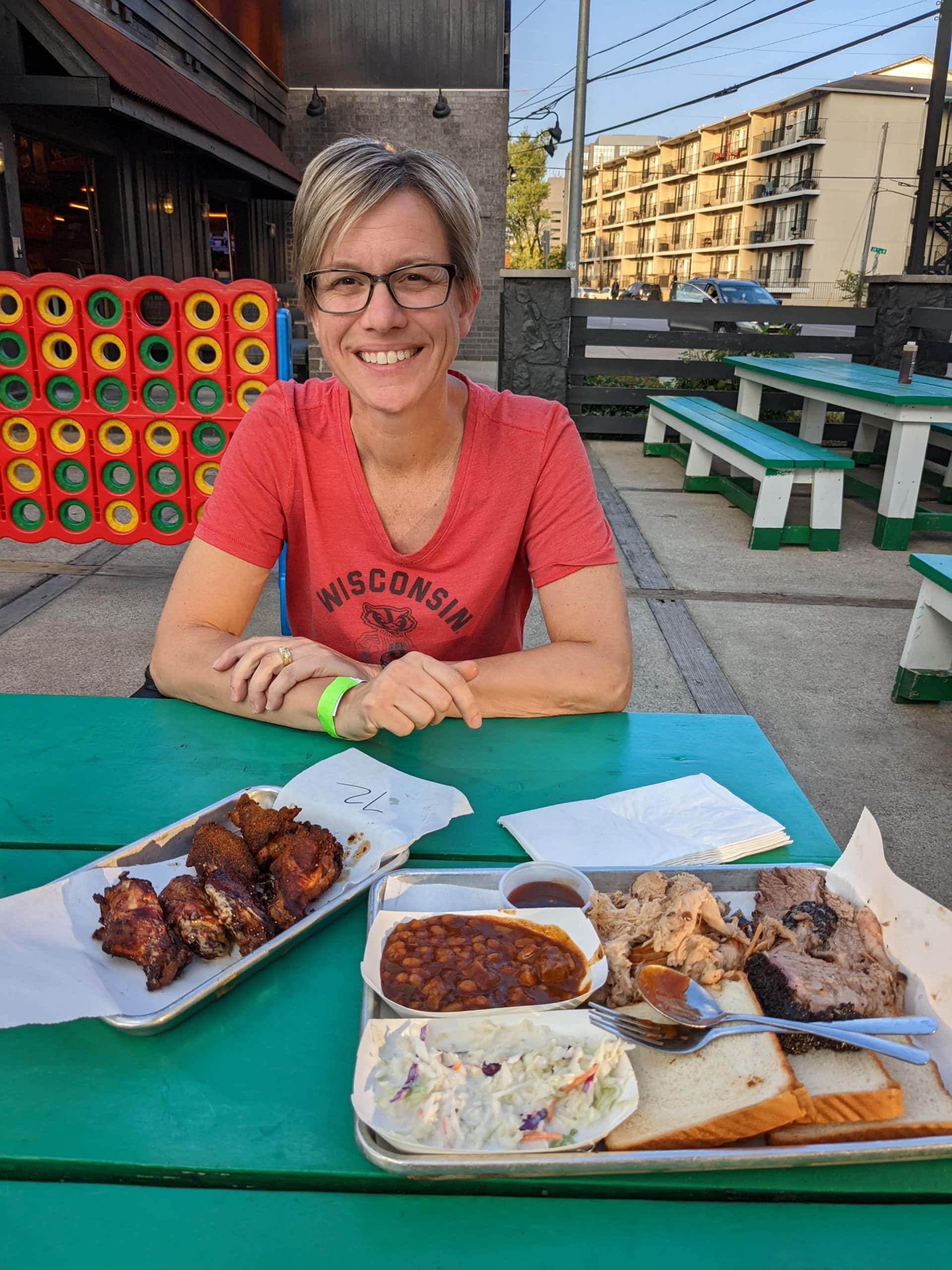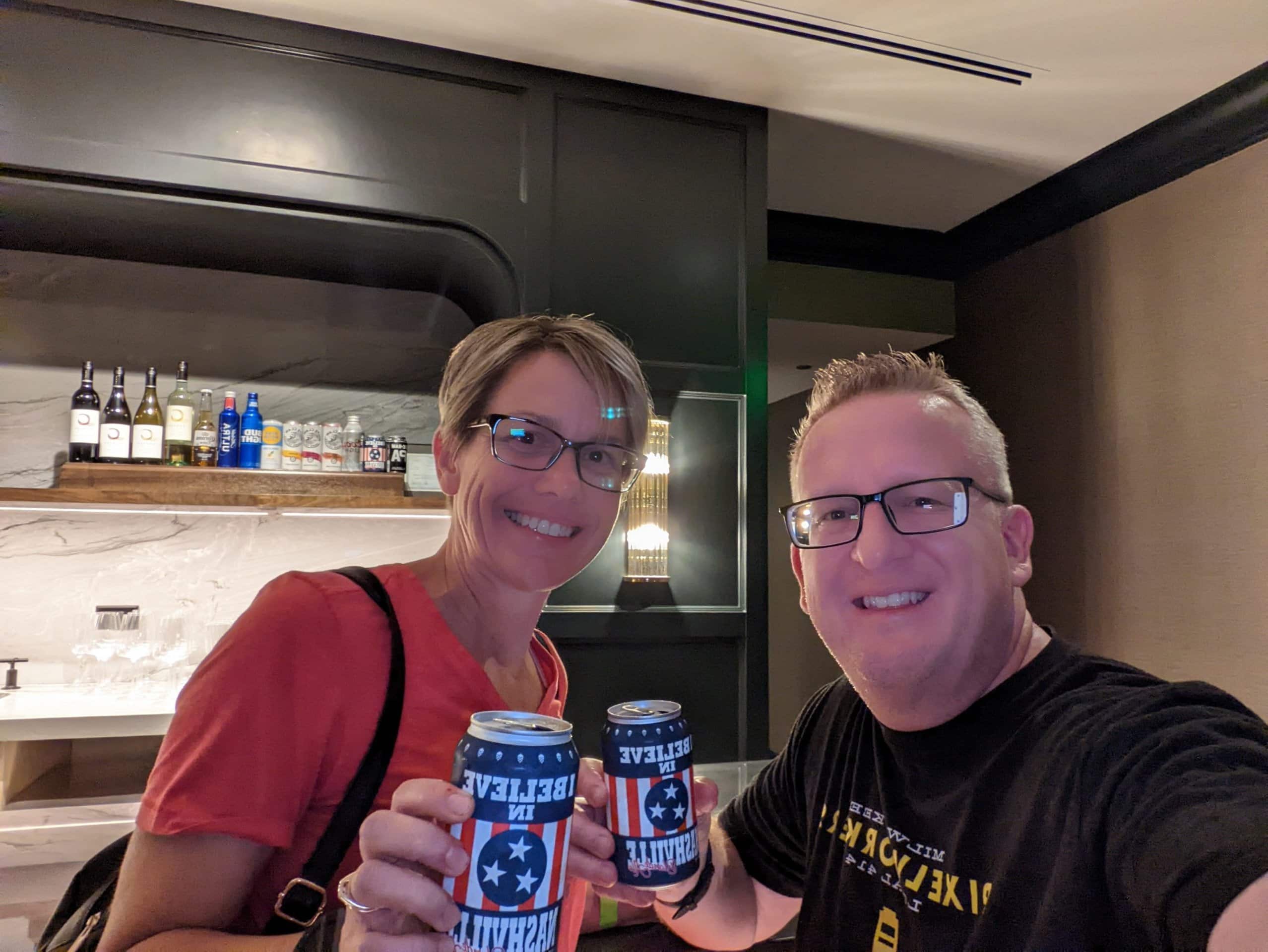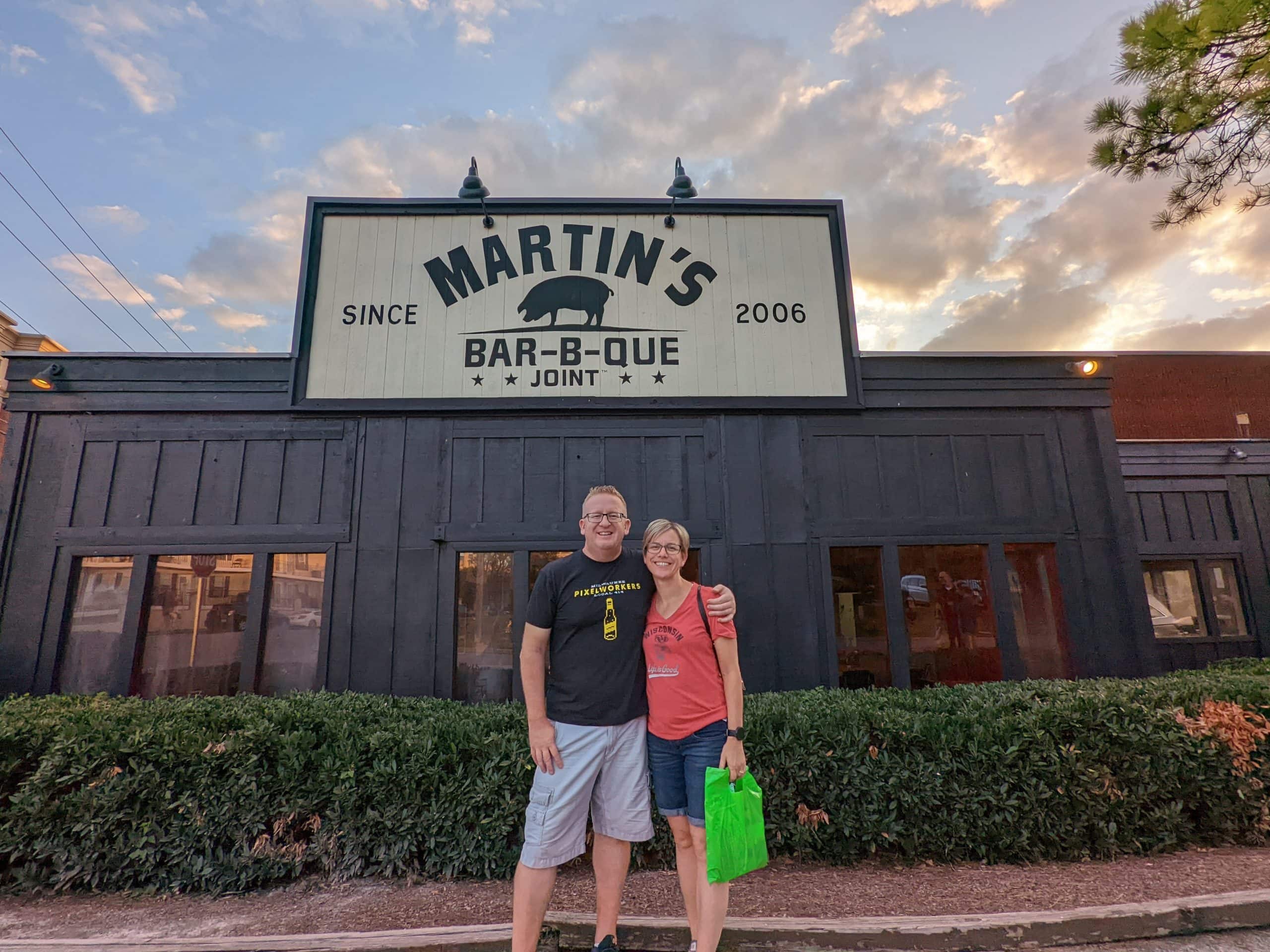 Having our fill of games Tom called for another Lyft to take us to a BBQ restaurant called Jack’s, that our first Lyft driver had recommended just outside of the busy area of Broadway. With talking to our current Lyft driver he recommend a different BBQ place, so we told him to take us there instead. At Martins Bar-B-Que we shared a combo plate of brisket and pulled pork and also ordered 6 smoked wings based on the recommendation of the Lyft driver. All food was excellent!! When we were waiting for our food we looked up how far we were from the hotel and realized that we were only about a mile and a half away and it was pretty much a straight shot back, so even before we got our food, we planned to walk back. After we ate as much as we did I was so happy for the walk. We ended up walking as fast as we could so we could get back before 7:00 to take advantage of Happy Hour in the club and get our “free” drink. We made it into the club bar at 6:54! The same bartender who was there the night before and also worked breakfast, was behind the bar. He recognized us and hooked us right up with a beer, and because beers are so expensive in town, we weren’t too ashamed to ask if we could get another before the first one was gone to cash in on happy hour. He obliged with no objection. We took our unopened cans of beer and the ones were currently drinking back with us up to the room so we could drink them later at the pool.