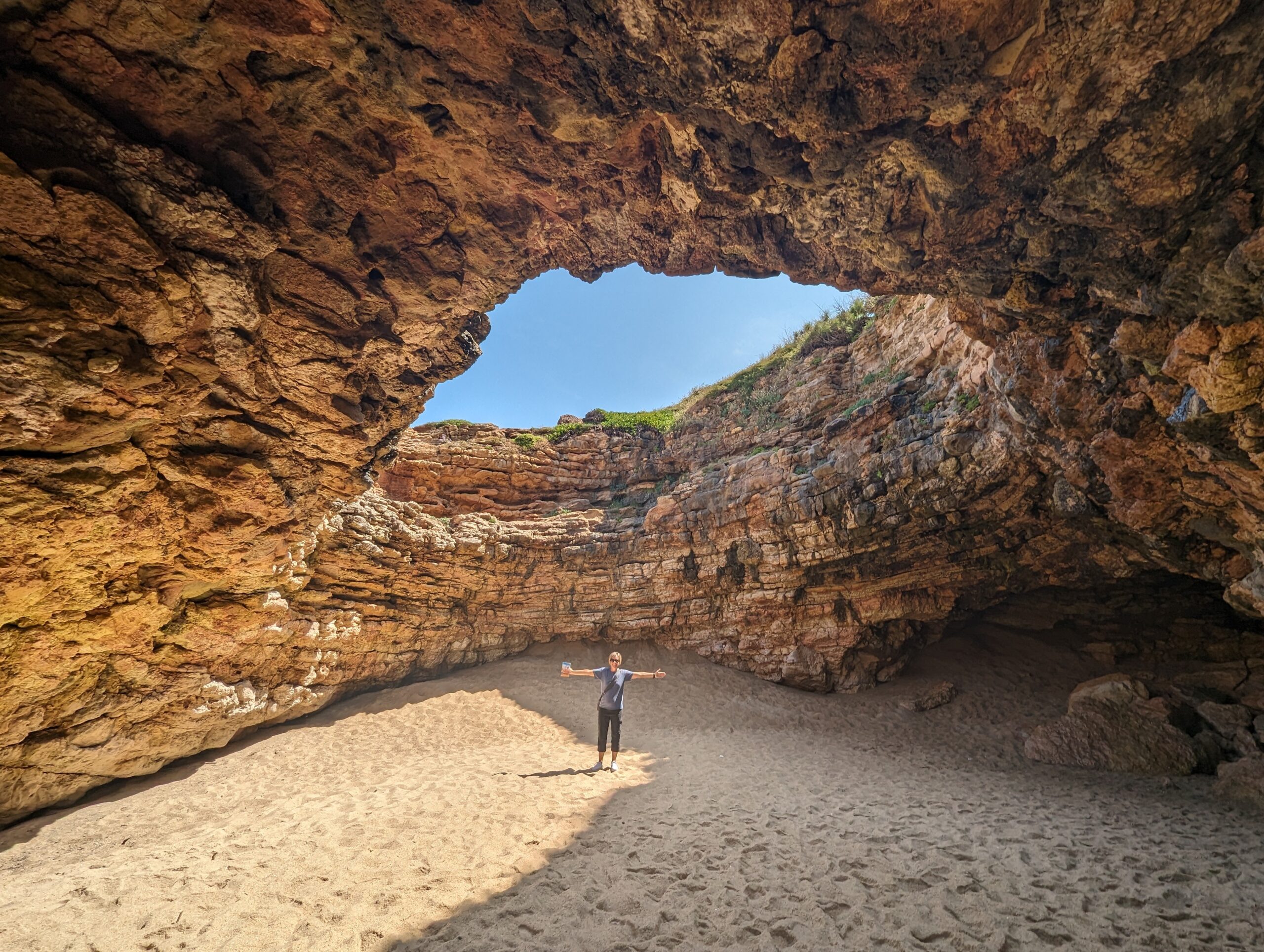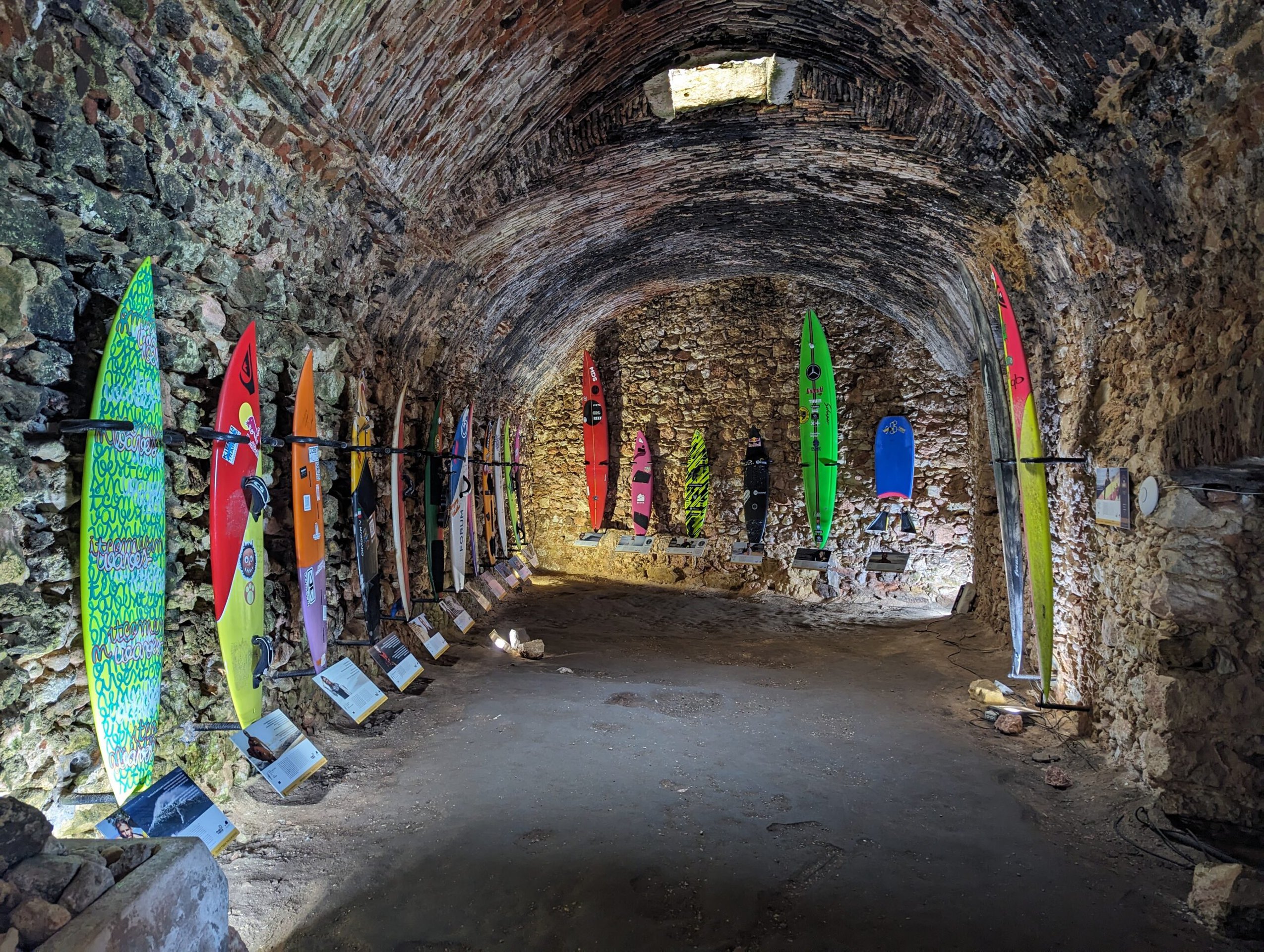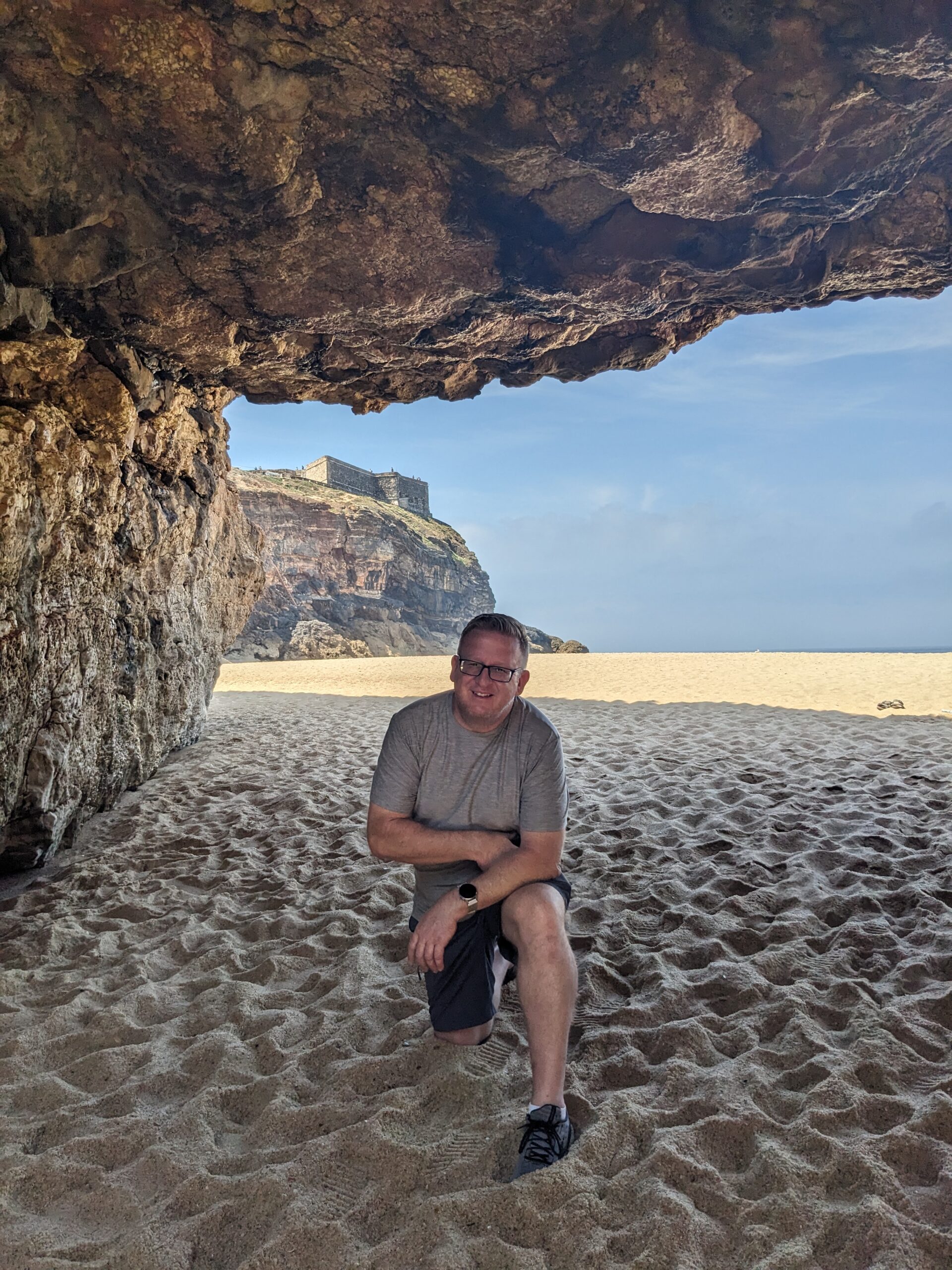 We then walked down to the fort where it now holds an exhibition on the big waves and the surfing history in the area. It was quite interesting and I can only imagine what those waves must look like. Today it was pretty calm. Back in 2011 Hawaiian surfer Garrett McNamara broke the world record for the largest wave ever surfed at this spot. On one side of the fort the view was of the beach we were on, and the other side was Praia do Norte (North Beach) where the big waves break. We learned the big waves are caused by an underwater canyon. When we were done with the fort and surfing exhibition I checked the geocaching app and saw there was a virtual close by. I got to within 60 feet of it, but knew I wasn’t in the right spot because it asked for how many steps were visible on the cliff side and I was on top of the cliff. There was a path down to the beach so I talked Tom into going down to the beach.