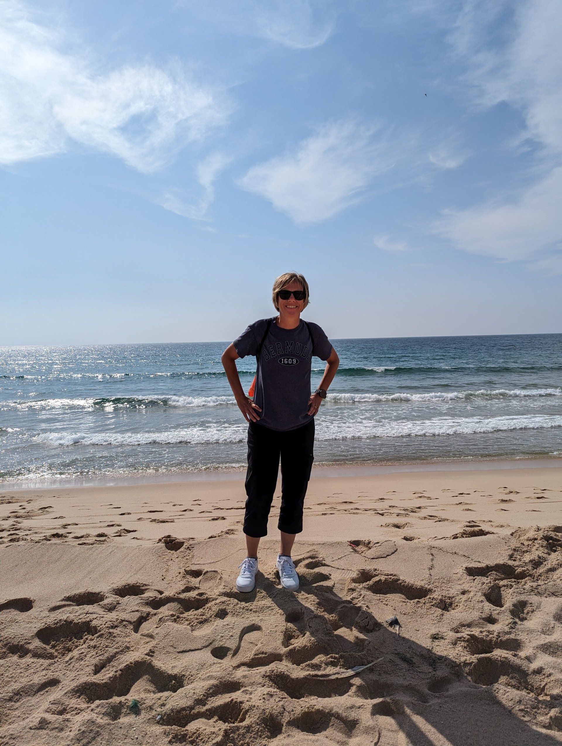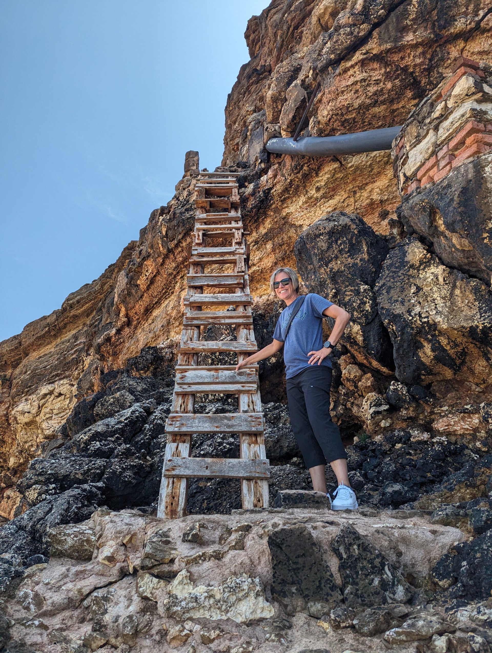 Tom sat in the shade while I walked over to where I thought the spot was but found I couldn’t get any closer than to within 100 feet. I did see the steps that the cache referenced so I took a selfie and thought that would have to be good enough. I walked back over to Tom and picked a few pieces of small sea glass up along they way. Back with Tom we took a few pictures before I saw people walking up on the cliff side and going up the steps I had saw. Tom suggested that we go back up that way. I wasn’t entirely sure because it didn’t seem the safest. Climbing up to the ladder was no problem. Just for giggles we checked the compass one more time and wasn’t really and closer. I went up the ladder first and got up to the top rung, but then couldn’t find any good place for me to grab to pull myself up off the ladder. This put a little fear in me and I climbed back down. Tom then went up and since he’s a little taller, he we was able to pull himself up a little easier. I got myself together and went up the second time and with Tom’s help made it up. The rest of the steps up were easy peasy. That ladder business was pretty nerve racking. We probably should have never done that. I’m re-nervous as I’m typing about it (and yes Leah I totally thought of the ladder app and Check 3 GPS while we were doing it). Needless to say we weren’t any closer to the cache location without going on slippery rock. I was done with attempt and will just log the find from the point on the beach.