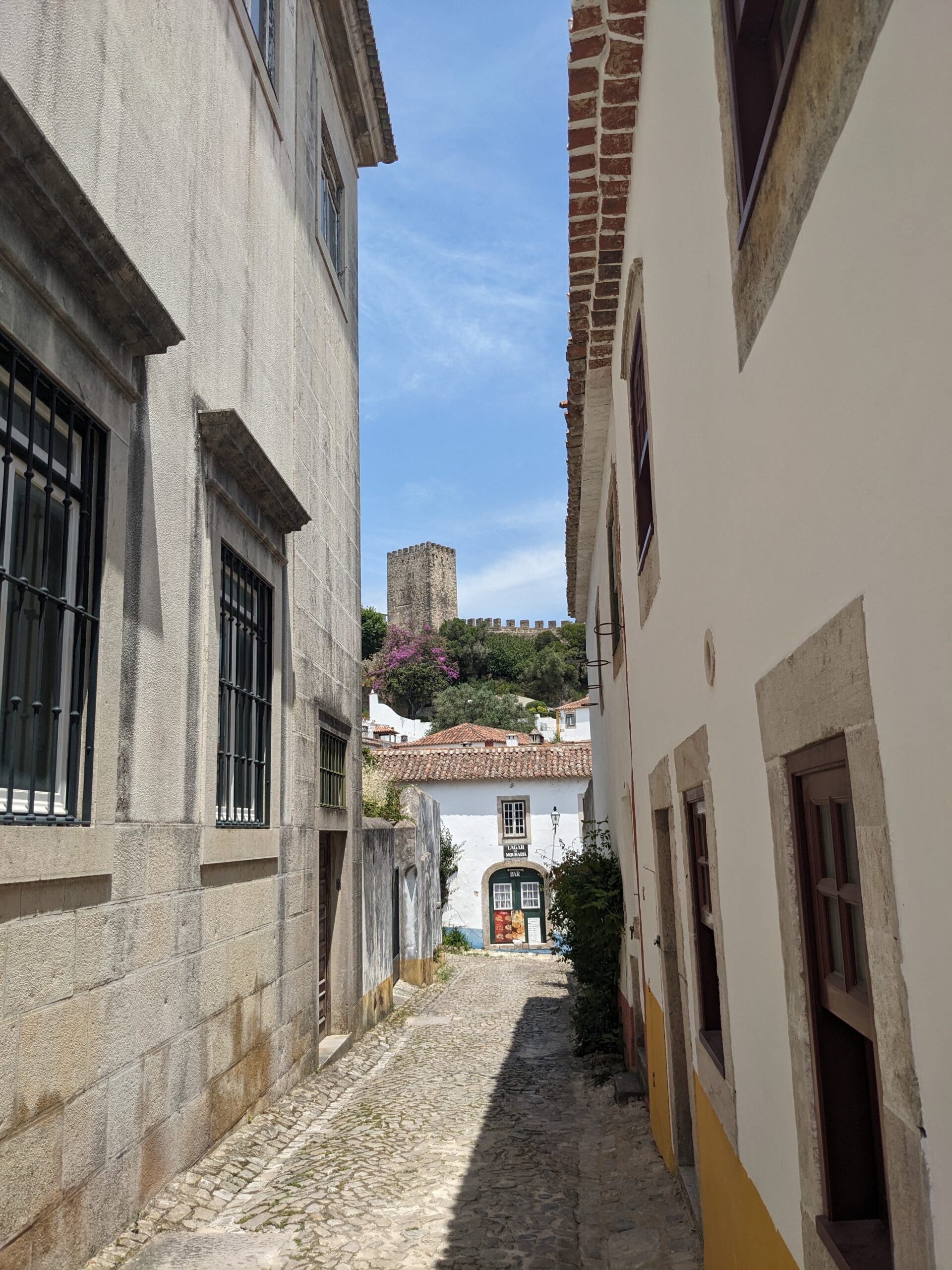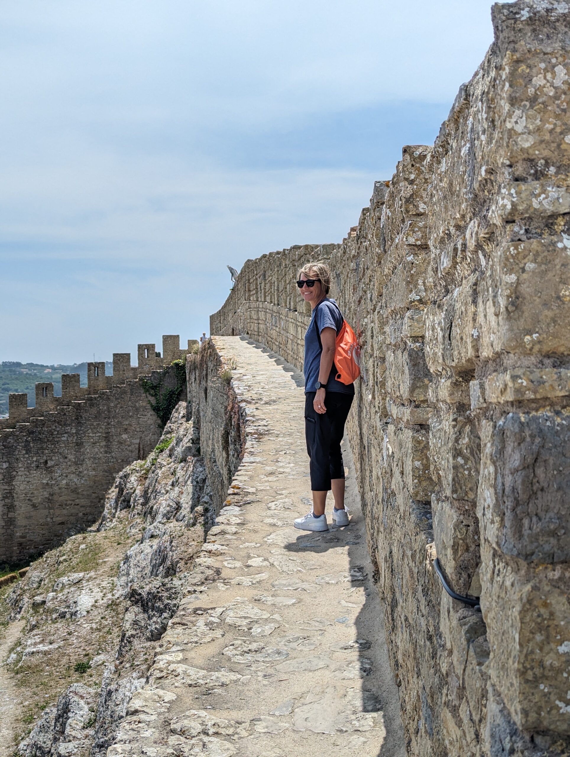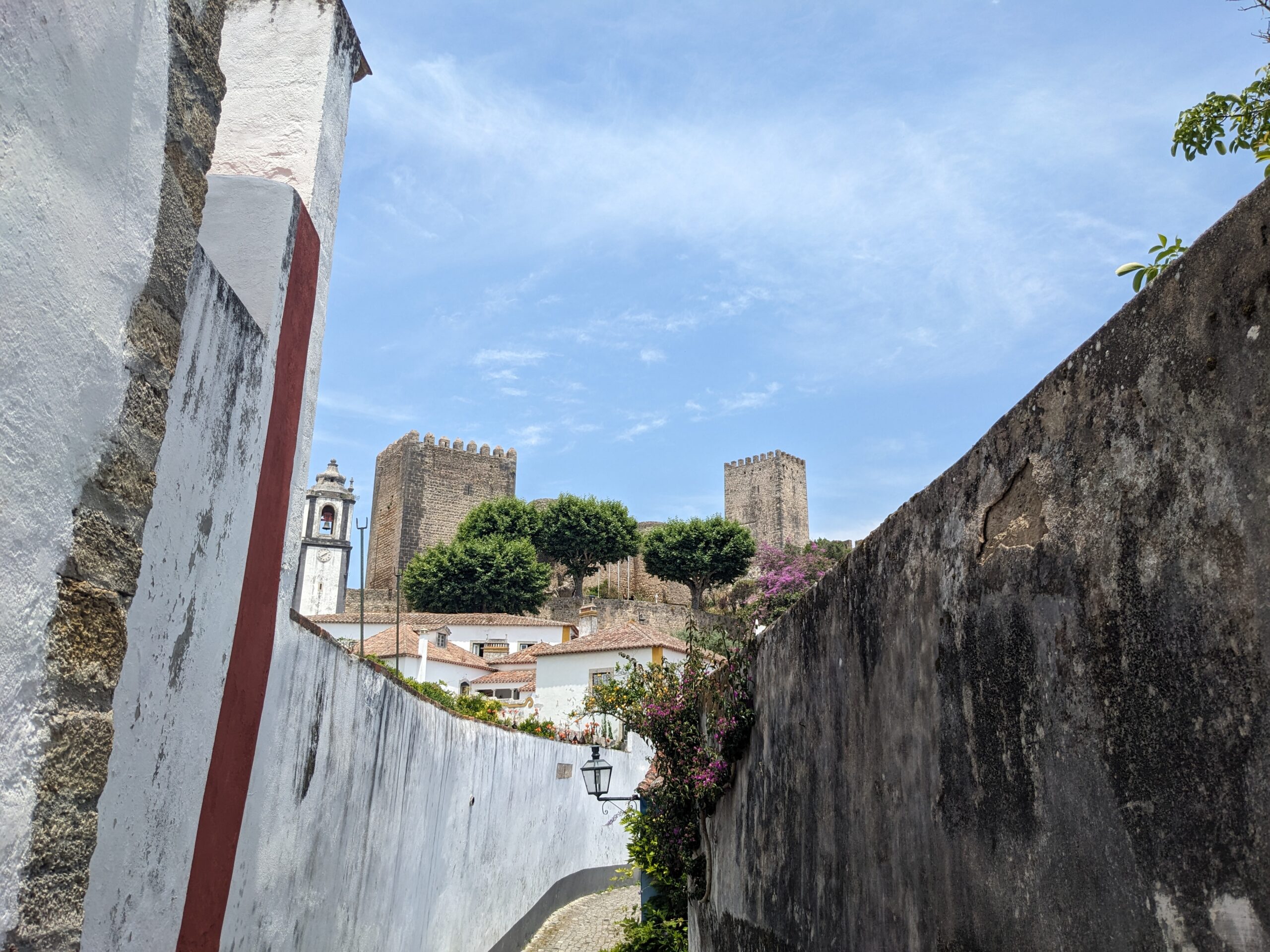 We had spent a couple of hours here and it was time to get back on the road. Several of the local people and tour guides we have met recommended that we stop in the city of Obidos to see the castle. The Castelo de Obidos is one of the best preserved medieval villages in Portugal. We plugged it in the GPS and were on our way. We found some parking on the street outside the castle wall and walked back to where we saw you could enter the castle village. Walking through the labyrinth of cobblestone streets and ended up in a square with a church and the castle in the background. This is exactly how I pictured a medieval village would be. We started to wander to look for somewhere for lunch, but ended up at the castle first. I pulled up the geocaching app and found one relatively close by. I got within 6 feet and couldn’t find it. I had a feeling it was on the other side of the wall, but it was roped off. I read other people’s logs and it sure did seem like it was pass the roped area. Tom encouraged me to go for it and I found it right away. After the geocache we went up some stairs to climb the castle wall. Although there are no guardrails, the path is quite wide. I was surprised when I turned around and saw it was now Tom that looked like he was a little scared. So far we’re batting a thousand for getting our adrenaline pumping. When we got off the wall we found a nice little place for lunch. We order a trio of toasts and lemonades. The toasts were perfect and since we were at a restaurant called Nata I figured that we should also get the pastel de natas. They were very good and I think better than the ones we had in Porto. The day was quickly slipping away so after lunch we agreed it was time to get back on the road.