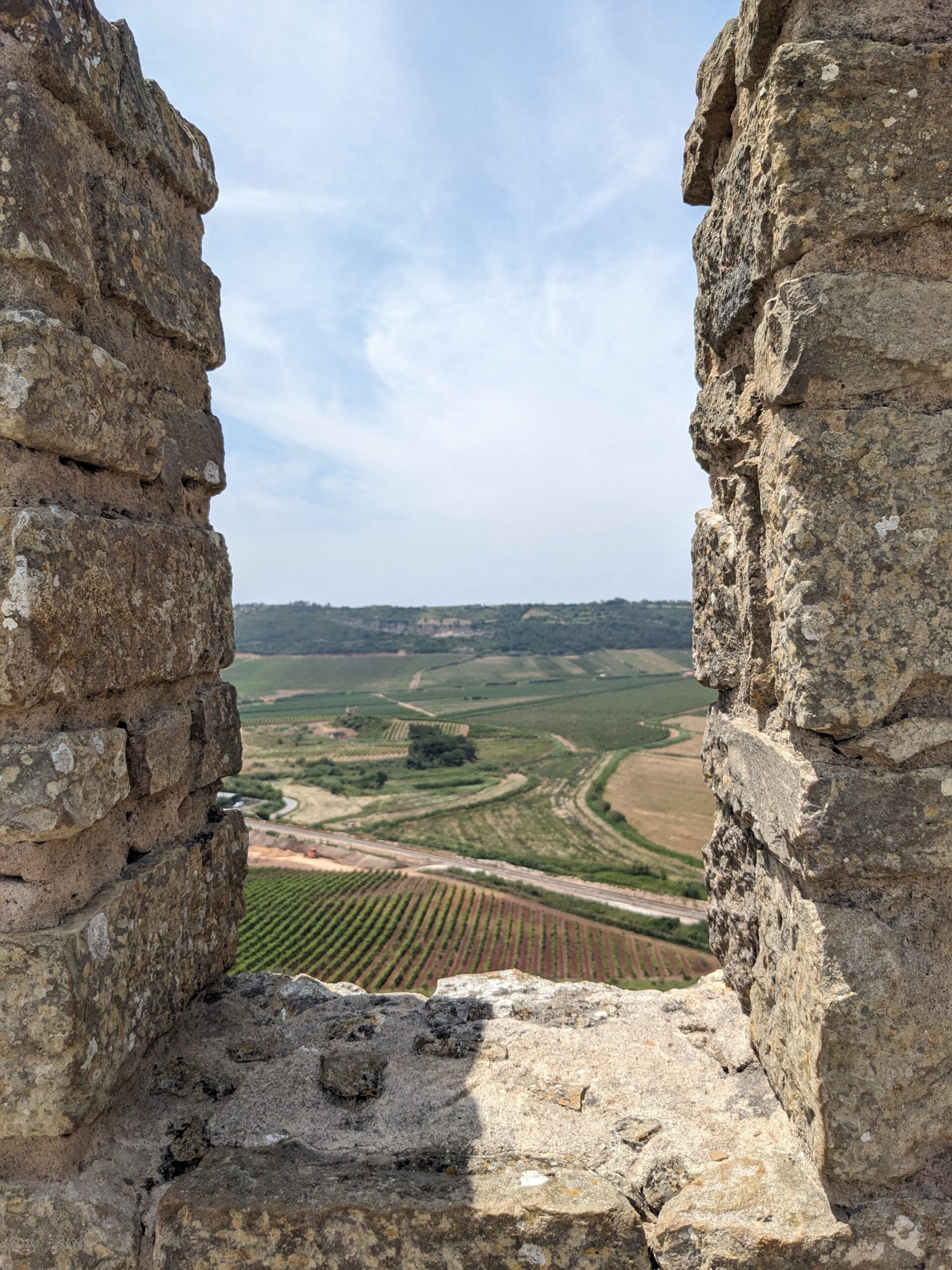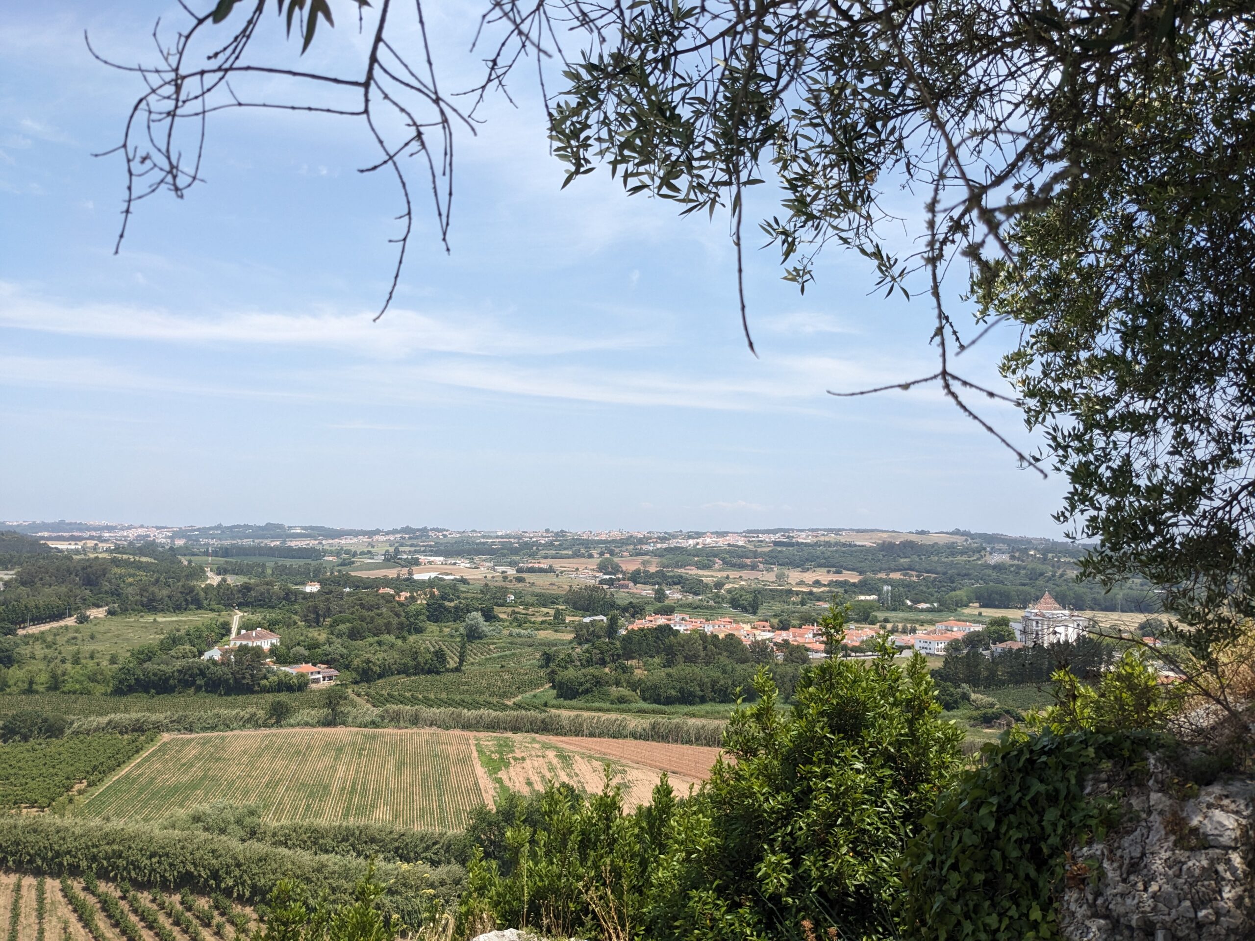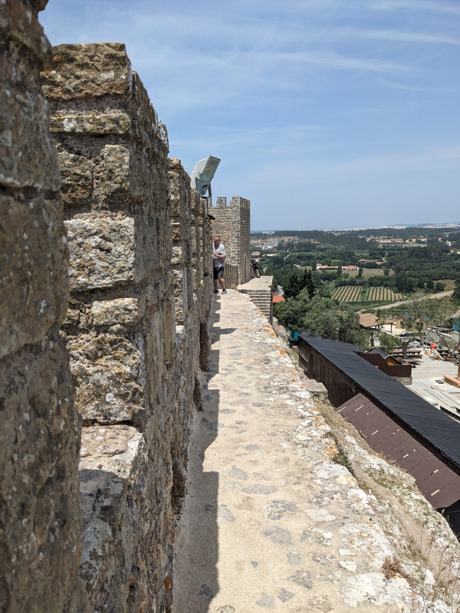 We had spent a couple of hours here and it was time to get back on the road. Several of the local people and tour guides we have met recommended that we stop in the city of Obidos to see the castle. The Castelo de Obidos is one of the best preserved medieval villages in Portugal. We plugged it in the GPS and were on our way. We found some parking on the street outside the castle wall and walked back to where we saw you could enter the castle village. Walking through the labyrinth of cobblestone streets and ended up in a square with a church and the castle in the background. This is exactly how I pictured a medieval village would be. We started to wander to look for somewhere for lunch, but ended up at the castle first. I pulled up the geocaching app and found one relatively close by. I got within 6 feet and couldn’t find it. I had a feeling it was on the other side of the wall, but it was roped off. I read other people’s logs and it sure did seem like it was pass the roped area. Tom encouraged me to go for it and I found it right away. After the geocache we went up some stairs to climb the castle wall. Although there are no guardrails, the path is quite wide. I was surprised when I turned around and saw it was now Tom that looked like he was a little scared. So far we’re batting a thousand for getting our adrenaline pumping. When we got off the wall we found a nice little place for lunch. We order a trio of toasts and lemonades. The toasts were perfect and since we were at a restaurant called Nata I figured that we should also get the pastel de natas. They were very good and I think better than the ones we had in Porto. The day was quickly slipping away so after lunch we agreed it was time to get back on the road.