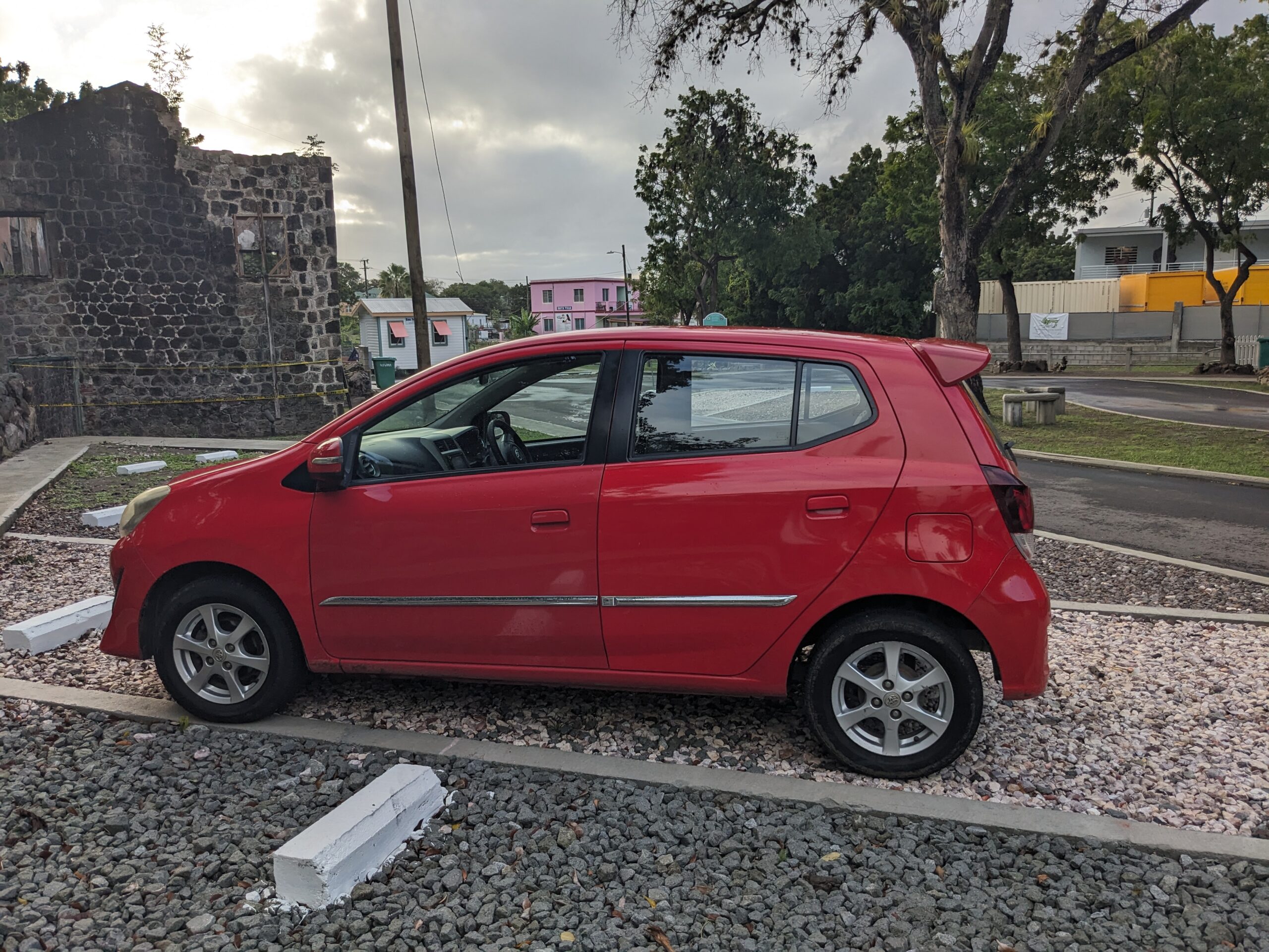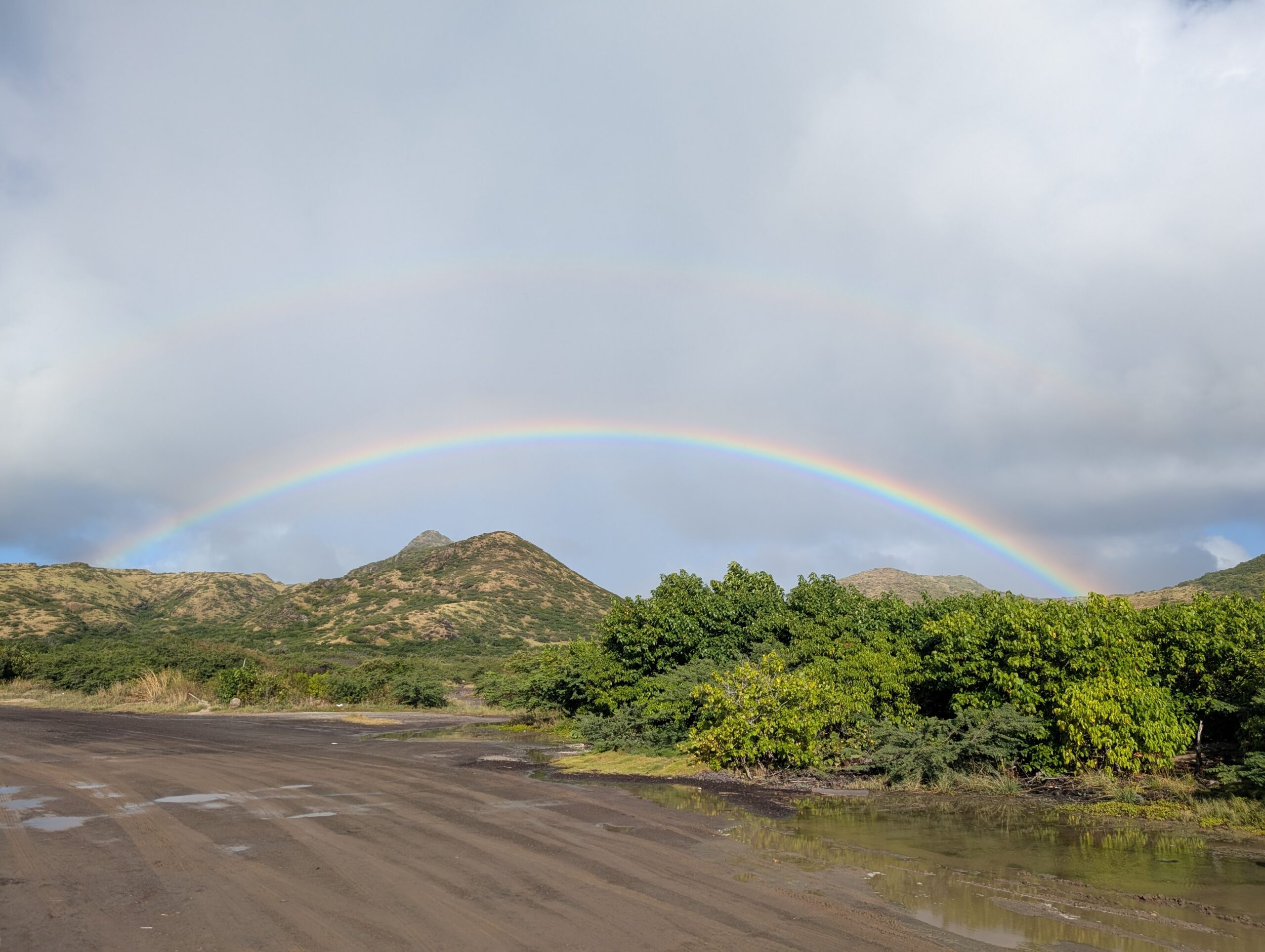 Today is the day we went Nevis. We had learned that Thrifty does an exchange program whereby we could take the water taxi to Nevis and then pick up another rental car on Nevis for no extra cost. We could have taken our rental car on the ferry, but the water taxi is faster and cheaper and it was super convenient. We timed our morning perfect and didn’t feel rushed. We pretty much parked and walked to the dock and right onto the boat. As we got out of the car we saw a really nice rainbow. We took the 9:00 water taxi from Reggae Beach and got to Nevis a quick 10 minutes later. Thrifty thought the taxi left at 9:15 and arrived at 9:30, so they said there would be someone waiting for us with the car at 9:30. At 9:28 the representative pulled up with a newer (and redder) version of the same car we have on St. Kitts.