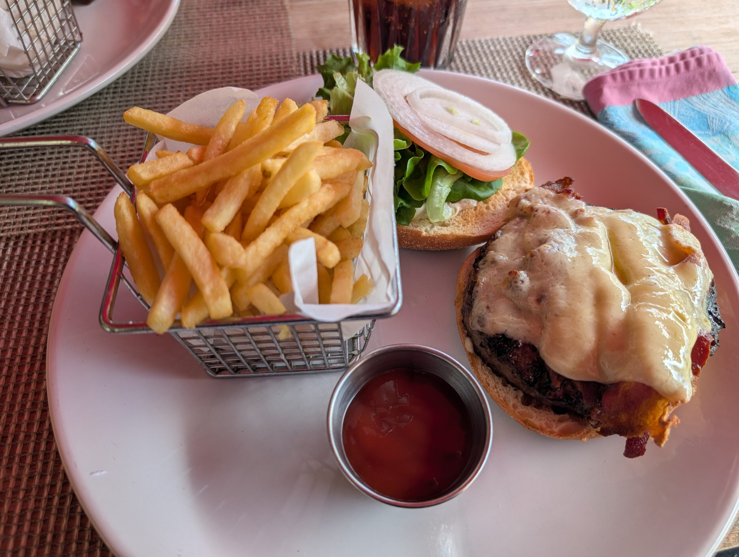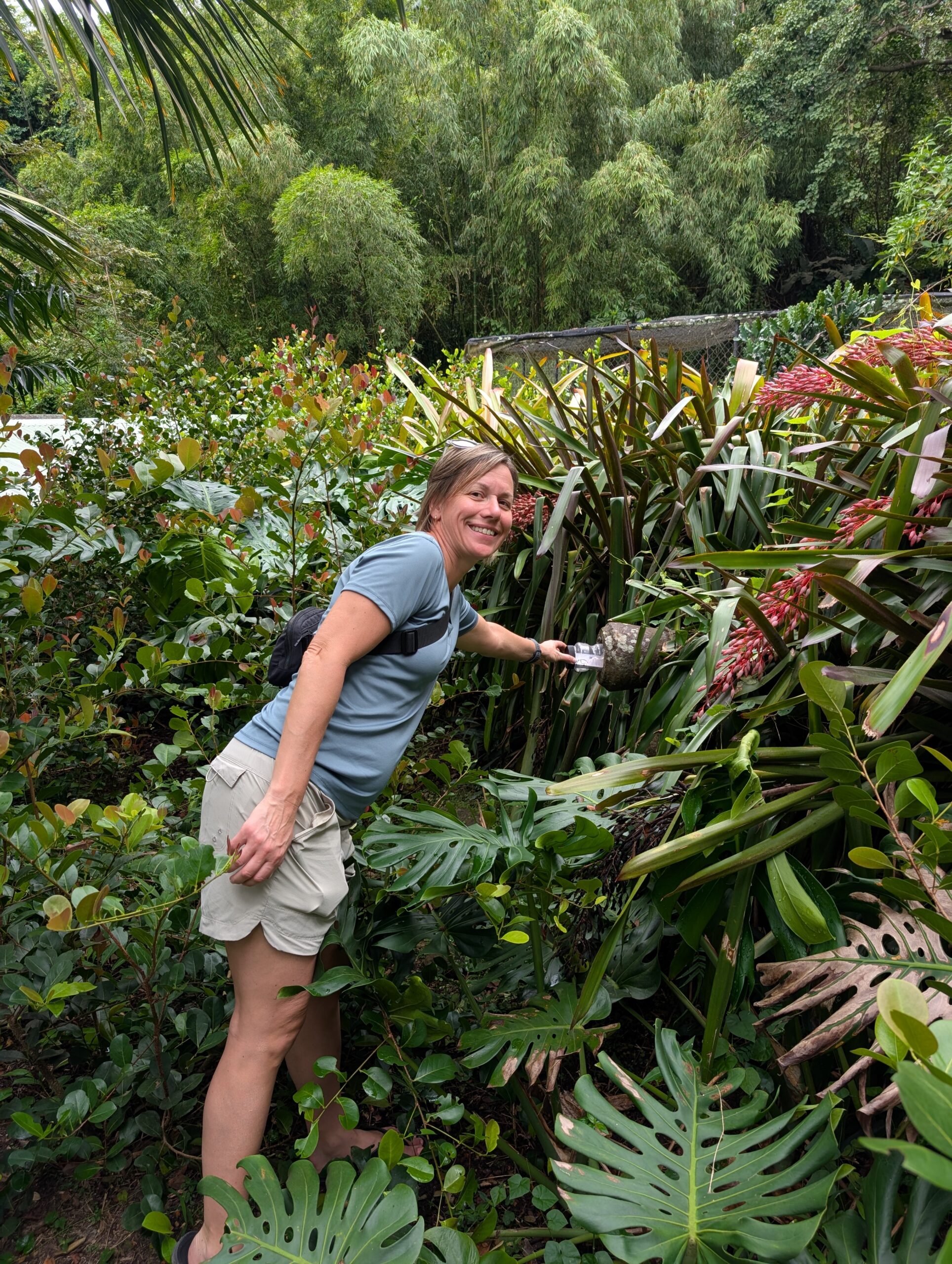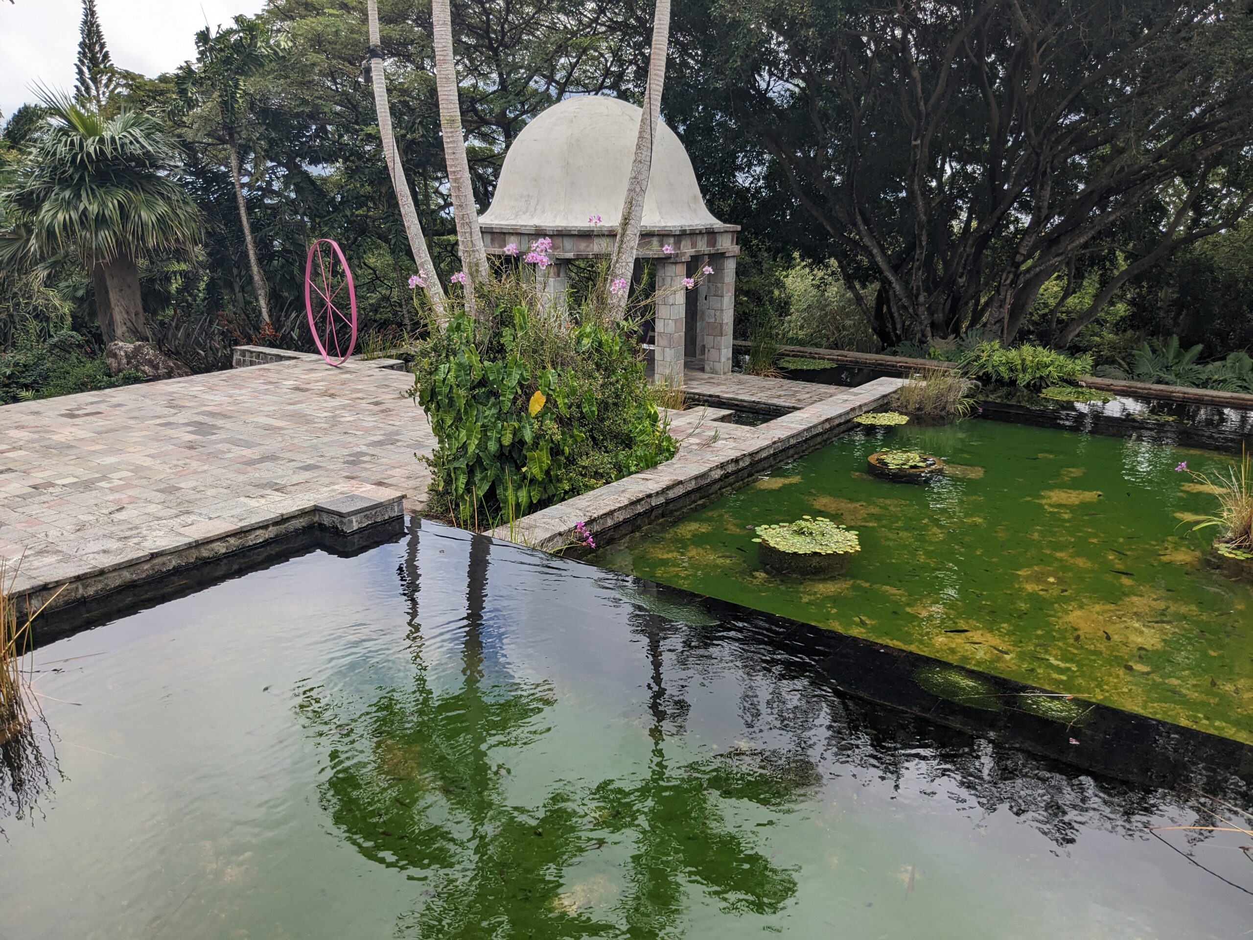 As we made our way around the island the next cache was at Golden Rock Estate. It was a cache hidden in the mouth of a cannon in which the cannon was barely visible amongst the plants. As we walked the grounds I realized there was a restaurant here that had been recommended to us. It was only 11:30 but we thought this would be an excellent place to have lunch. Tom enjoyed his burger and I had ribs that were also very good. The grounds were really pretty and Tom actually said he was glad that geocaching had brought us there.