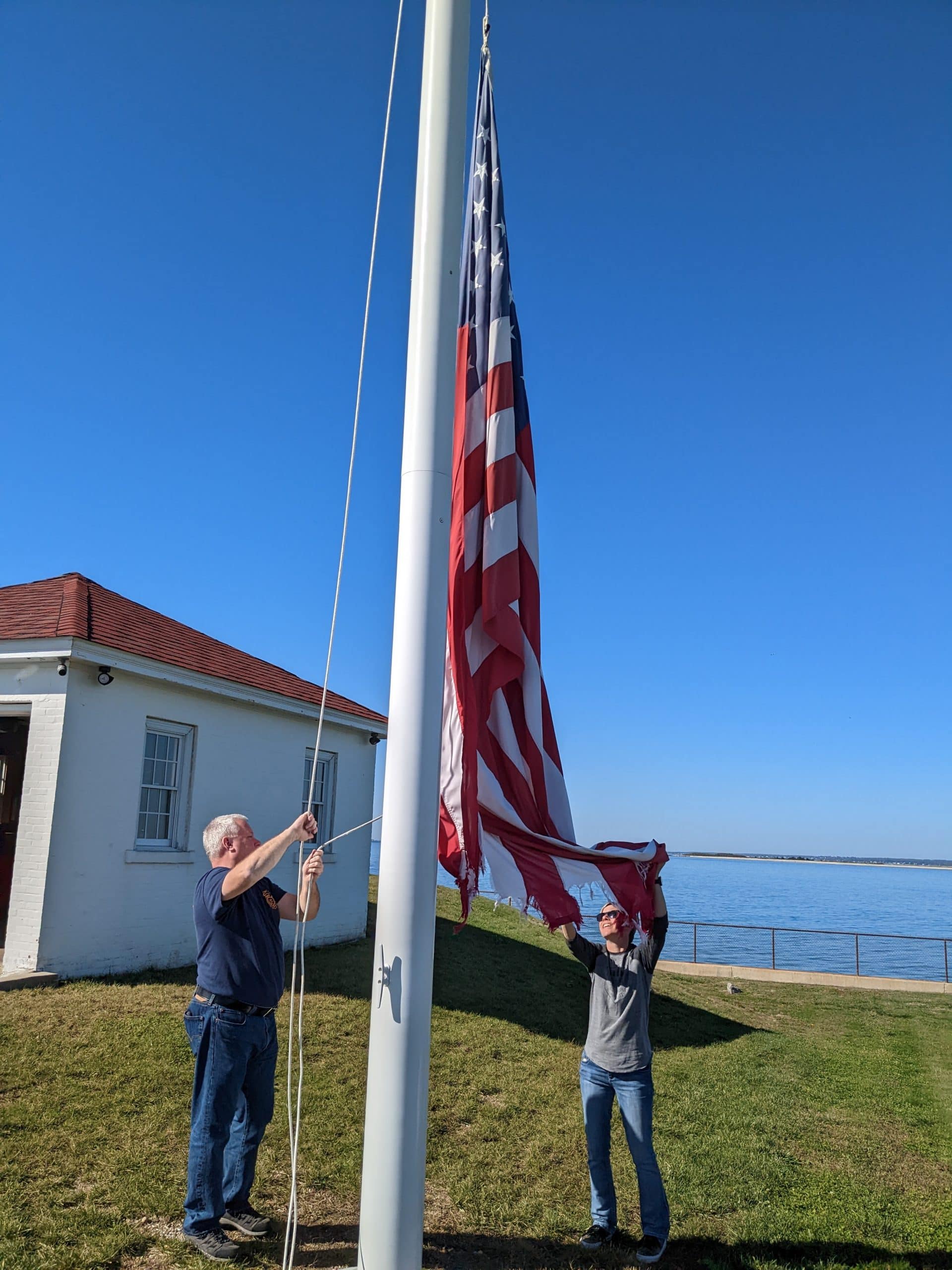 Our next stop was to the Watch Hill Lighthouse, but after missing where to go to get the lighthouse we stopped in the deserted town and I saw a geocache was nearby. I quickly made the find, relieved to mark Rhode Island off the list. I got on my phone and found that to get to the lighthouse we needed to park on the street and walk down a private road. Since it is off-season parking was not an issue and we started the walk past multi-million dollar homes. When we got close to the lighthouse I saw there was parking and we probably could have driven and parked there. There was a sign on the gate at the lighthouse that said private property, but there was a fireman at the flagpole lowering the flag that called out to us. He said he would make us a deal. If we would help remove the flag so it didn’t touch the ground he would let us walk around the lighthouse. I ran over and helped gather up the flag as he lowered it. When he got it free from the clips he thanked us because he doesn’t like it touching the ground. We said no problem and we completely understand as we are in the Air Force. We introduced ourselves and then stood and talked to him (Bob) for 20 minutes or so. We found that he was the caretaker of the lighthouse and lived on the property. He retired from the local fire department previous to this job. The big white house on the hill belongs to Taylor Swift, but she is hardly ever there. He did confirm that since this was off season we could have driven and parked down by the lighthouse because those rules are mostly in place during peak season when thousands of people are in town. It was a real nice conversation and meeting and talking to him made the trip to the lighthouse a highlight.