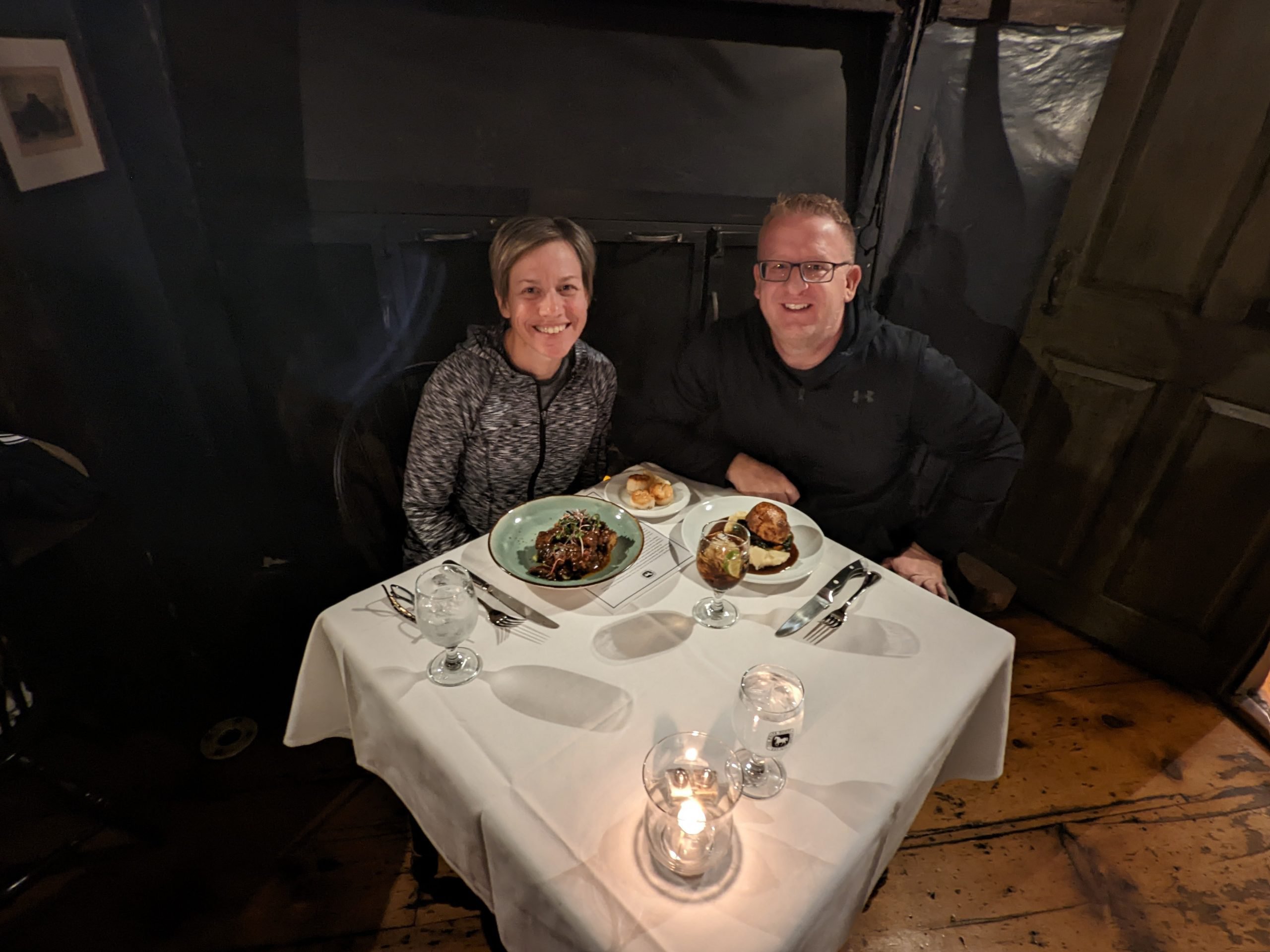 It was almost 6:00 when we made our way over to the White Horse Tavern (https://whitehorsenewport.com/) and we scored a parking spot kiddy corner from the restaurant. We had assumed there might be a long wait so we had already discussed how long we would be willing to wait. We were pleasantly surprised when the hostess told us that they were all booked for the evening, but they would be able to seat us right away at a table in the bar. Perfect!! Tom was overjoyed!! We sat down and found this was not your typical tavern food, however more of a fancy fine dining experience. Ok – we’re all in! We went for the appetizer of tempura fried squash blossoms stuffed with lobster meat; Tom a beef wellington, myself the beef short ribs with the add-on of scallops, and apple pie flavored bread pudding with vanilla gelato for dessert. The appetizer was good, but not worth the price we paid. Tom said the beef wellington wasn’t seasoned very well, but I thought my meal was excellent and dessert was very good as well. Overall an interesting dining experience and now we can say we’ve eaten at the oldest restaurant in America.