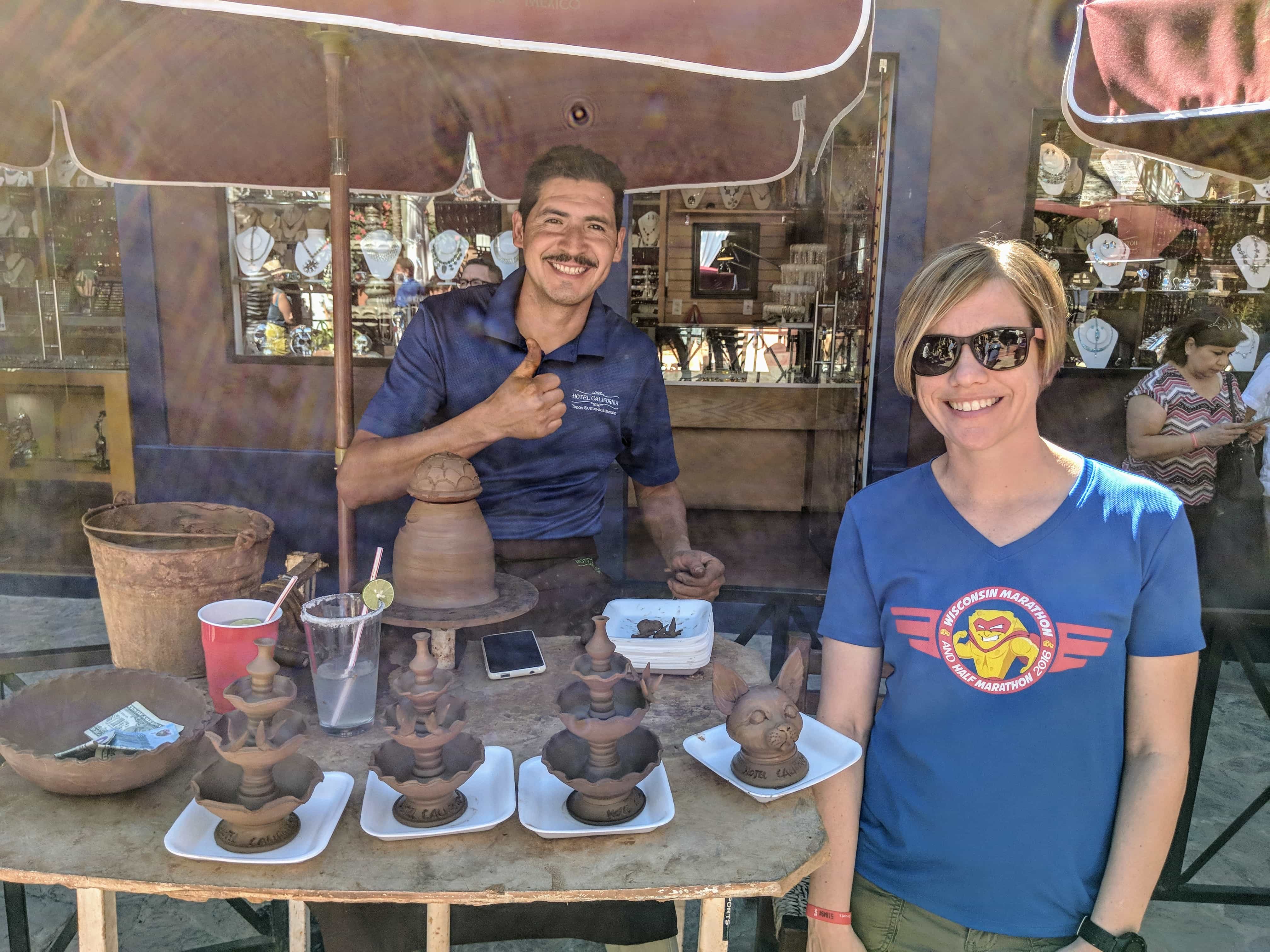 By this time is was Noon so any hopes of getting back for beach/pool time were long gone. We all piled into Carlos’ car (4 of us squished in the back) and made the hour our so drive to Todos Santos. Carlos took us to a few stores (probably friends of his) where we enjoyed browsing, but didn’t buy anything. The next stop was to the Hotel California where we watched an artist make a clay fountain in about 3 minutes. It was pretty impressive. Then Carlos had him make a cat for us and said if we liked it we could buy it, if not no big deal. Well I think the cat looked more like a chichua, so I wasn’t interested in it, but we did tip the artist for watching him and moved on. We next stopped into a homemade candy shop. We tried several free samples and paid entirely way too much money for some candy. We then asked Carlos to take us to a restaraunt where the locals eat. He took us to a tucked away restaraunt that served very good Mexican food. It’s probably the best meal we have eaten on the trip thus far and it was relatively inexpensive. After lunch he took us to the mission, city hall, and to a few more shops. He then asked us if we would like to roam on our own or if we were ready. I had noticed there was geocache close to where we parked the car, so I explained geocaching to Carlos and on the hunt we went. The coordinates took us to a park where it was super busy with kids playing and skateboarding. The hint eluded that the cache would be under a bench, but there were several benches and the GPS would not even come close to a ground zero. For some reason I could only get to within 50 feet. That is not super helfpul when you are looking for a bison tube in a packed park. We checked a couple of benches, but after reading the prior logs and seeing it hasn’t been found in a while I gave up. Too bad, I really would have like to shown Carlos what we were looking for. We crammed back into his car and he brought us back to our hotel. The time was now a little after 5:00.