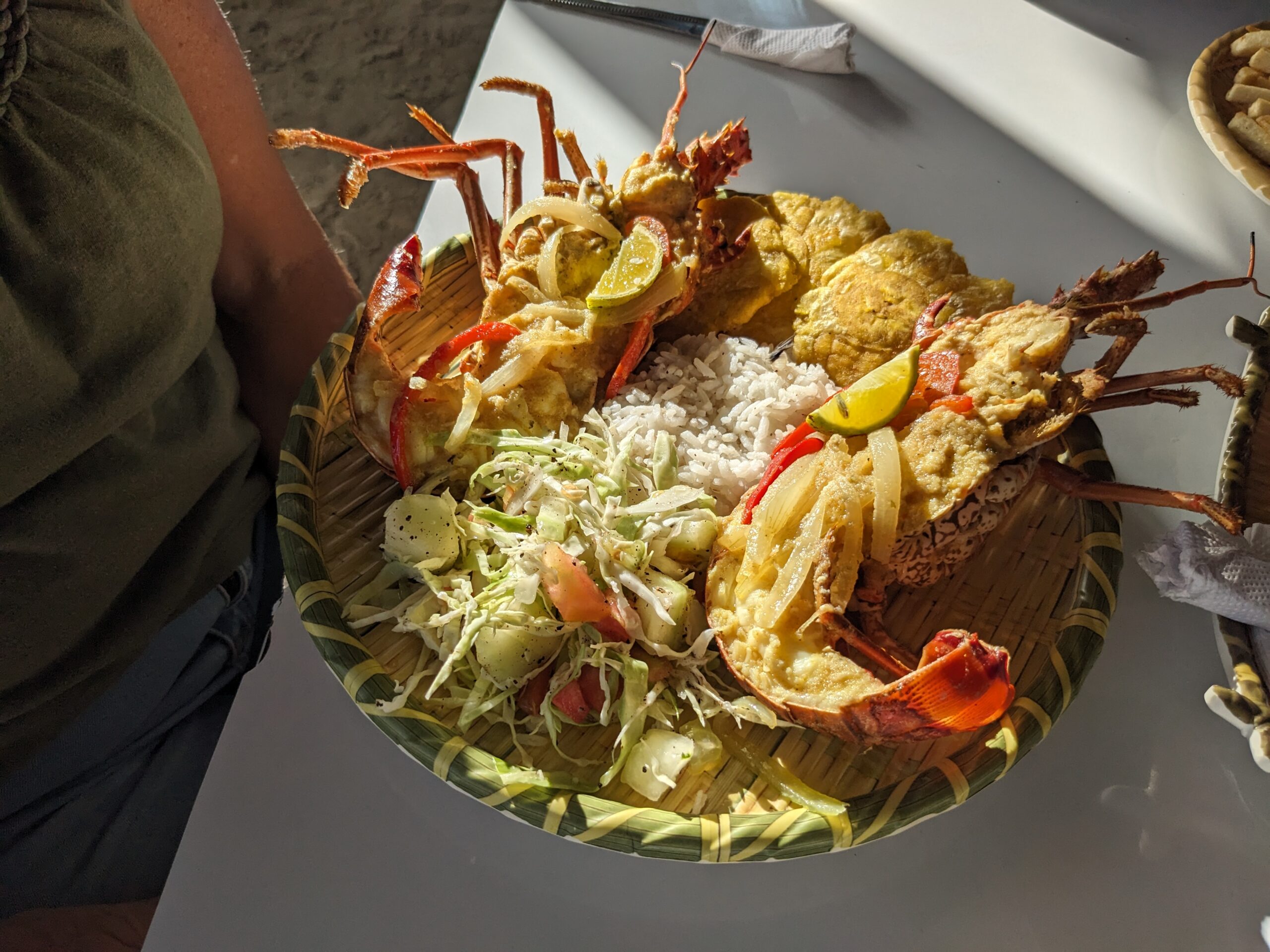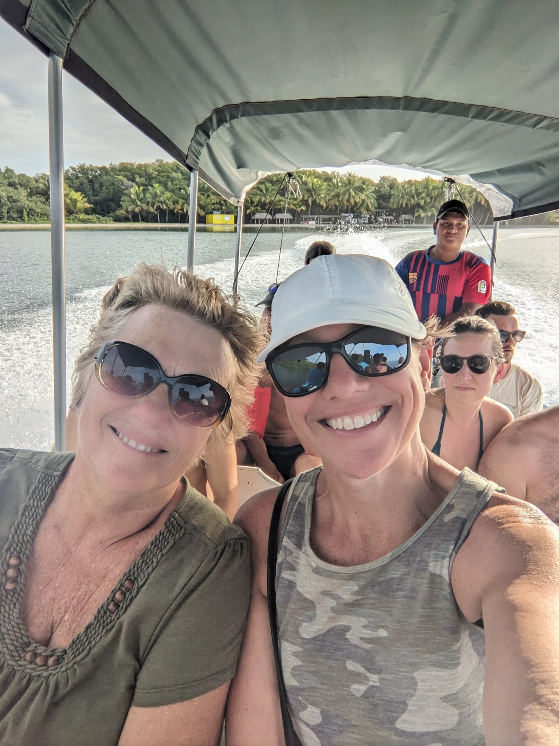 The water here was beautiful and we did see the starfish almost immediately upon arrival. There were a bunch of restaurants and stores along the beach and we walked a bit before we found an empty table to put our things. I walked a bit further and waded in the water to view the starfish before I walked back to swim with Pete and Laurie. Having our fill we got out of the water and picked one of the restaurants on the beach for dinner. I had an excellent fish filet. It was really good and this meal now ranks up in the top 3 of meals I had in Panama. Linda had a lobster (only $25) that was lounging in a cage in the ocean minutes before it was cooked. I had a few bites of that as well and it was really delicious! When dinner was over it was now after 5:00 and the beach was starting to empty. For $10/person we chose to take a water taxi back to Bocas Town. It was more expensive then the regular taxi, but we were paying for the experience and I’m not entirely too sure how easy it would have been to get a regular taxi at that time of night. We passed some really nice over the water homes, and even dropped a couple off at one of them. In town we walked a bit before we were finally able to hail a taxi to take us back to our house.