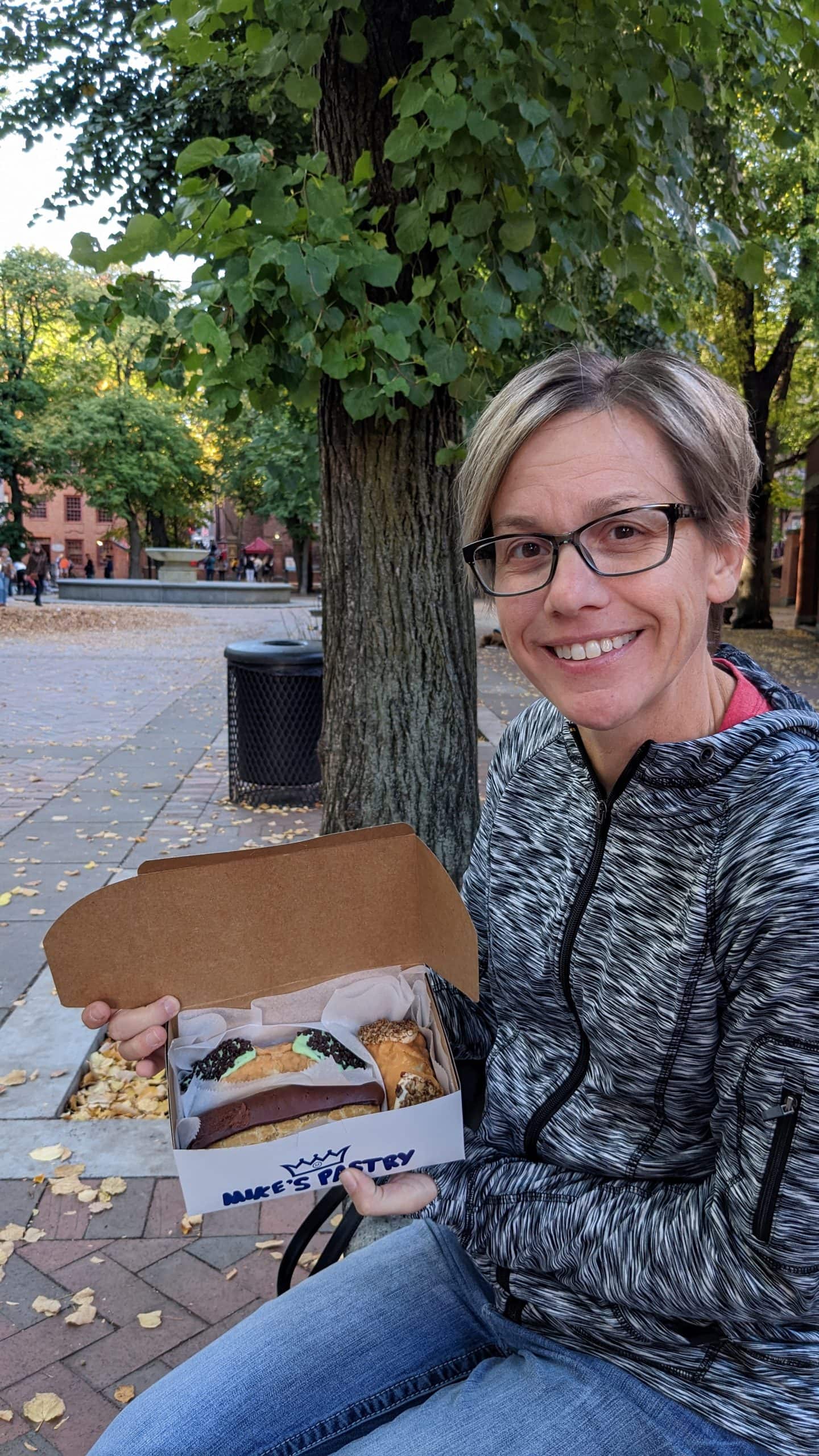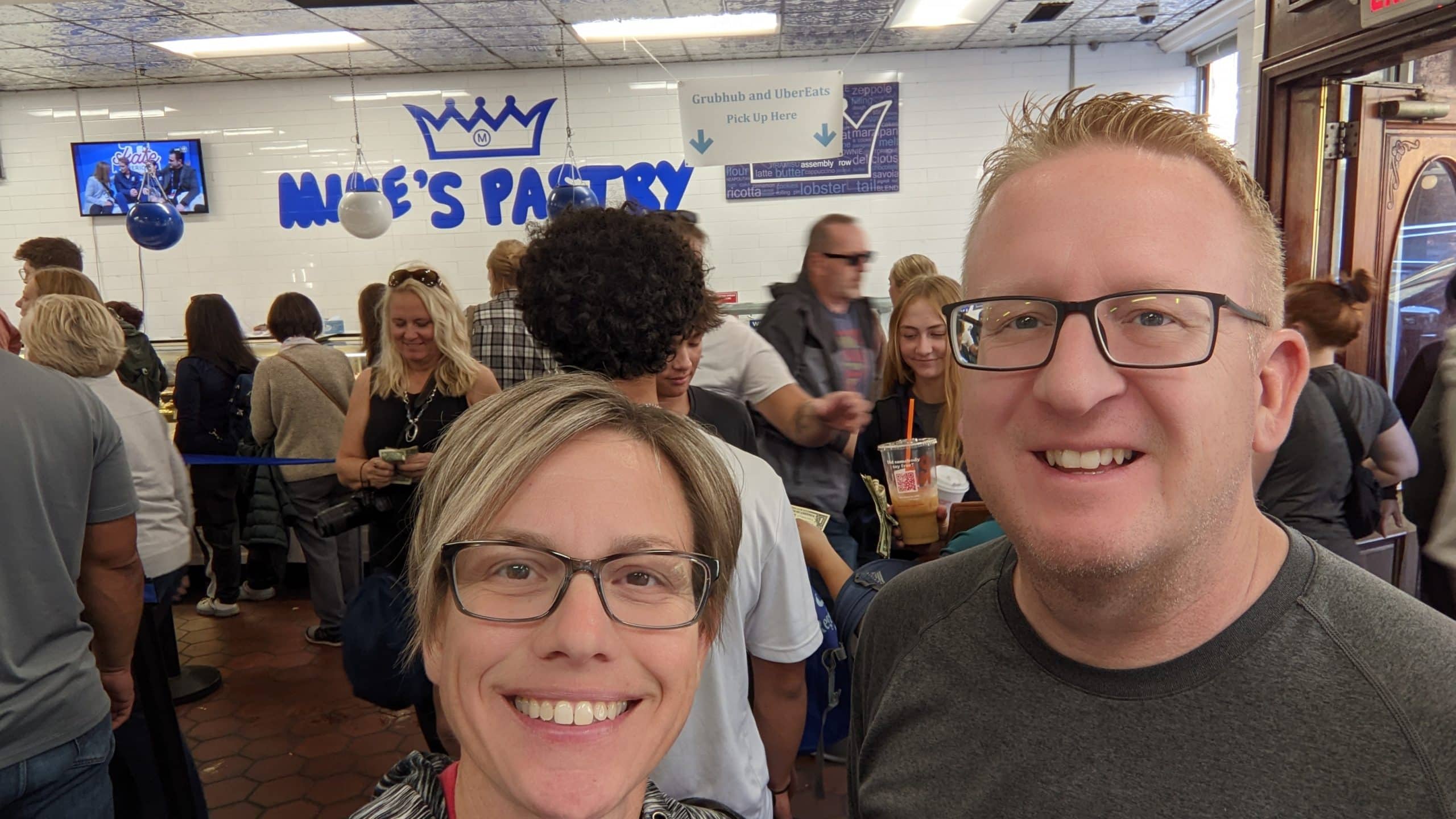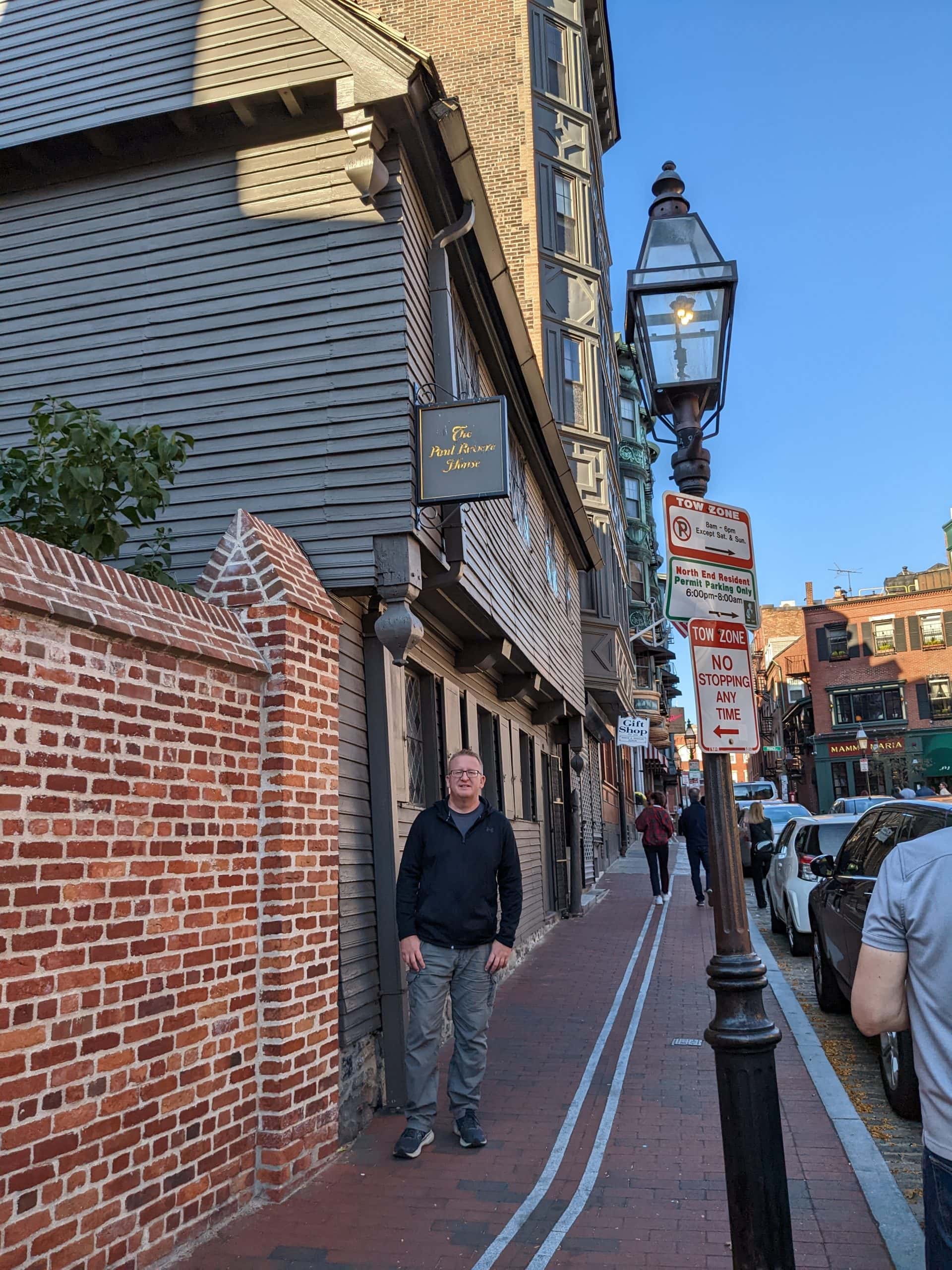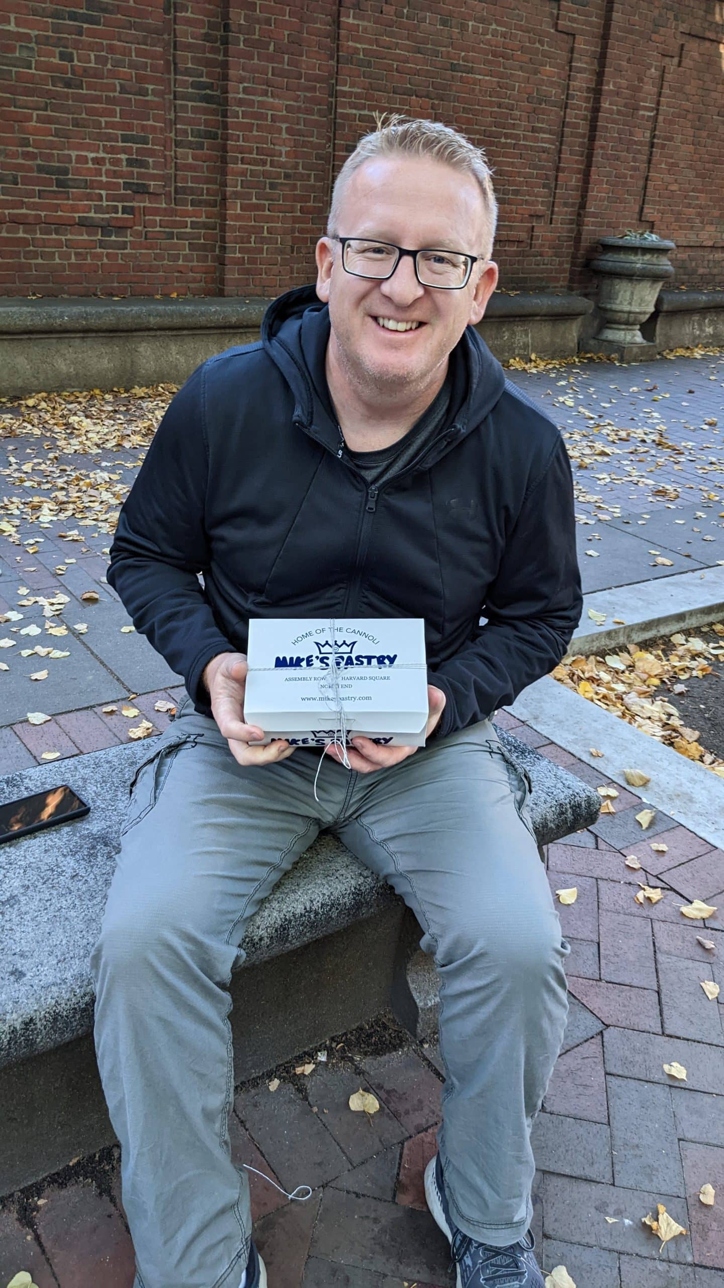 The next stop was the Paul Revere house which we also got in for free for being military. There was no photos allowed inside the house, but Tom was feeling rebellious and stealthily snuck a few photos. The most interesting fact about Paul Revere is that he had 16 children between two wives. Only 11 of the 16 kids made it to adulthood. In the park on the way to the Old North Church we noticed a bunch of boxes from Mike’s Pastry in the garbage. I had seen people carrying these boxes earlier in the day as well and was wondering what the deal with Mike’s Pastry was. At the Old North Church Tom asked someone carrying a box where Mike’s Pastry was and what was it. We found it was relatively close and their specialty was cannoli’s. It was at this point I also realized there were virtual geocaches along the Freedom Trail as I had not checked the app until we got to the Old North Church. I found the information I needed for the cache and Tom and I backtracked to Mike’s Pastry. The line to the counter was out-the-door and almost around the corner. I left Tom in line so I could back-track to Paul Revere’s house to get the information I needed for the virtual cache. It was only about a block away from Mike’s Pastry so I made it back to Tom before he even entered into the building. They had several different flavors of cannoli’s and I picked Mint Chocolate Chip and Tom got Caramel Pecan. The eclairs also looked good so we got one of those as well. We walked back to the park outside Old North Church to sit down and eat our cannoli. They were really good and worth the price and wait in line. I can see why they are such a popular destination.