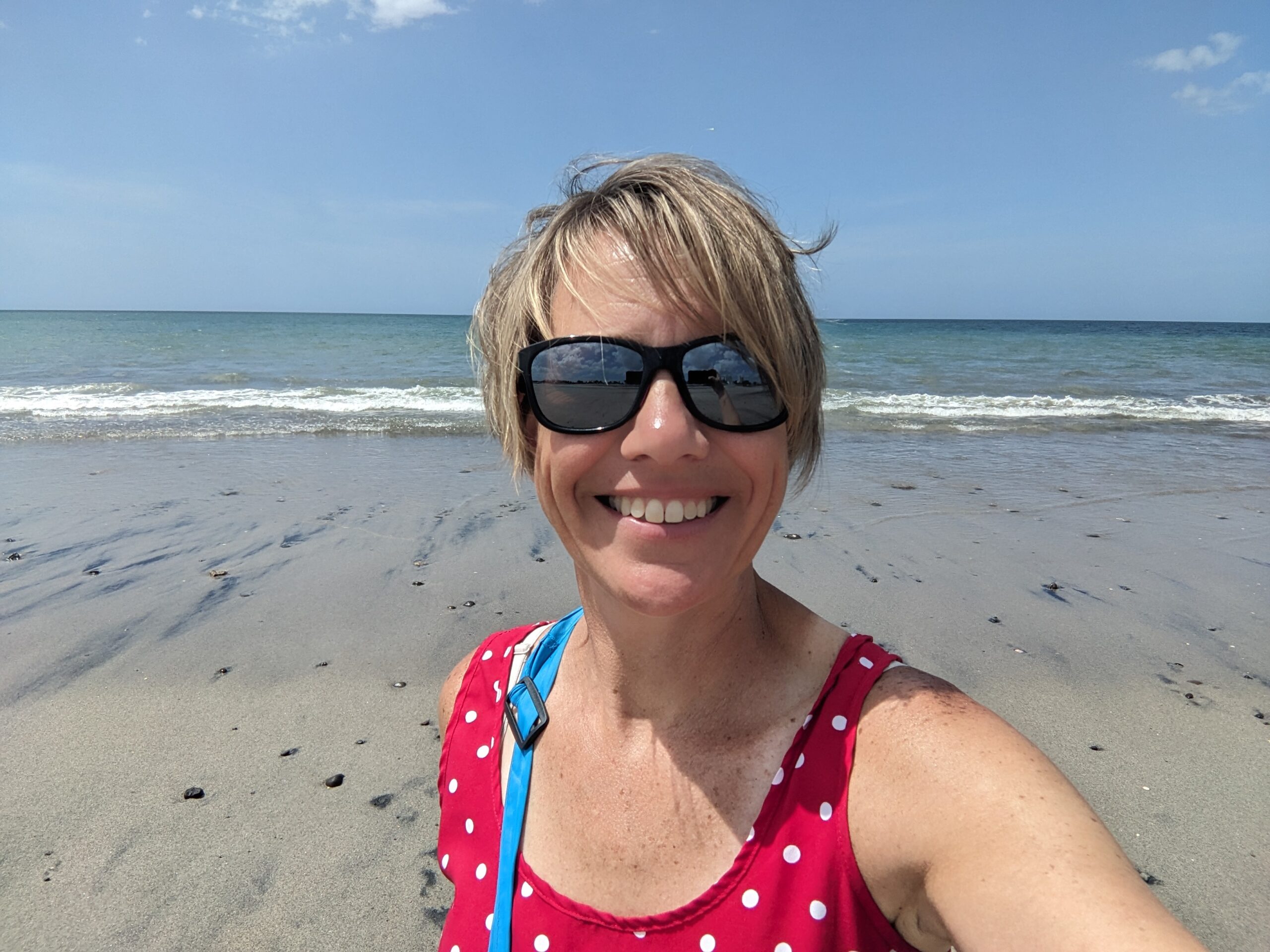 The GPS took us to the beach area, but not directly to a public access point. We drove just a little ways when Linda said to just turn down a road and see where it takes us. Luckily for us, it took us to a place where others had parked their cars and could access the beach. I grabbed the beach treasure collecting bag just in case there were treasures to be found, and off we went.