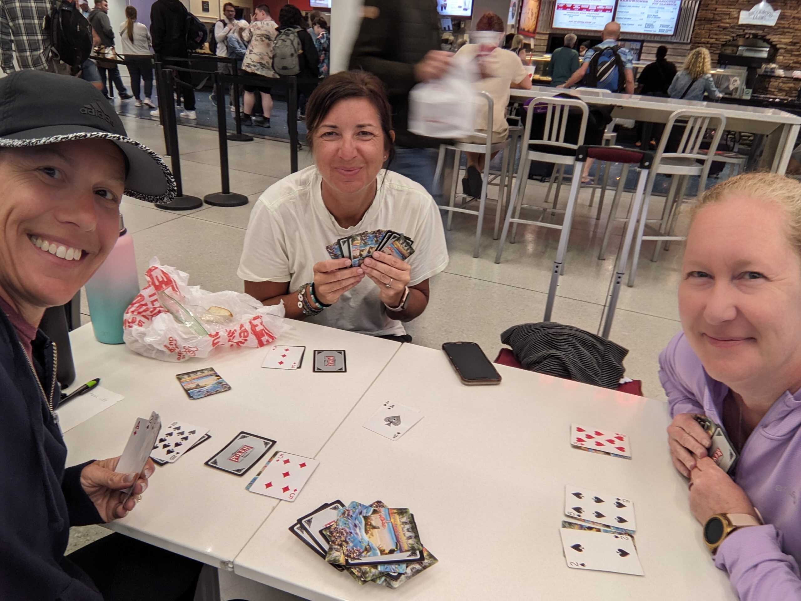 We had a couple of hour layover in Charlotte, so even after going through immigration and customs we still had about an hour before we needed to be to our gates. Unfortunately Amanda’s gate was in B and Erica and I were in A, but we were able to find a food court in the middle where we could sit and play a final game of Swoop before we had to go our separate ways. Erica and I ate the peanut butter and jelly sandwiches that Amanda made before we left the AirBnB (so we could use up the bread). Amanda having sat in first class had been served a meal of an Asian salad on the plane. I won the game of Swoop in 5 rounds with a score of 68 (Amanda lost with a 252), but we decided to just keep playing off our existing scores since we knew Amanda would be leaving for her gate soon. We were able to play 3 more rounds before Amanda’s alarm went off. Final scores: Jess 110, Erica 275, Amanda 314. We gave our hugs goodbye and went to our separate gates.