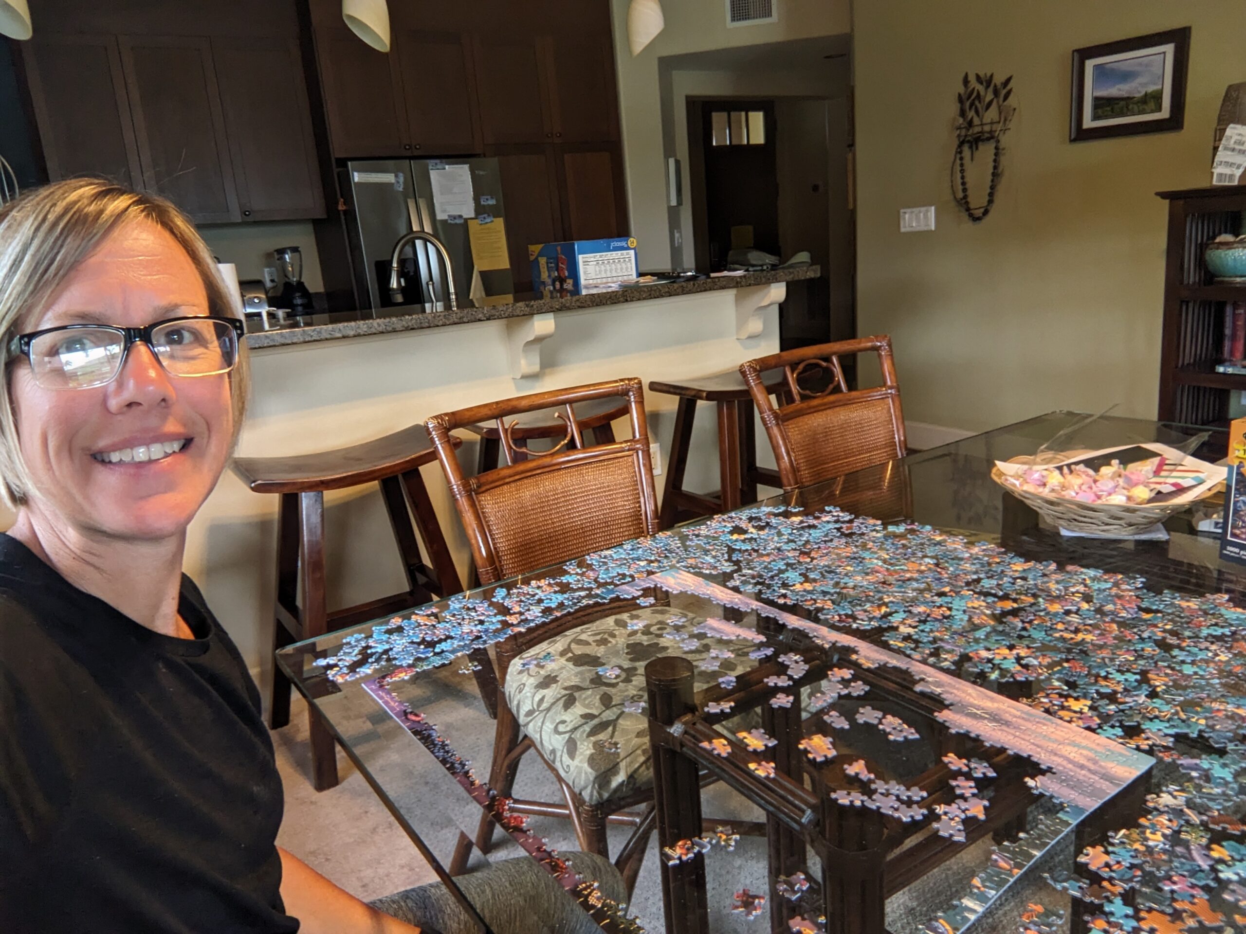 I had a good night’s sleep even though the wind was whipping with the storm. I woke up to find that Tropical Storm Hone had been upgraded to a Category 1 hurricane. I saw some palms had come down and a chair from our patio was tipped over, but other than the rain I didn’t see anything significant. Since it was raining pretty good we didn’t make any plans. After the morning news the Tennessee Titans and New Orleans Saints pre-season football game came on. At half-time Uncle Andy went to take a nap and I searched the condo to see if they had any jigsaw puzzles. I was very pleased to find a drawer in the bookshelf that had three to choose from. A 1000 piece puzzle is a perfect rainy day activity!