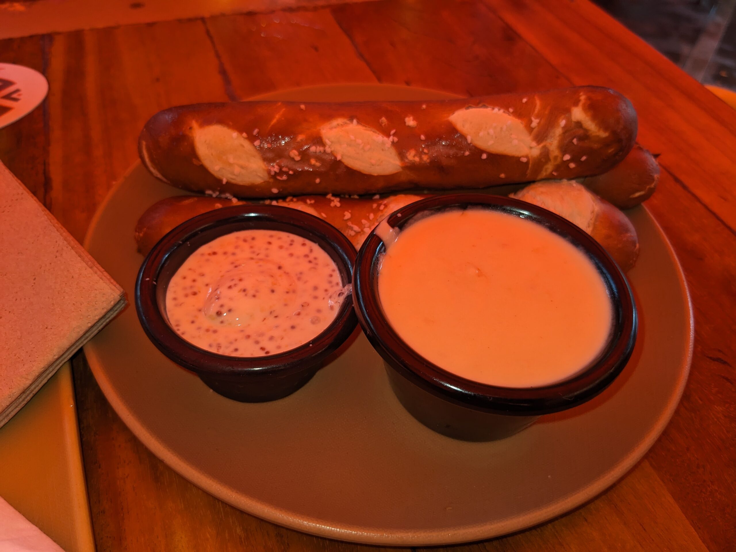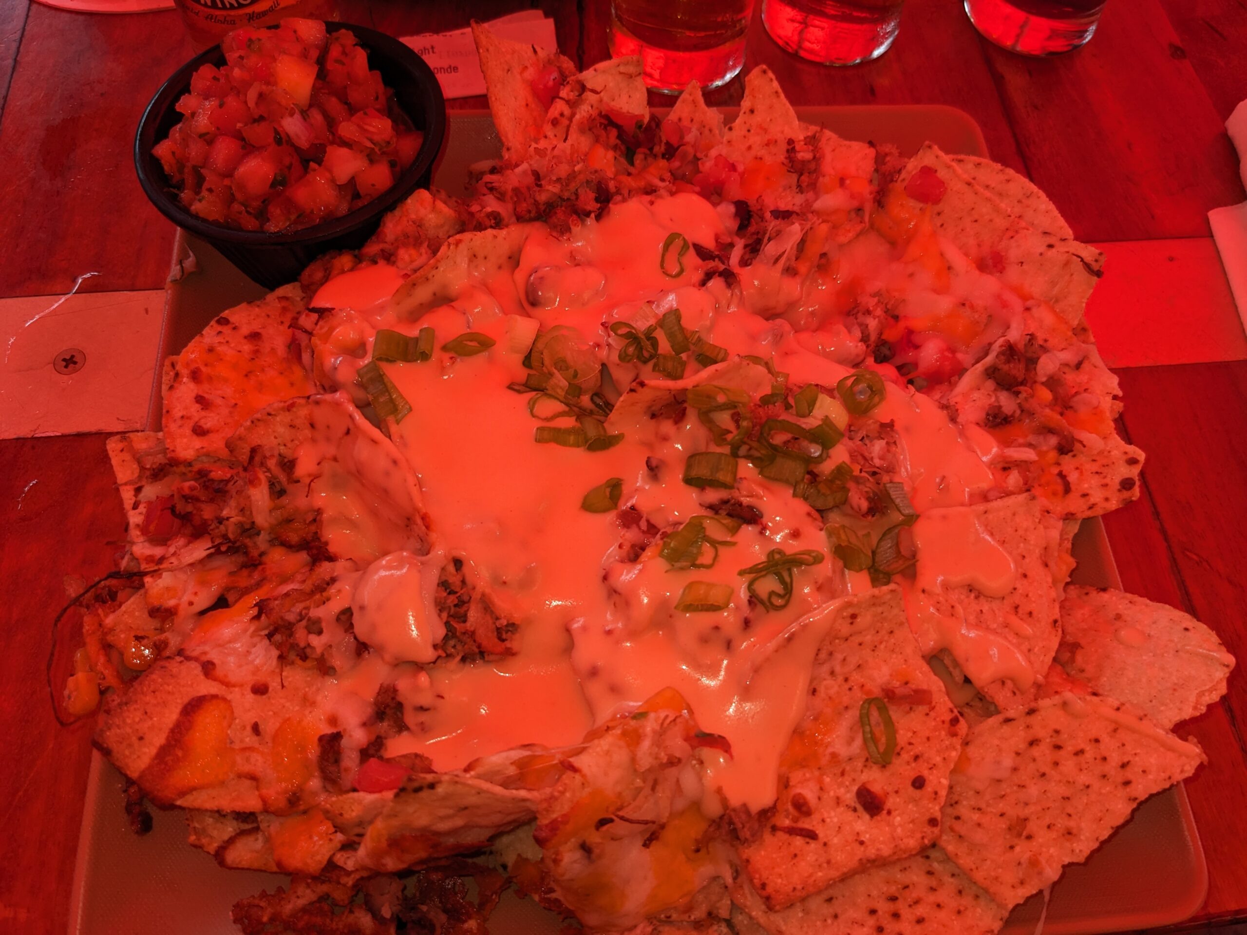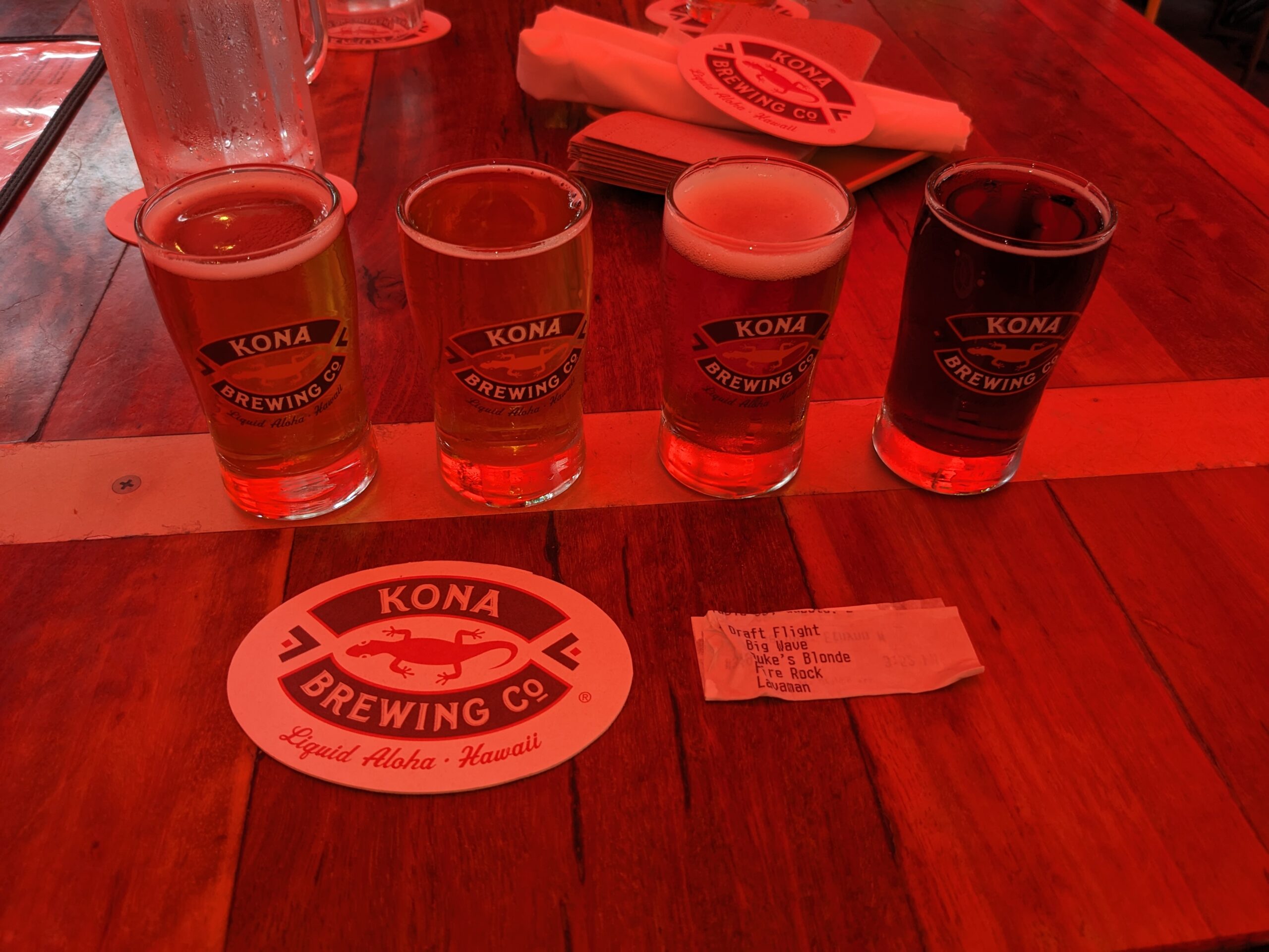 I made good progress on the puzzle and after the football game on I put on HGTV. After Uncle Andy and I watched a couple of episodes of Bargain Block we headed out to the Kona Brewing Company. I tried another flight of beer and had the kalua pork nachos. The nachos were very good as was the pretzel stick we had as an appetizer (we were sitting out side under a red umbrella which is why the pictures all have a red tint). I liked several of the Kona Brewing shirts they had for sale and after hemming and hawing finally picked one. It’s not one of the beers I like (it’s a porter) but I liked the design of the shirt. As we were walking back to the car I mentioned the long-sleeve shirt that I was carrying was from Great Lakes Brewery but that I had picked it up at Goodwill. That sparked an idea that I should check the Goodwill in Kona for any shirts that I could turn into a souvenir. The Goodwill was less than a mile away so we headed right there. Although I found a couple of shirts I liked (not Kona Brewing shirts), when I tried them on they didn’t fit quite right so I walked out empty handed.