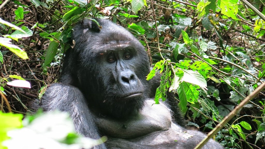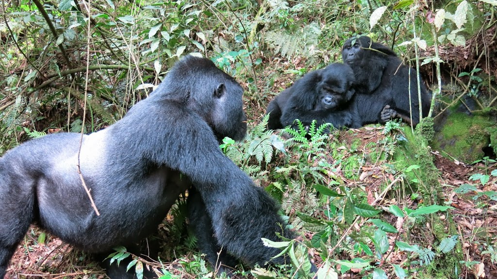 looked down I exclaimed “Whose poop is this?” Our guide informed us, it was in fact the gorilla’s poop and we had found their nests from the night before. Gorillas make a new nest every night and then poop there the next day before they leave so nobody else will use it. We were getting closer!!! When we finally met up with our trackers we put down our bags and walking sticks and move a very short distance where I got my first glimpse of the Silverback gorrilla! Nothing short of amazing!! I can’t believe how close we were and how much the gorilla didn’t seem to mind. He was busy stuffing his face with leaves and would glance over to us from time to time. As he moved, we moved with him. At one point he got up and climbed a short distance up a tree. He was so close to some of the people in our group I was afraid he might lose his balance and land on them! After spending several minutes watching him and taking pictures and videos we moved on to find other members of his family. They were