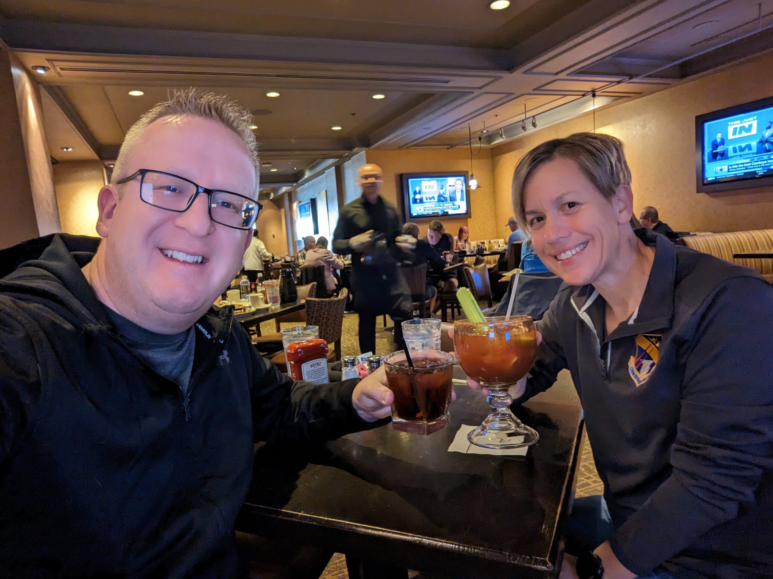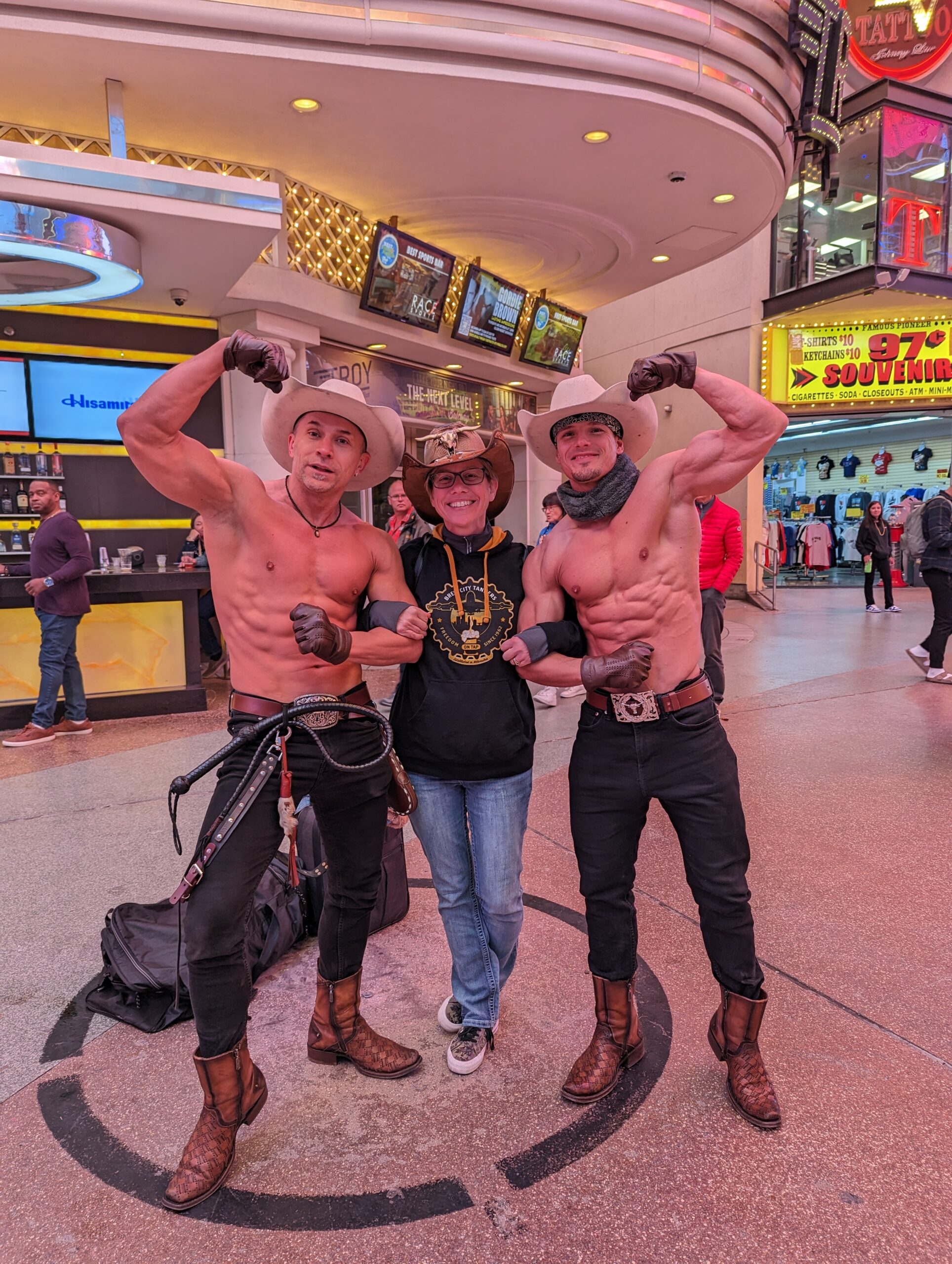 We set no alarms on this trip and were happy to take our time and relax. With having made no plans other than the show which was on Saturday at 10:00p.m., we could afford to relax and play everything by ear. Since it was Veteran’s Day I did a quick search of what restaurants near us may be offering a deal. I found that Claim Jumper’s had a Veteran’s Day menu for a free meal with choices that sounded pretty good, and the fact that it was in our hotel was even better. We made our way downstairs and stood in a short line to get a table. When we were seated I asked for the Veteran’s Day menu, but the host told us that they weren’t doing that but were offering a 15% discount. A little disappointed, but being super hungry we were going to stay and eat and appreciate the discount. I got a ginormous Bloody Mary and Tom a Captain and Coke along with a burger for me and (no surprise here) a turkey club sandwich for Tom. While we were waiting for our food I got a text from one of the hockey players that they were on Fremont Street hanging out at Whiskey Licker Up. When we were done with our meal we wondered outside and easily found the bar and the guys. We hung out with them for the next several hours drinking beers, shooting the shit, and people watching. Tom also donated $5 to a couple of the “solicitors” on the street so I could get my picture with them (see photos below). The hockey schedule didn’t originally have them playing a game on Friday thereby designating Friday as “F-off Friday”, but as we were hanging out they got a text that said they had a game at 6:30 in Henderson, NV. I was hoping to catch one of their games while we were there, but the timing and location never really worked out for us. Sometime around 5:00 we said our good-bye and went our separate ways.