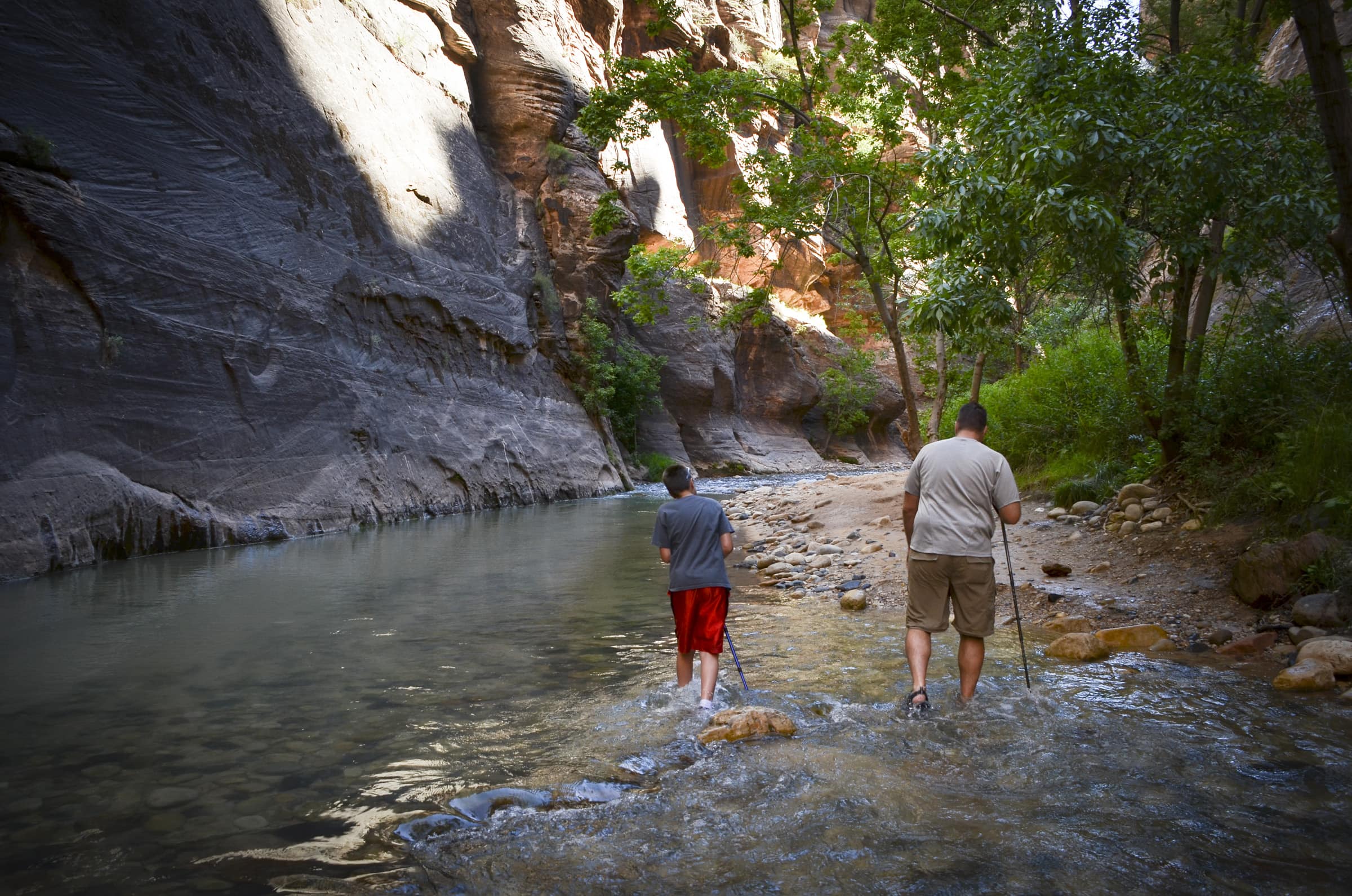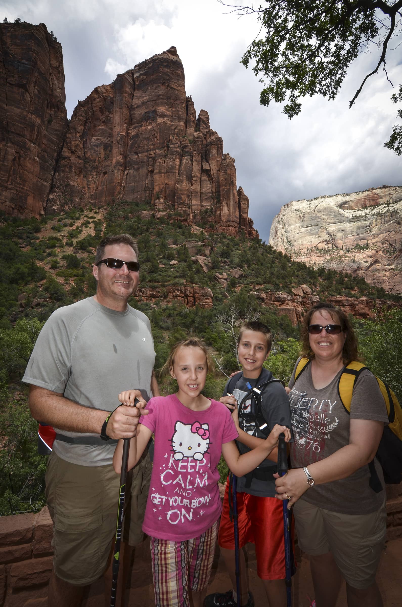 The final park and leg of our vacation is Zion National Park. We were out the door around 7:30a.m. and with a short 5 minute drive (and about the same amount of wait to get into the park) we were parked at the visitor’s center and ready to hop the internal park shuttle. We took the shuttle to the farthest stop of the park so we could hike the mile long Riverwalk trail to the entrance of the Narrows. The hike was an easy paved hike along the Virgin River. We weren’t planning on hiking the several more miles of the Narrows, but thought we would at least see the entrance of it. What we didn’t know about the Narrows is that the hike is through the cold waters of the river and that at the end of the Riverwalk trail we couldn’t go any further unless we walked through the water. Unfortunately we had not come prepared for this and I did not want to walk through it in my tennis shoes and socks and then be stuck with wet feet the rest of the day. SOB_2038Tom W. was wearingclosed toe sandals that were appropriate for the hike and Sean begged and begged to do it in his socks and tennis shoes. After some debate, it was decided that the boys would make the hike and the girls would hang back. Beth had fun playing on the shores of the river bank, but after a bit she got the “nature calls” feeling, so her and I headed back to the start of the trail to visit the restrooms. Beth and I only waited a short amount of time before we were rejoined by the rest of the family. My Tom said he didn’t actually go very far because the water got deep and he had his wallet and cellphone in his pockets, and of course the camera. Tom W and Sean went a bit further, but after looking at their pictures doesn’t appear that they got to the iconic Narrows spot. We all said we would like to go back, and with having the right equipment, do the hike of the Narrows.